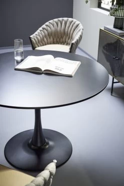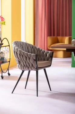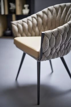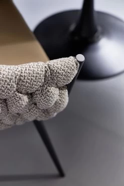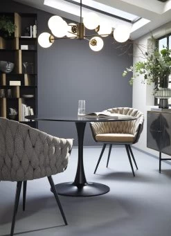 - Besonders charmant wirkt das sanfte Grau und Beige des Polsterstuhls in Kombination mit mattem Schwarz