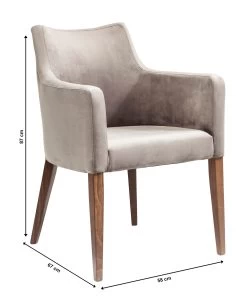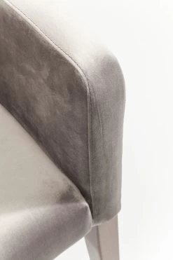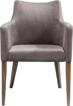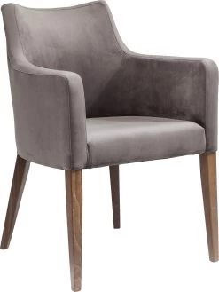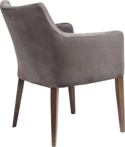 - Komfortabler, grauer Polsterstuhl in schimmernder Samt-Optik mit Armlehnen sowie braun lackierten Beinen aus massivem Buchenholz