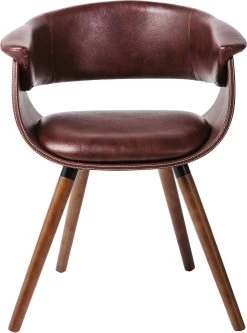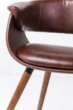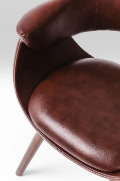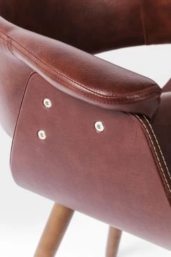 - Armlehn-Stuhl in Nougat-Braun mit Bezug im Vintage-Leder-Look, weißen Kontrastnähten und schlanken Beinen aus lackiertem Buchen-Massivholz