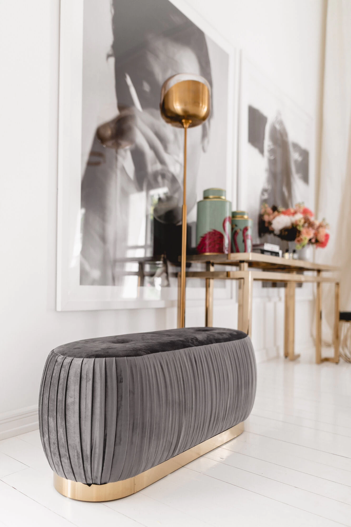 - Der aufwendig gefaltete Bezug mit Knopfheftung auf der Sitzfläche unterstreicht den Glamour dieser Sitzbank