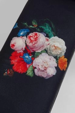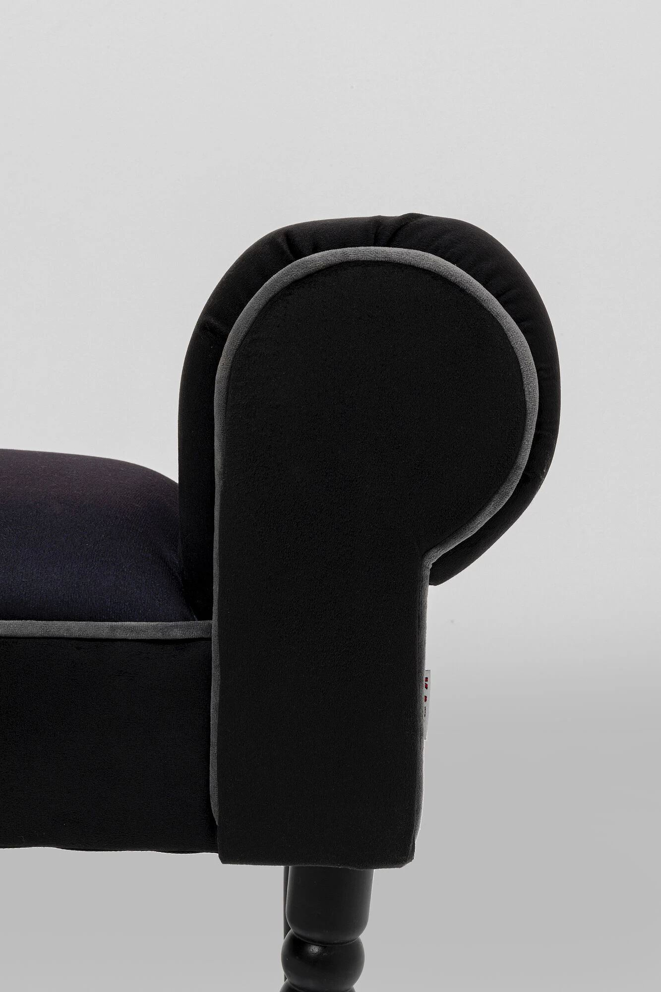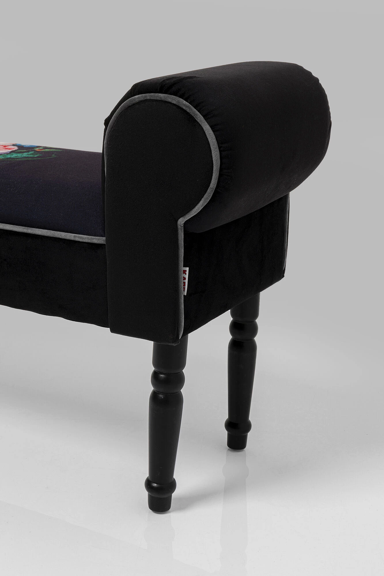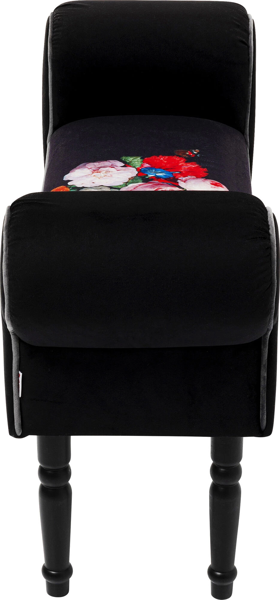 - Kleine, gepolsterte Sitzbank mit schwarzem Bezug in Samtoptik und Blumenmotiv