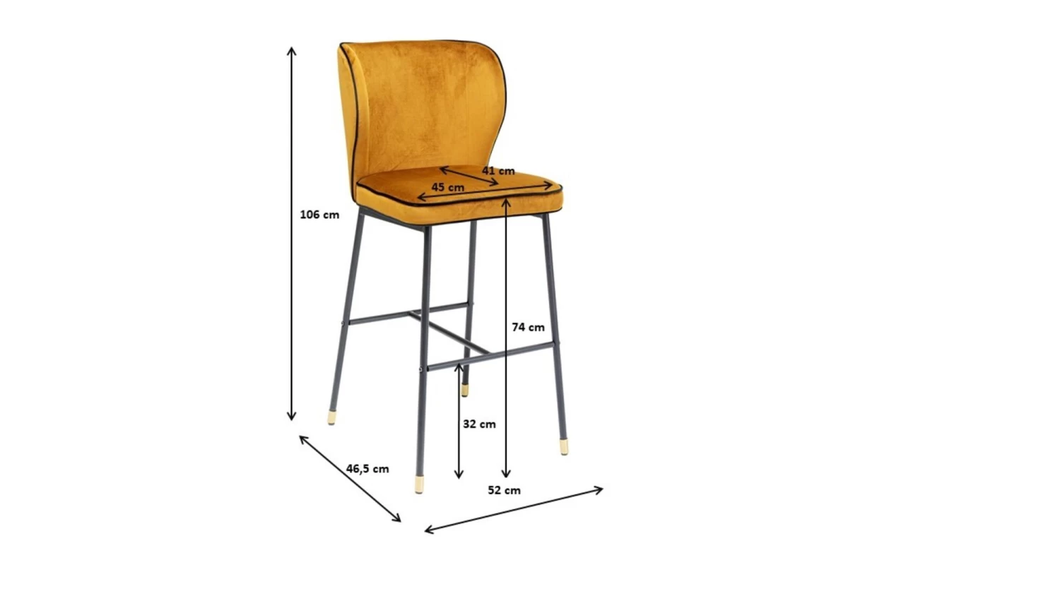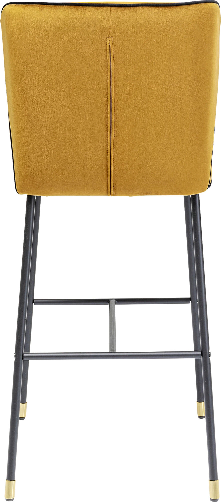 - Gepolsterter Barhocker mit einem samtigen Bezug in Goldgelb und einem schwarzen Gestell mit messingfarbenen Manschetten an den FĂĽĂźen
