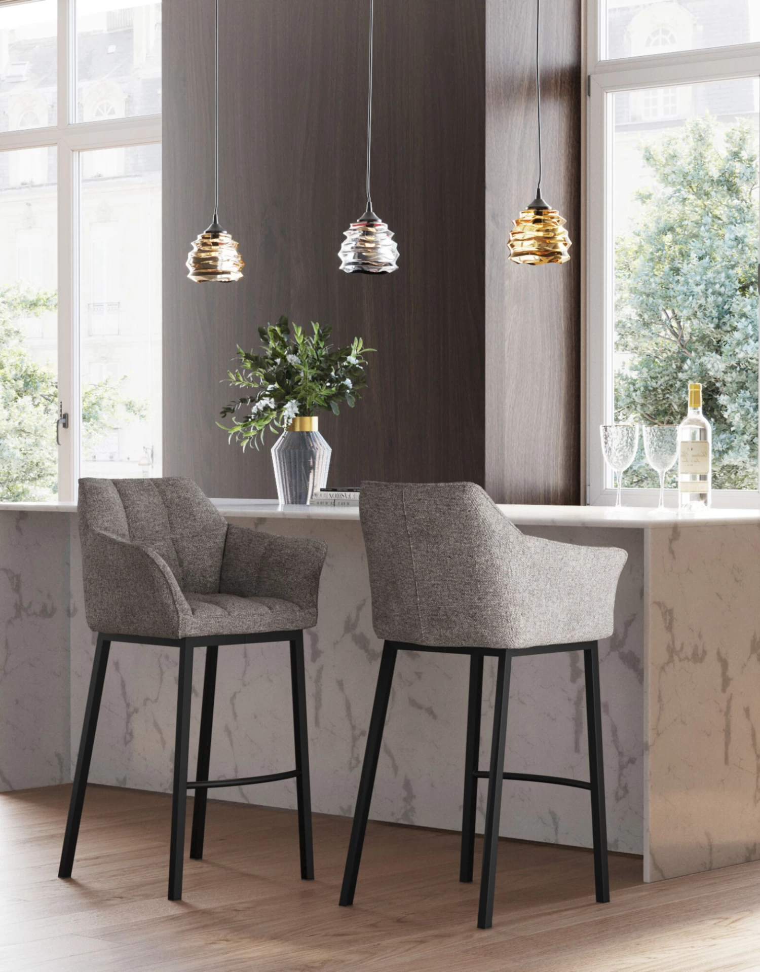 - Barhocker mit Armlehnen in Grau mit Arm- und RĂĽckenlehne sowie komfortabler FuĂźstĂĽtze