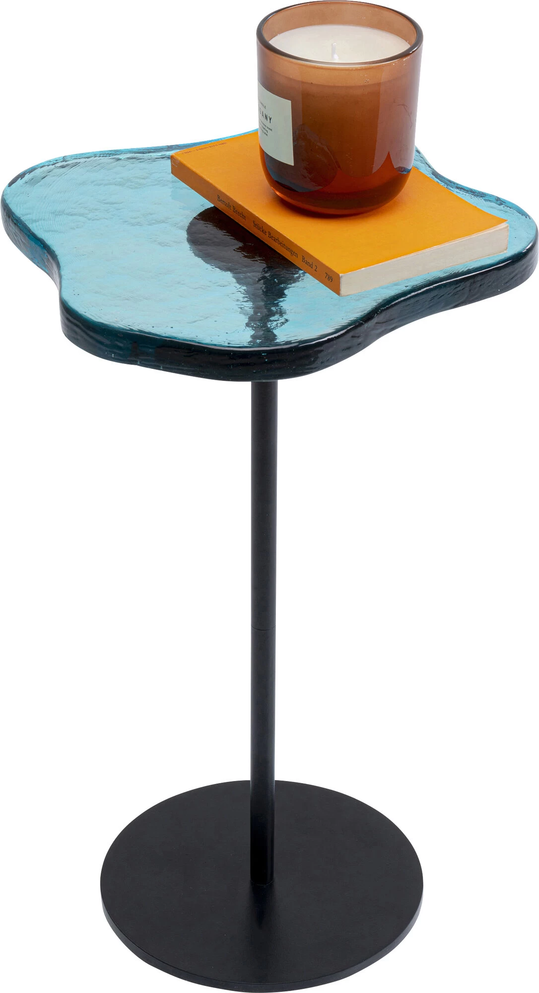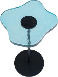 - Der blau-schwarze Glastisch funktioniert als Couchtisch neben Sofa und Sessel genauso gut wie als kleiner Nachttisch
