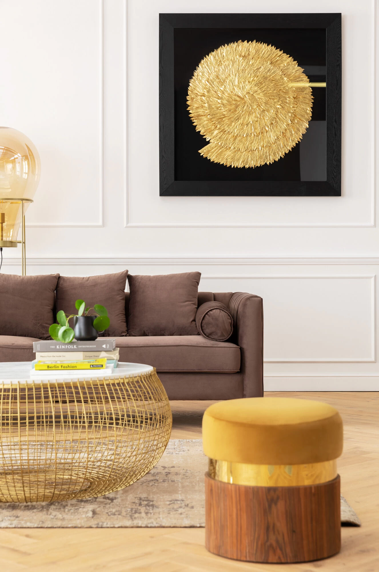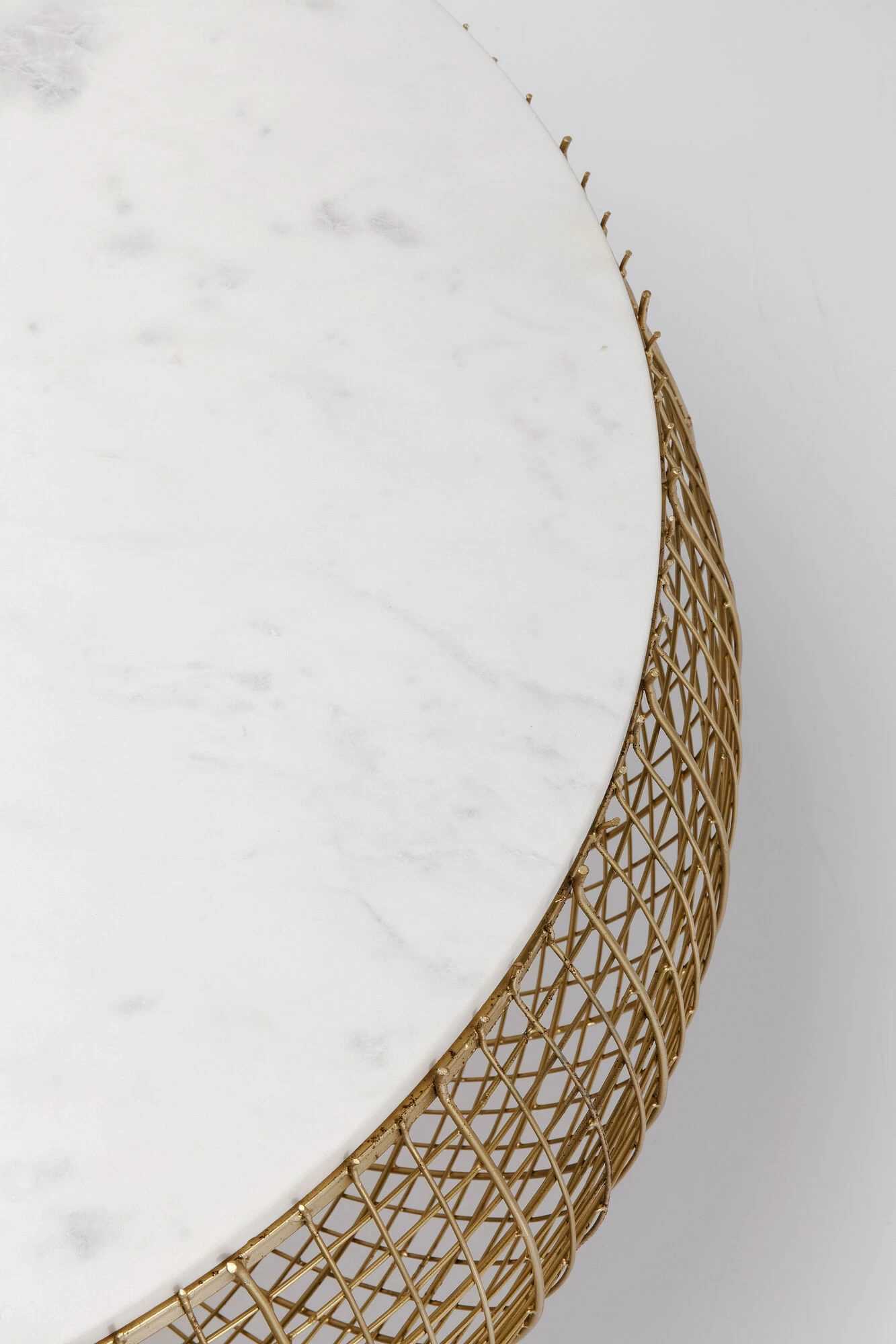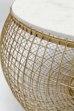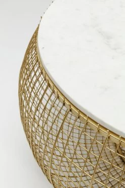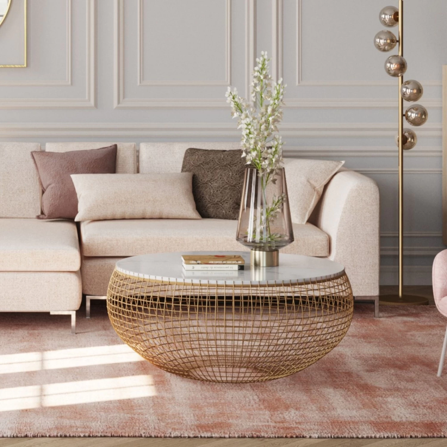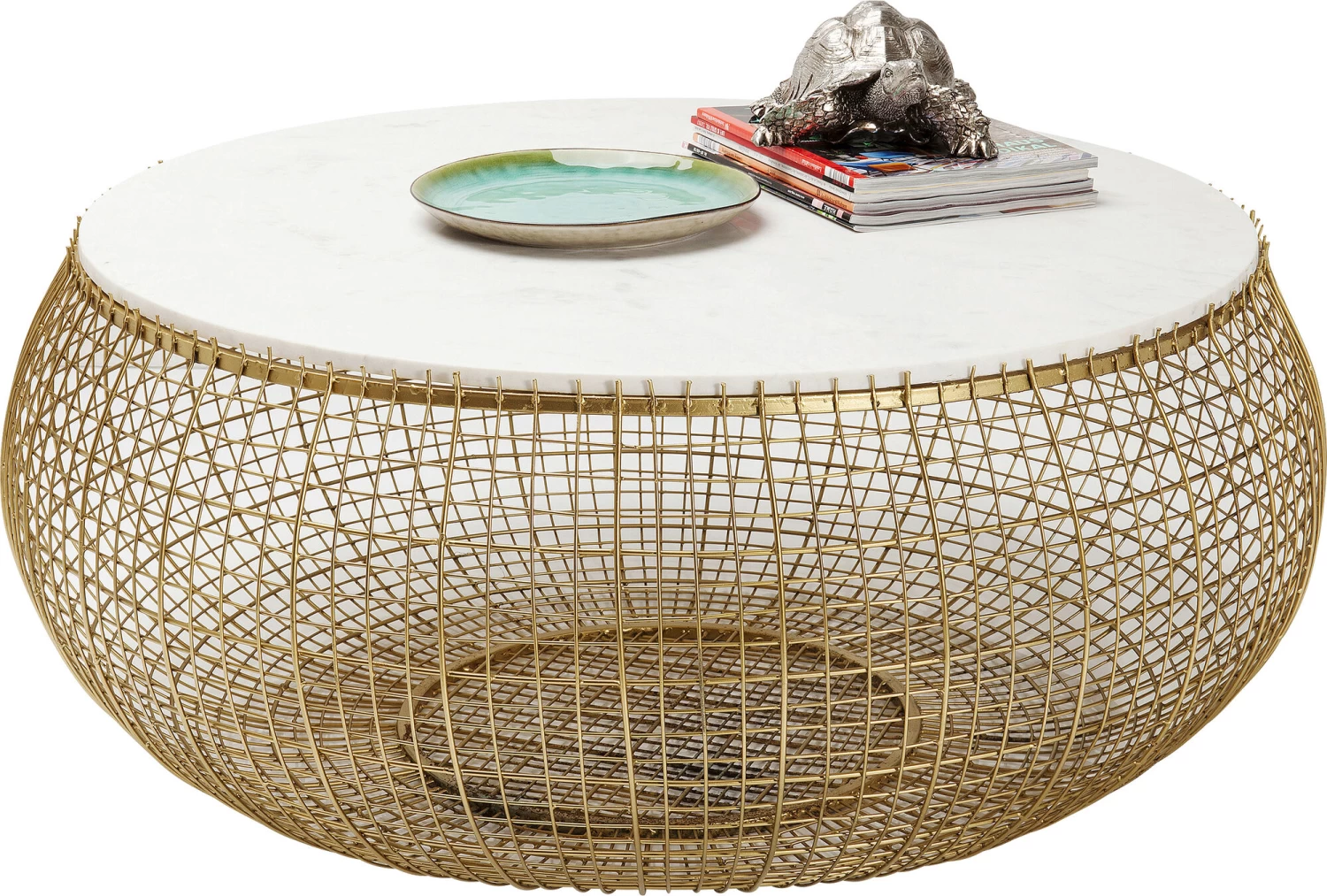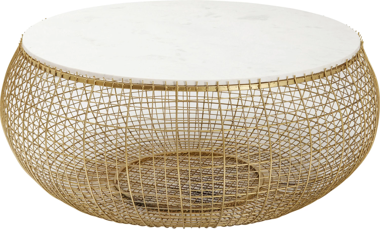 - Runder Couch- und Beistelltisch im eleganten Retro-Stil – ein Keypiece in Gold und hellem Marmor