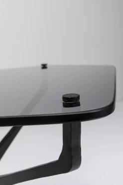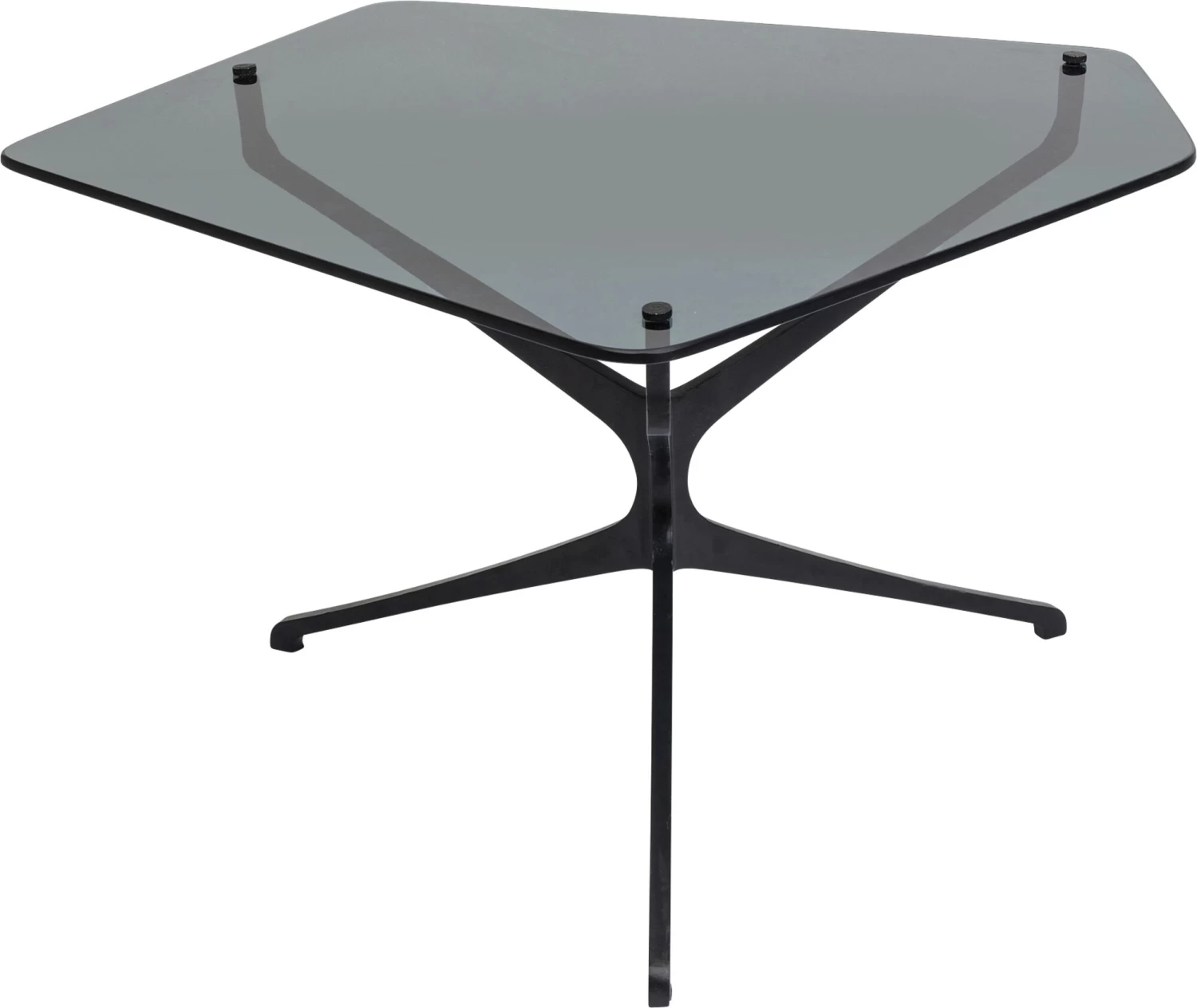 - Moderner Couchtisch in auĂergewĂśhnlicher Form mit Rauchglasplatte und Dreibeingestell in Stahl schwarz