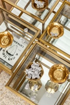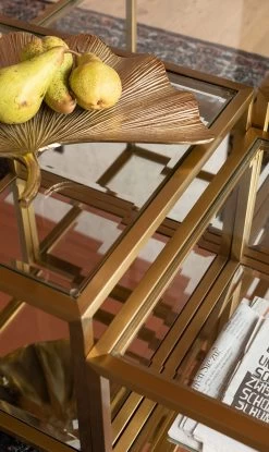 - Luxuriöse Extras: Tischplatten aus Glas und Spiegelglas mit Facettenschliff an den RÀndern, goldfarbenen lackierter Rahmen aus Edelstahl