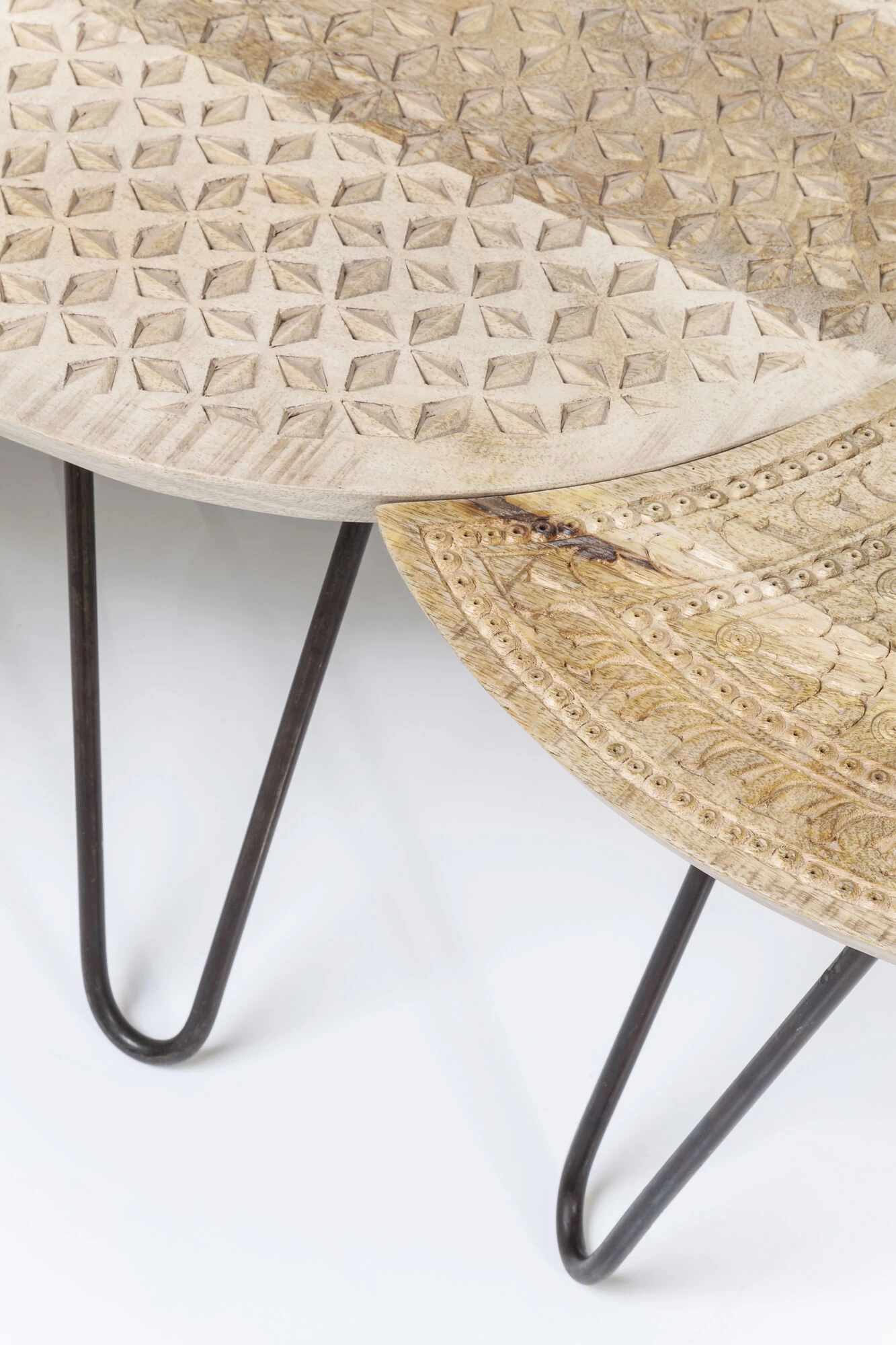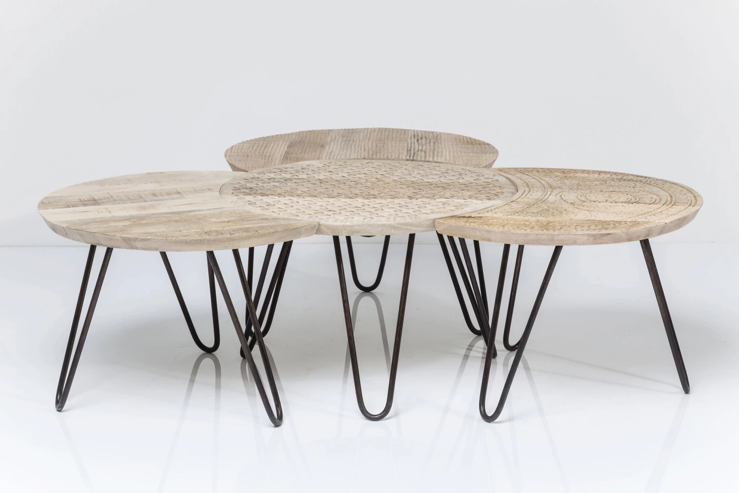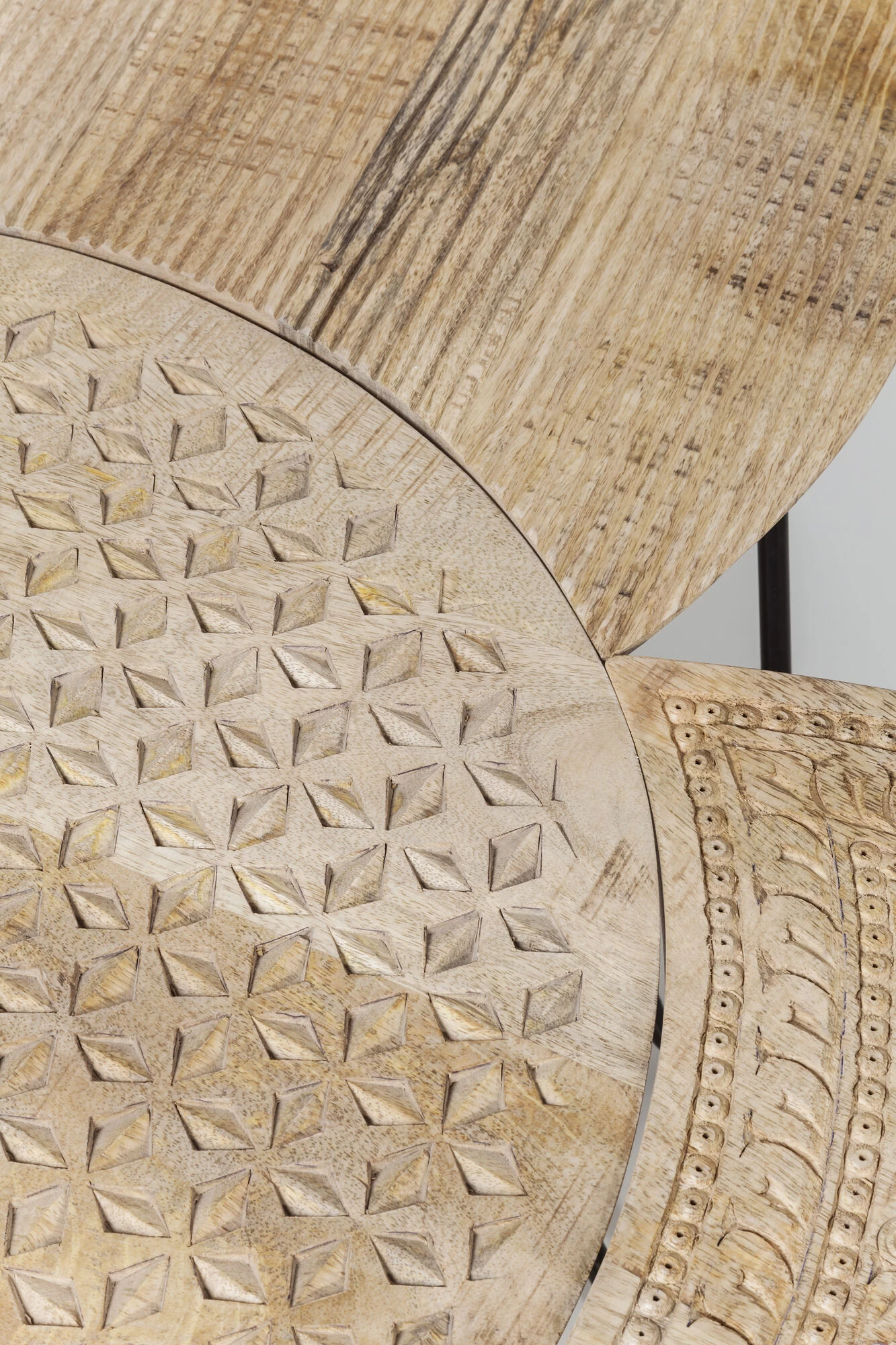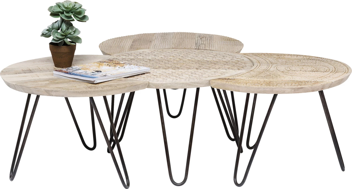 - Handgefertigter Couchtisch im 4-er-Set aus Mango-Massivholz mit dekorativen Schnitzereien und schwarzen Stahlbeinen