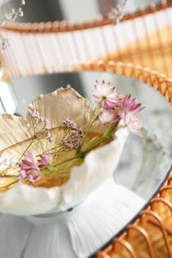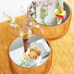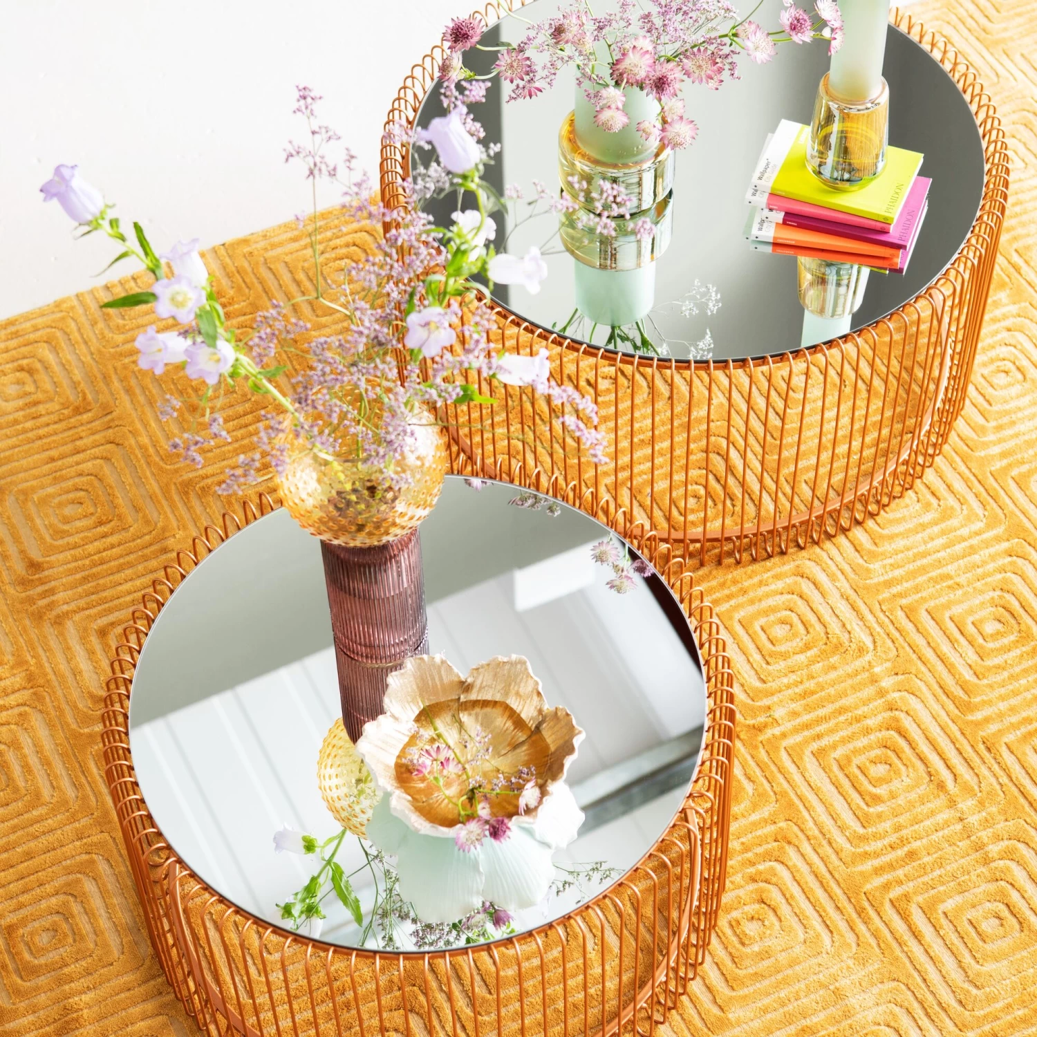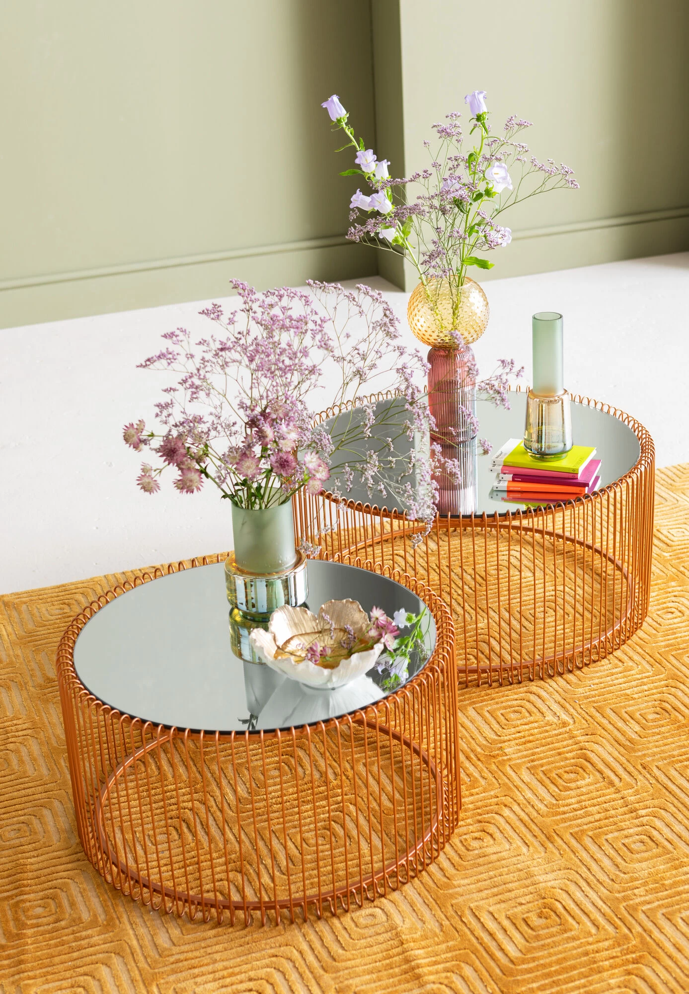 - Mit Glam-Faktor: Zweier-Couchtisch-Set an glänzenden, kupferfarbenen Beistelltischen mit verspiegelter Platte