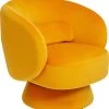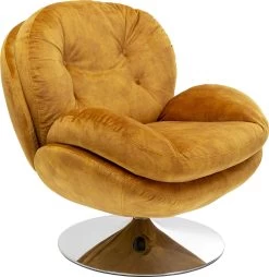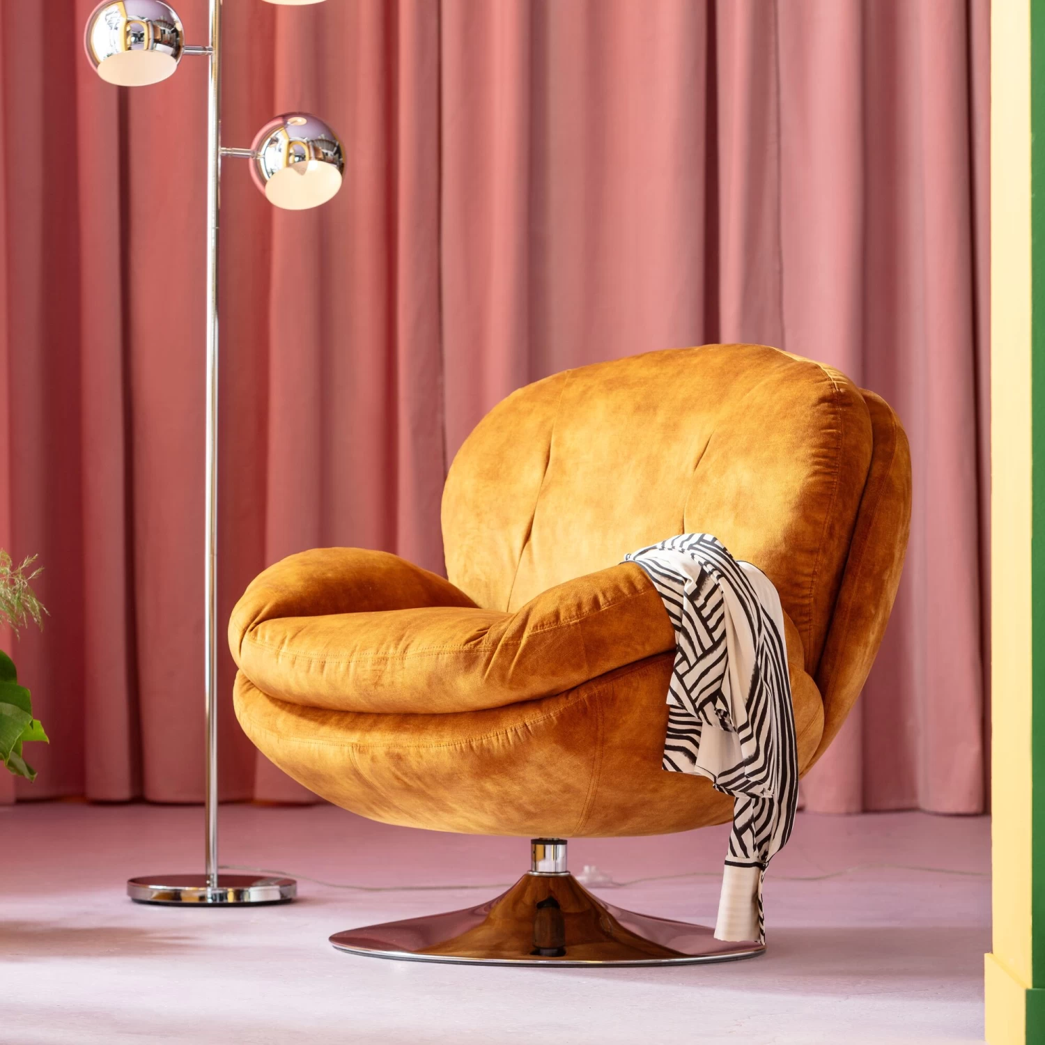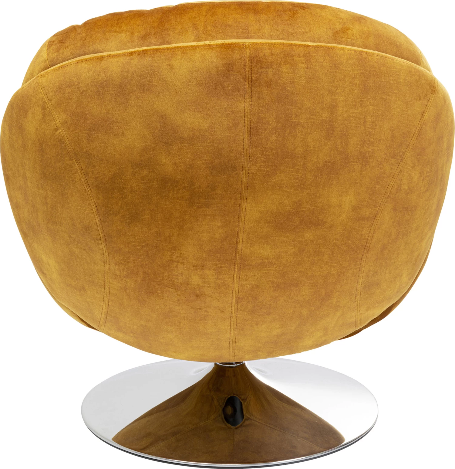 - Der Bernstein gelbe Bezug in Samtoptik ist großzügig verarbeitet, kurvige Ziernähte betonen das Retro-Design