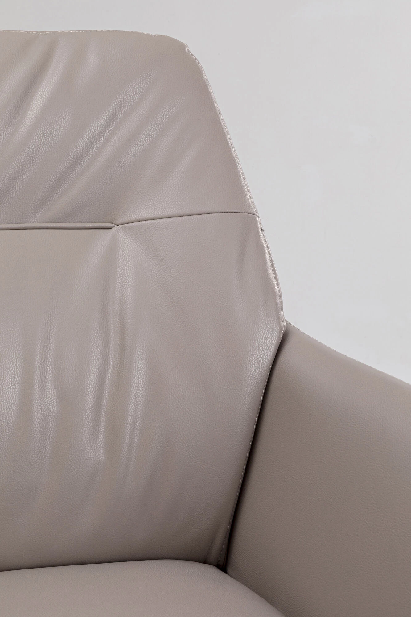 - Schicker Material-Mix: Der Bezug der Sitzschale zeigt sich von vorne in Leder-Optik und von hinten mit einem melierten Strukturstoff