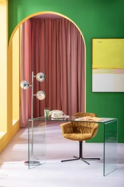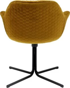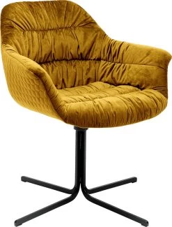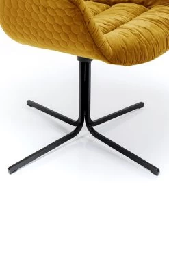 - Voluminös gepolsterter Drehstuhl mit Armlehnen, einem samtigen Bezug in warmem Gelb und stabilem, schwarzen Sternfuß aus Stahl