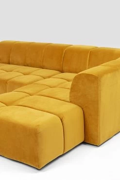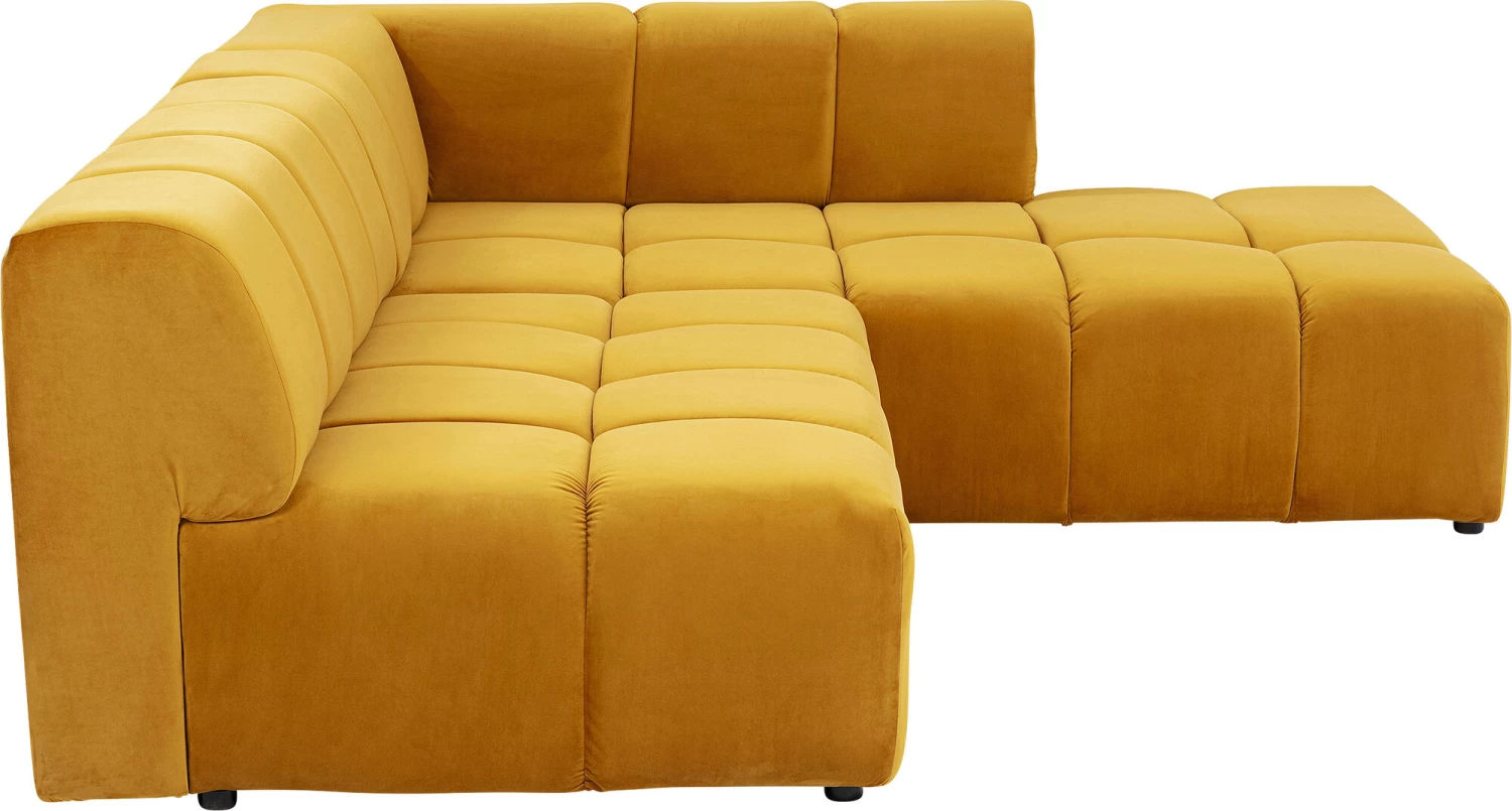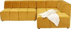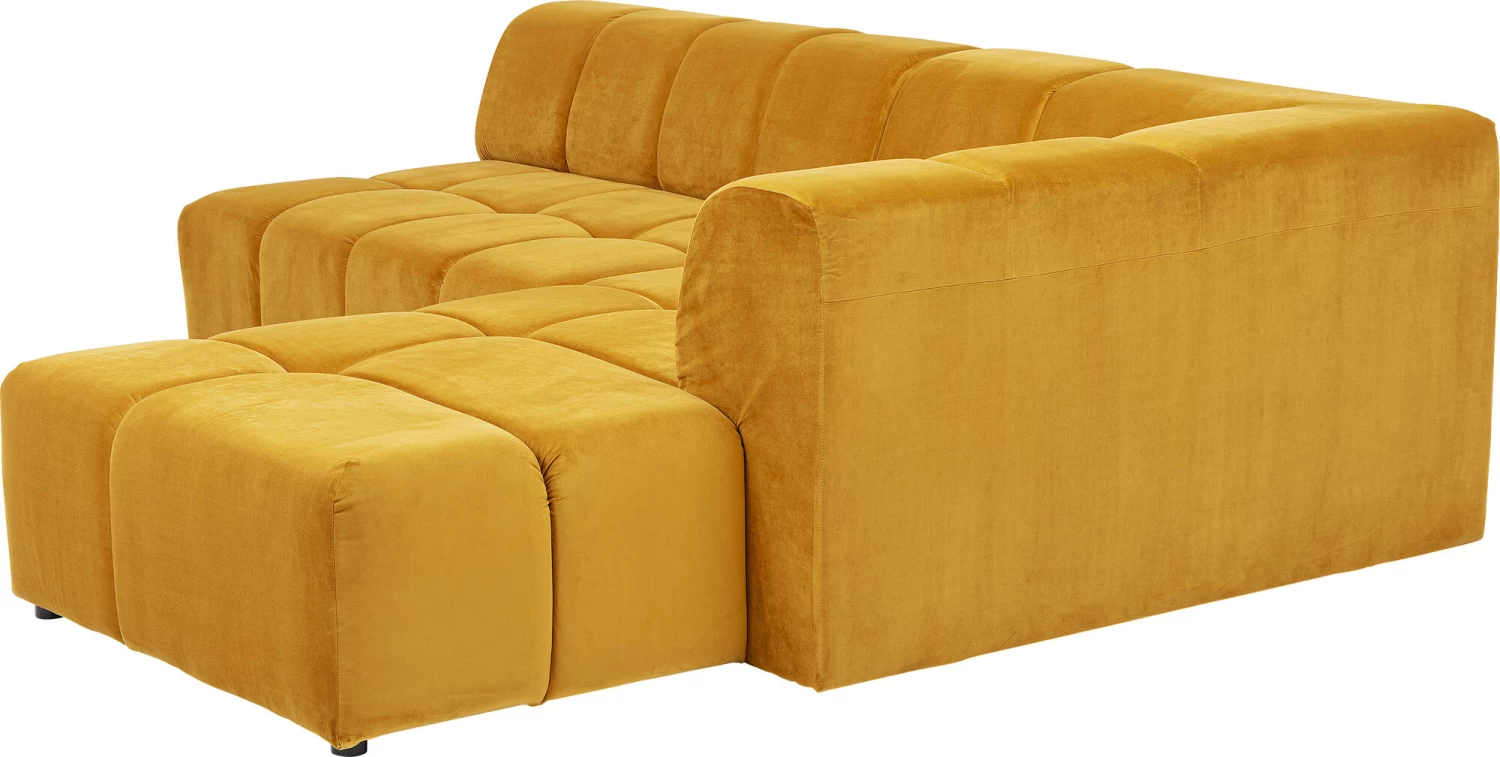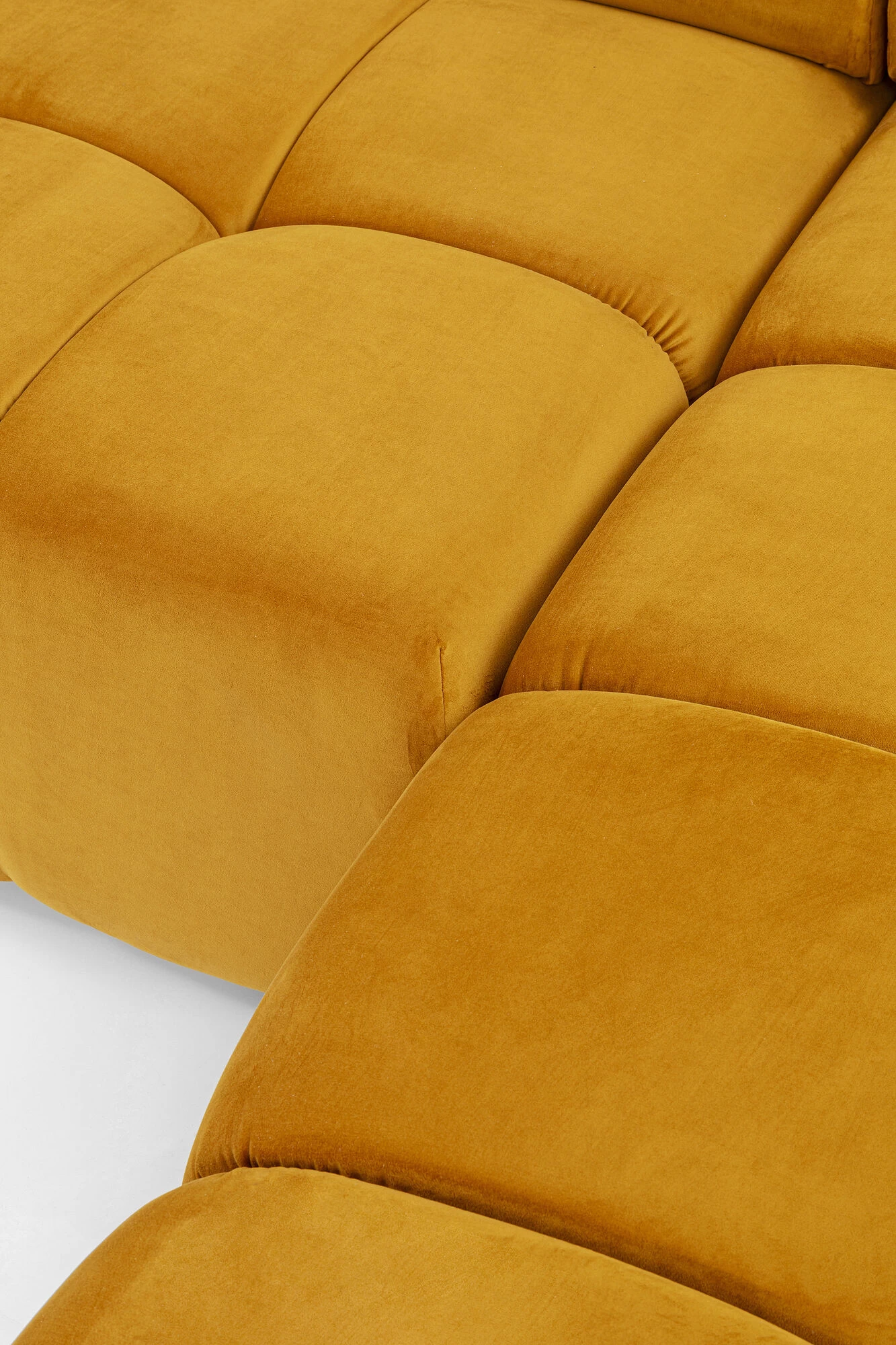- Ocker-gelbes Ecksofa mit Chaiselongue rechts und einem samtigen Bezug aus pflegeleichter Kunstfaser