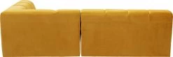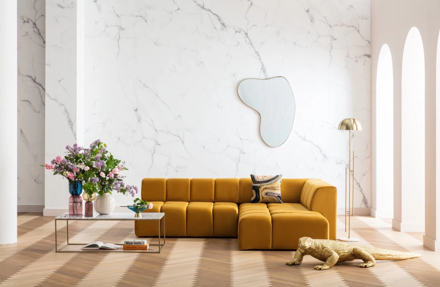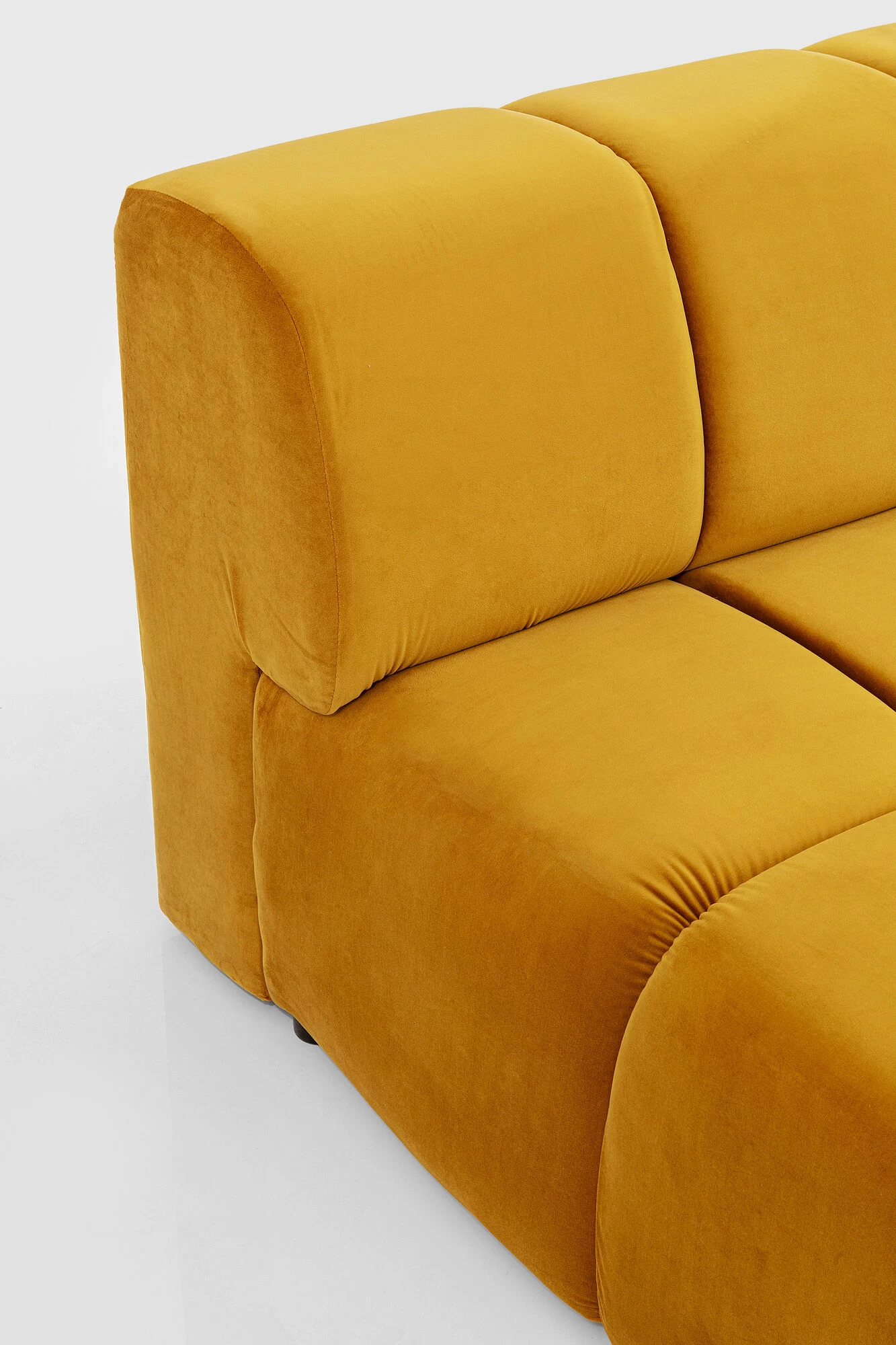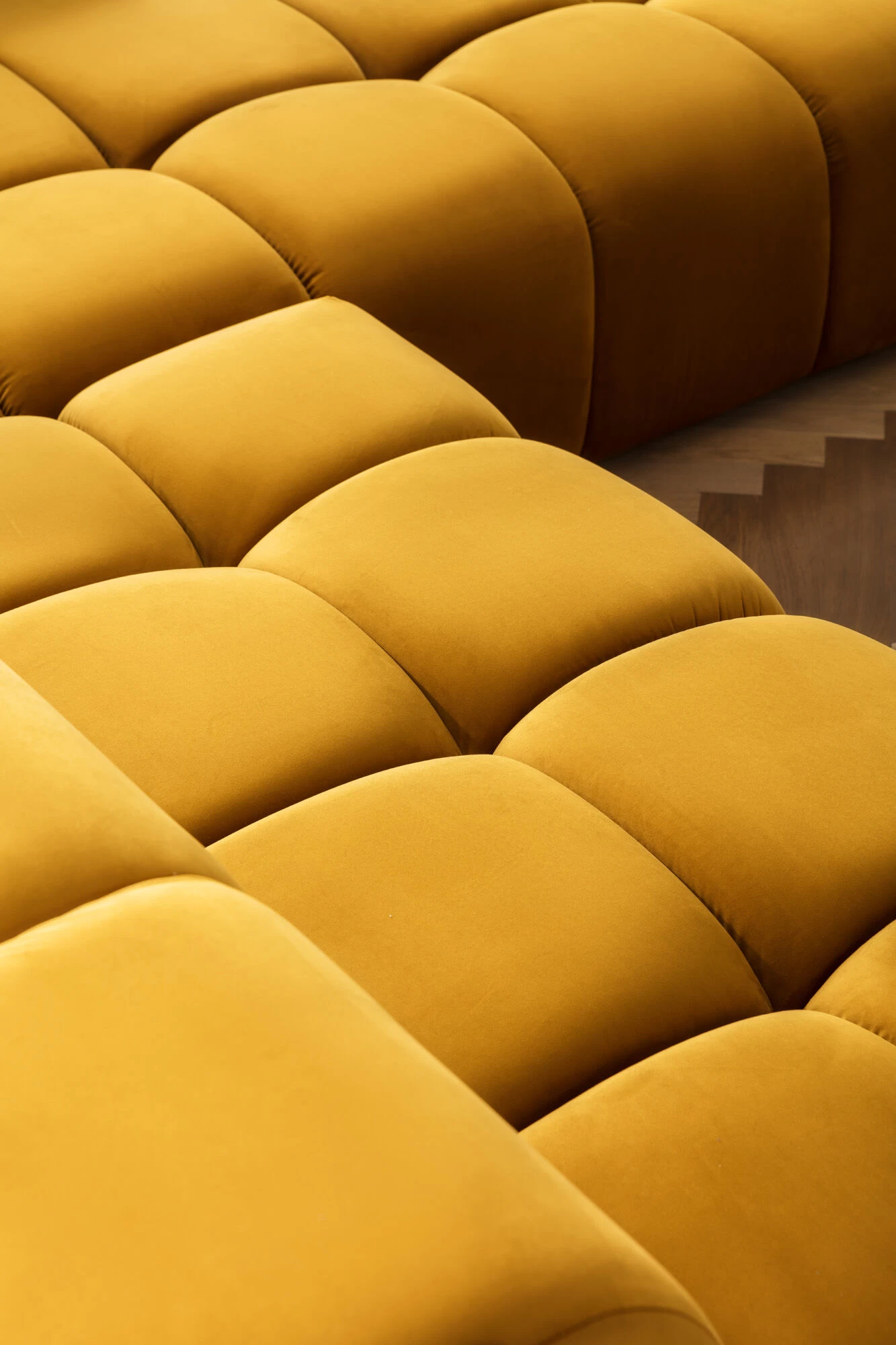 - Ocker-gelbes Ecksofa mit Chaiselongue rechts und einem samtigen Bezug aus pflegeleichter Kunstfaser