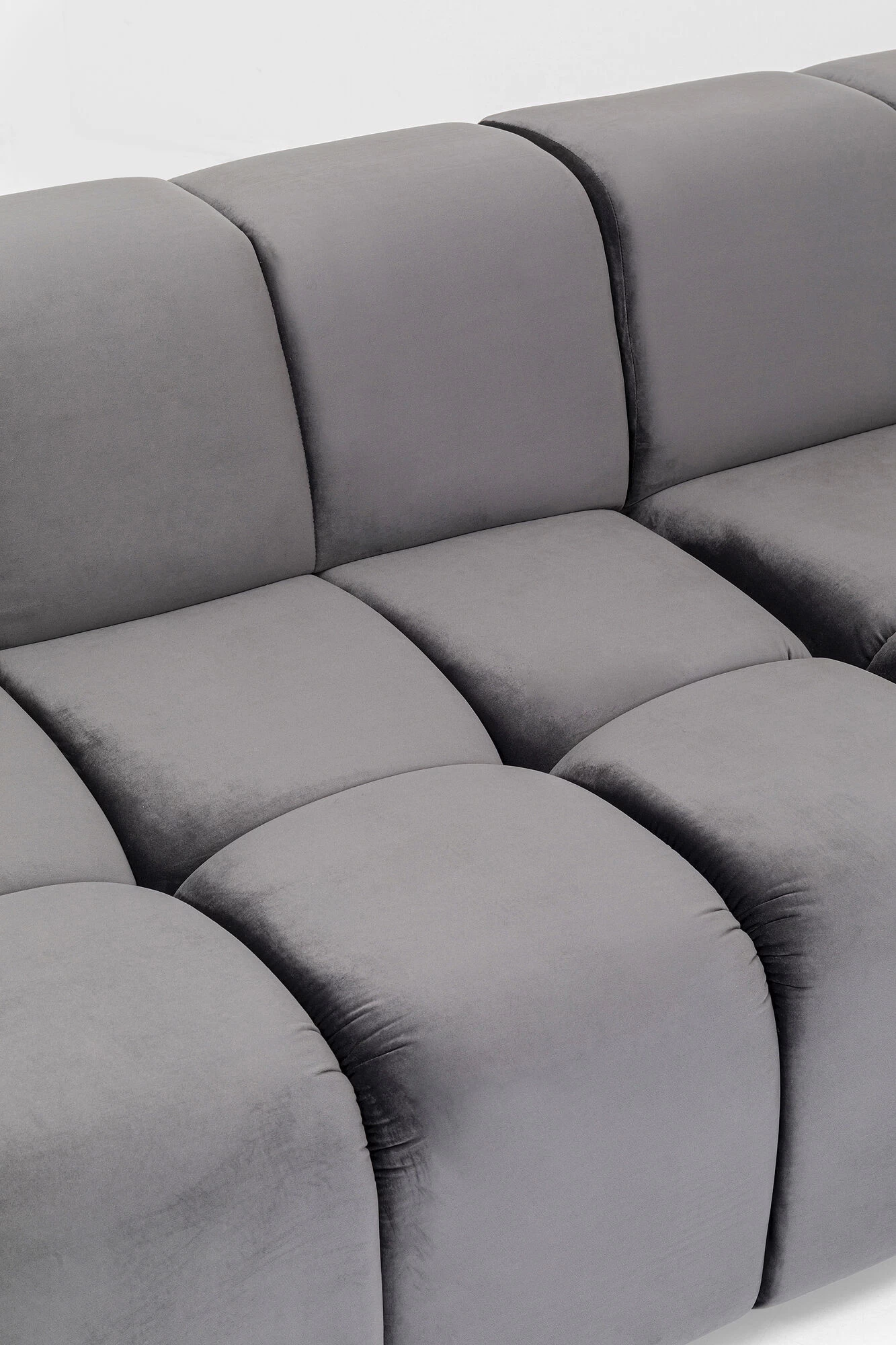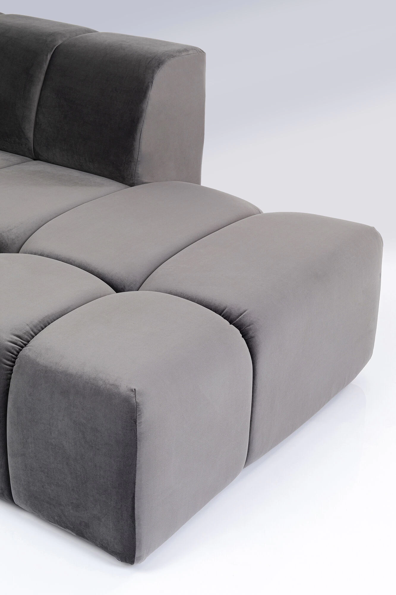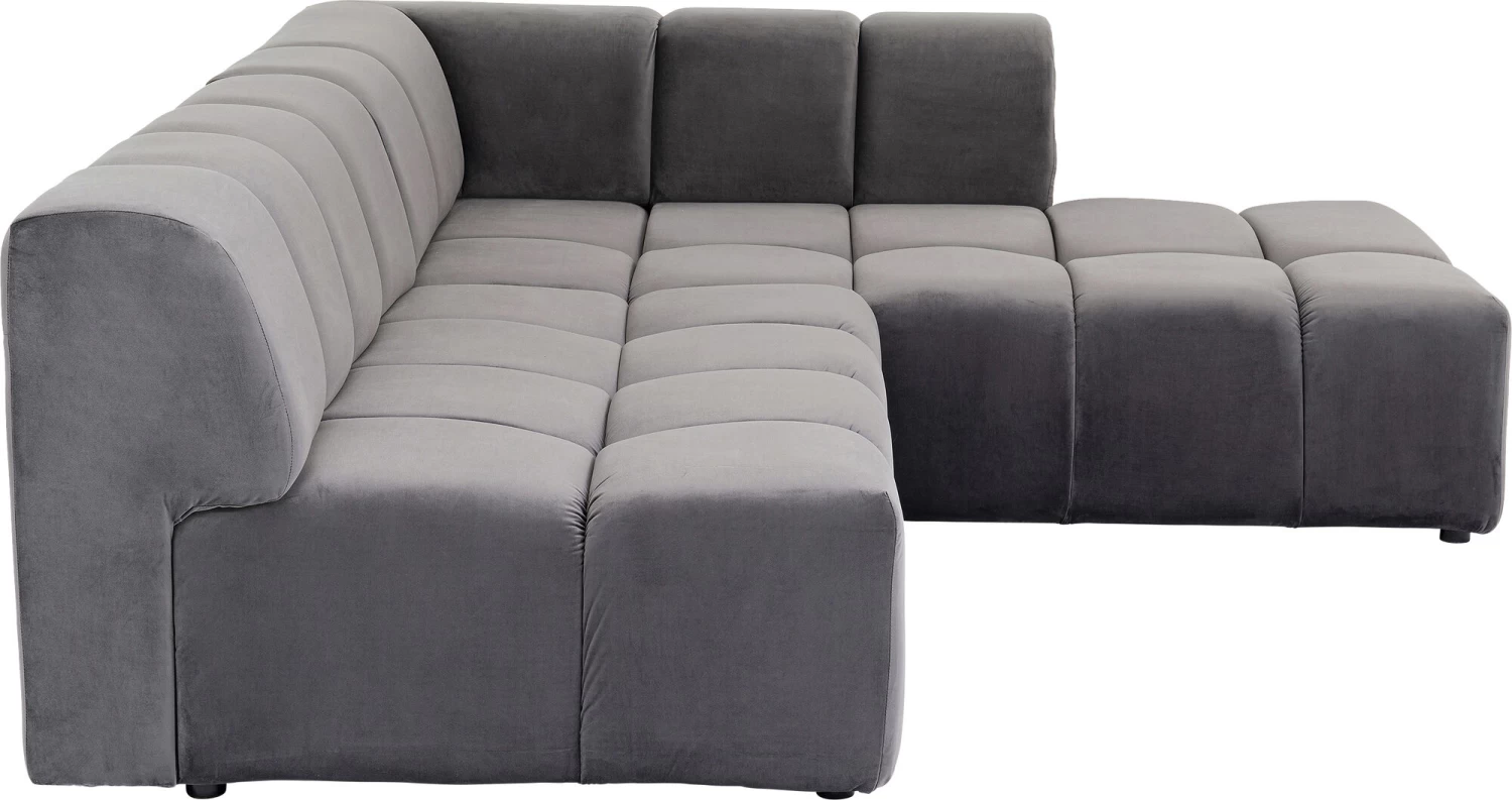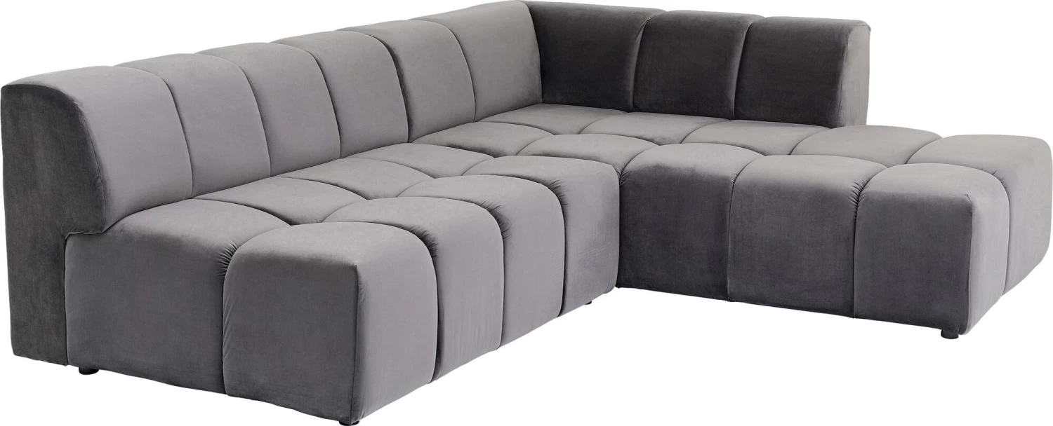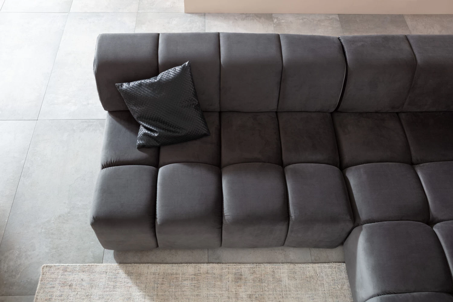 - Graues Ecksofa mit Chaiselongue rechts und einem samtigen Bezug aus pflegeleichter Kunstfaser
