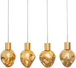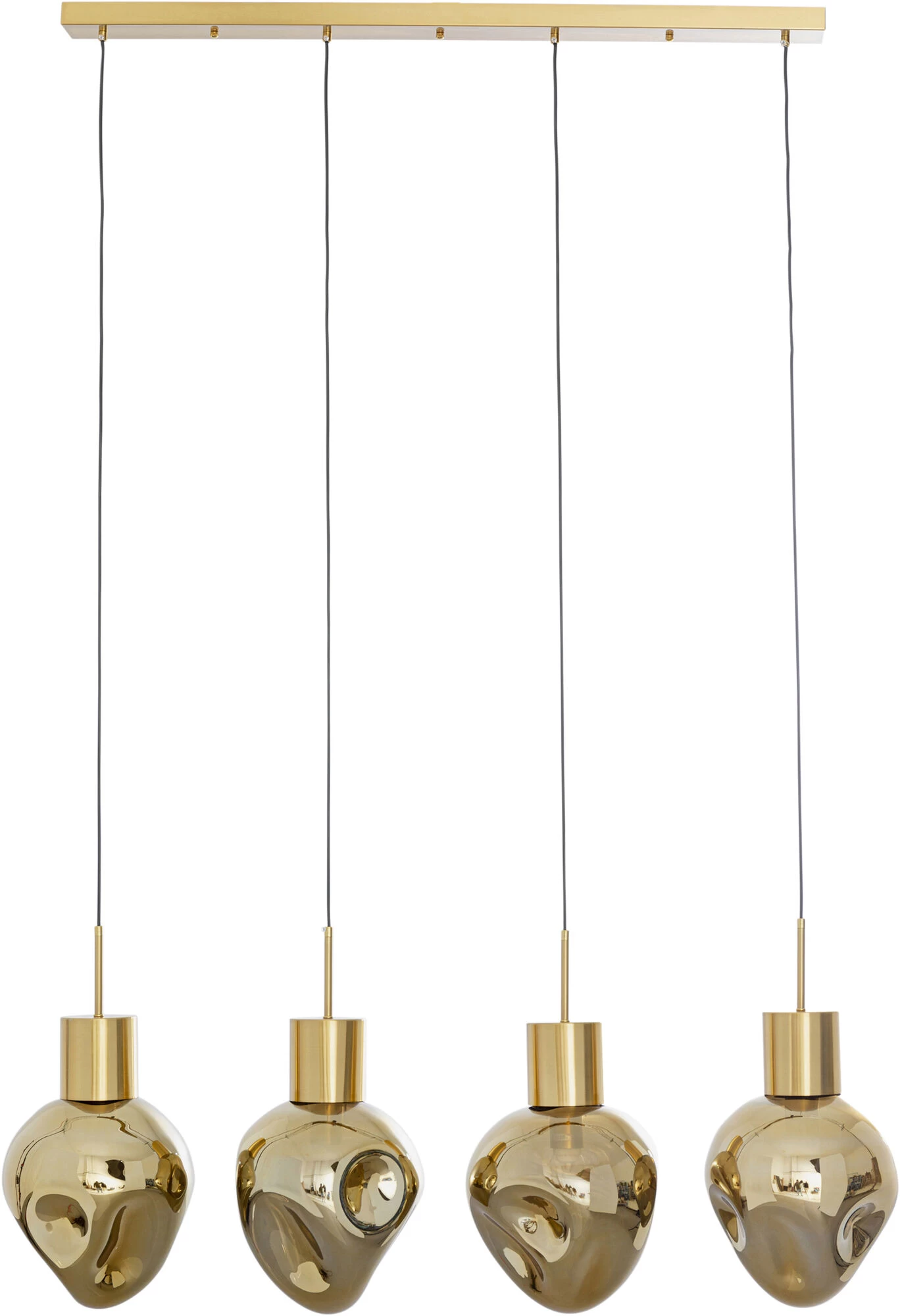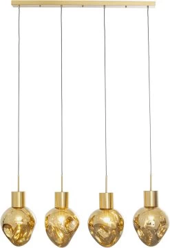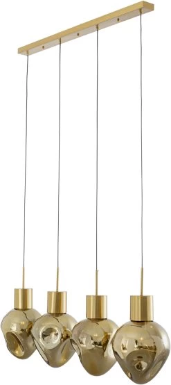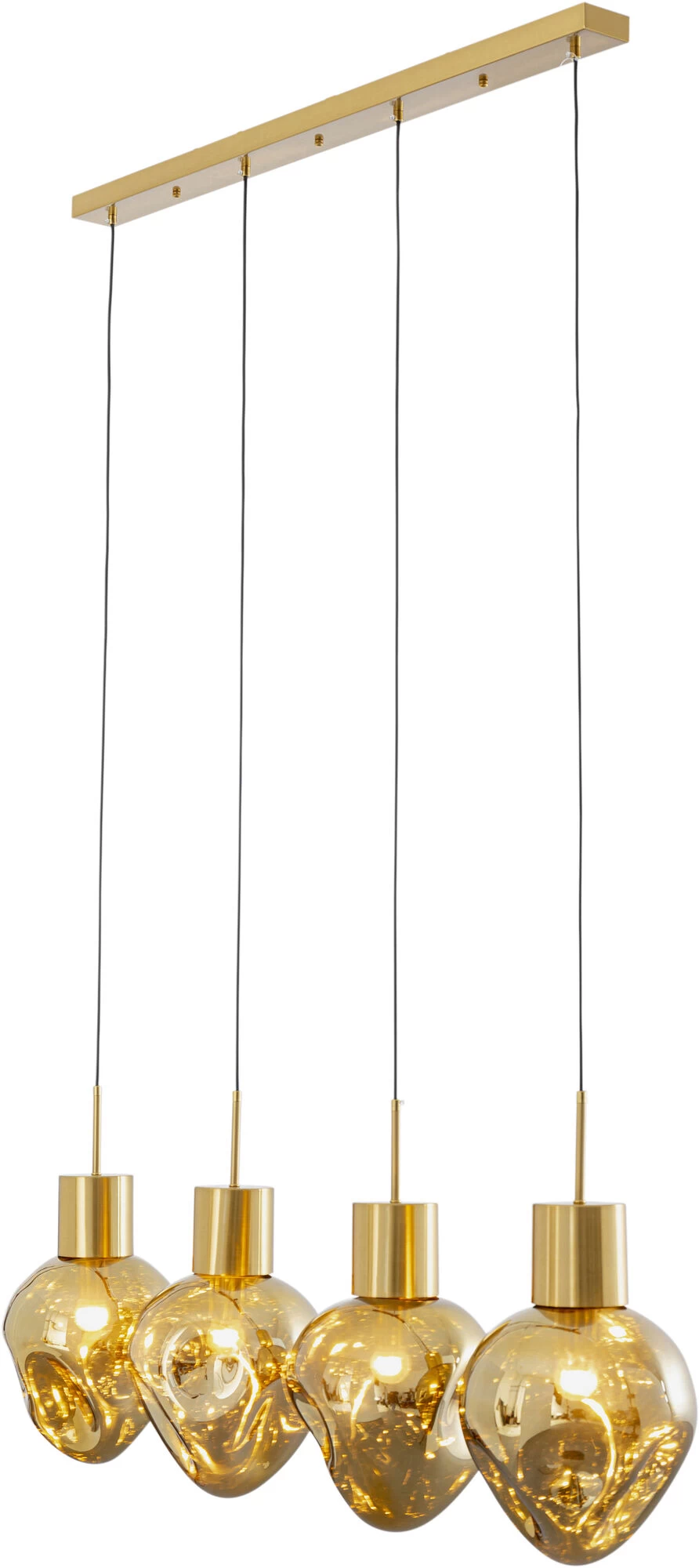 - Breite, goldfarbene HĂ€ngelampe mit vier Schirmen, 160 x 110 x 25 Zentimeter (H/B/T)