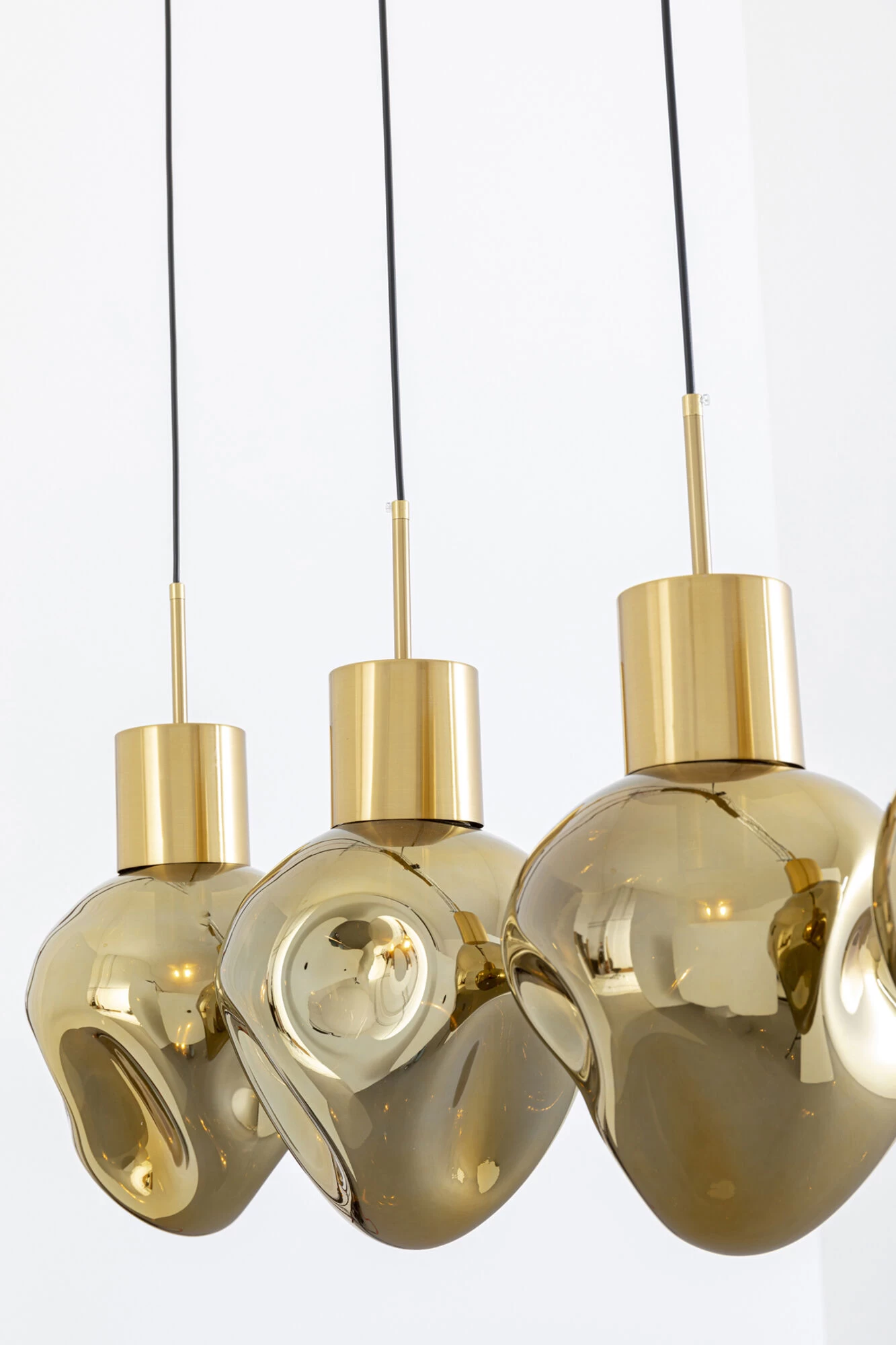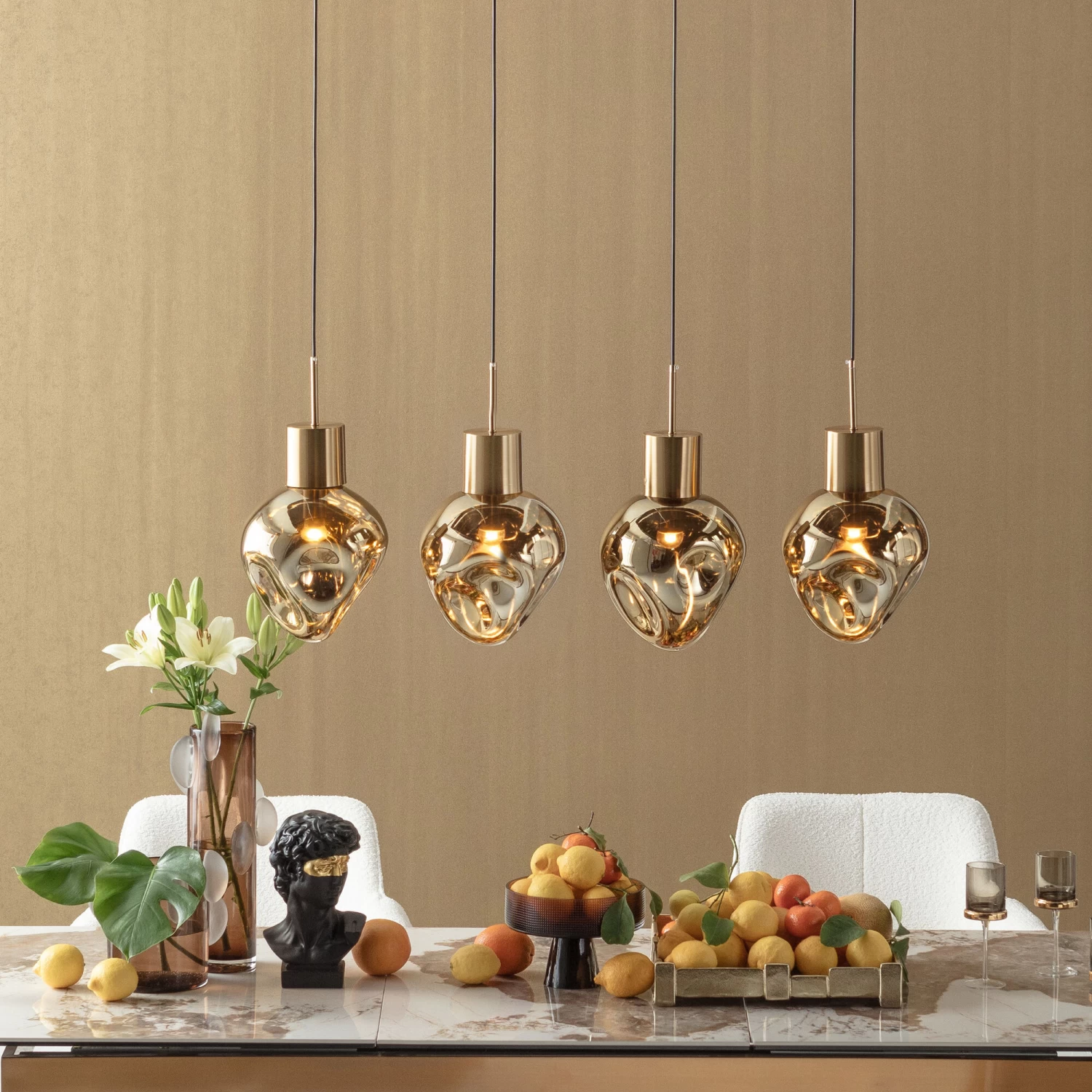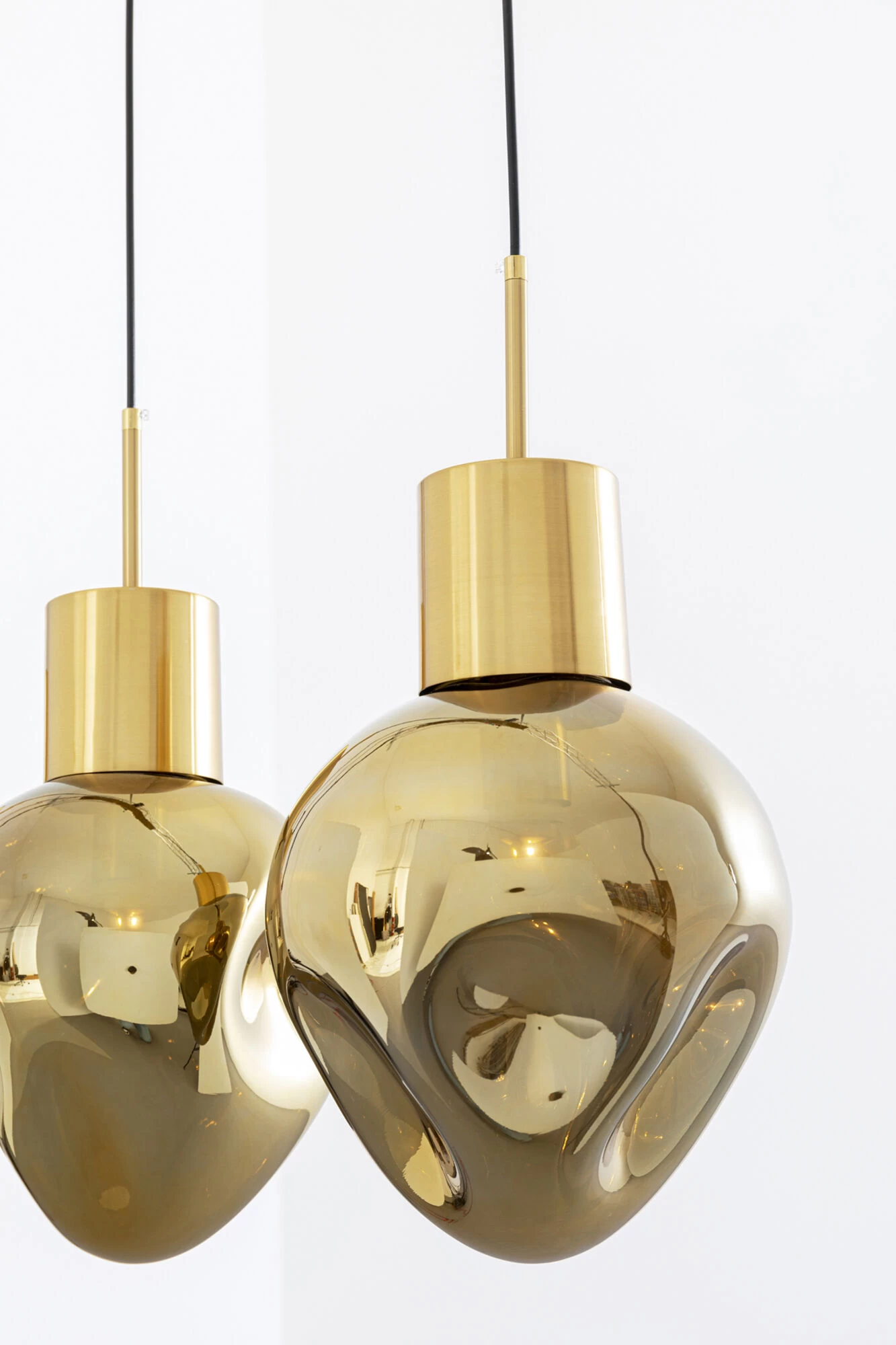 - Breite, goldfarbene HĂ€ngelampe mit vier Schirmen, 160 x 110 x 25 Zentimeter (H/B/T)