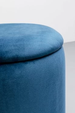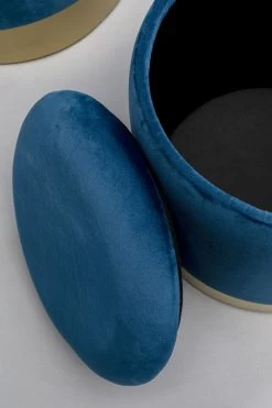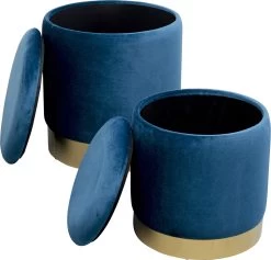 - 2er Set Polsterhocker mit Stauraum in Blau auf einem Sockel aus Stahl in der Farbe Messing