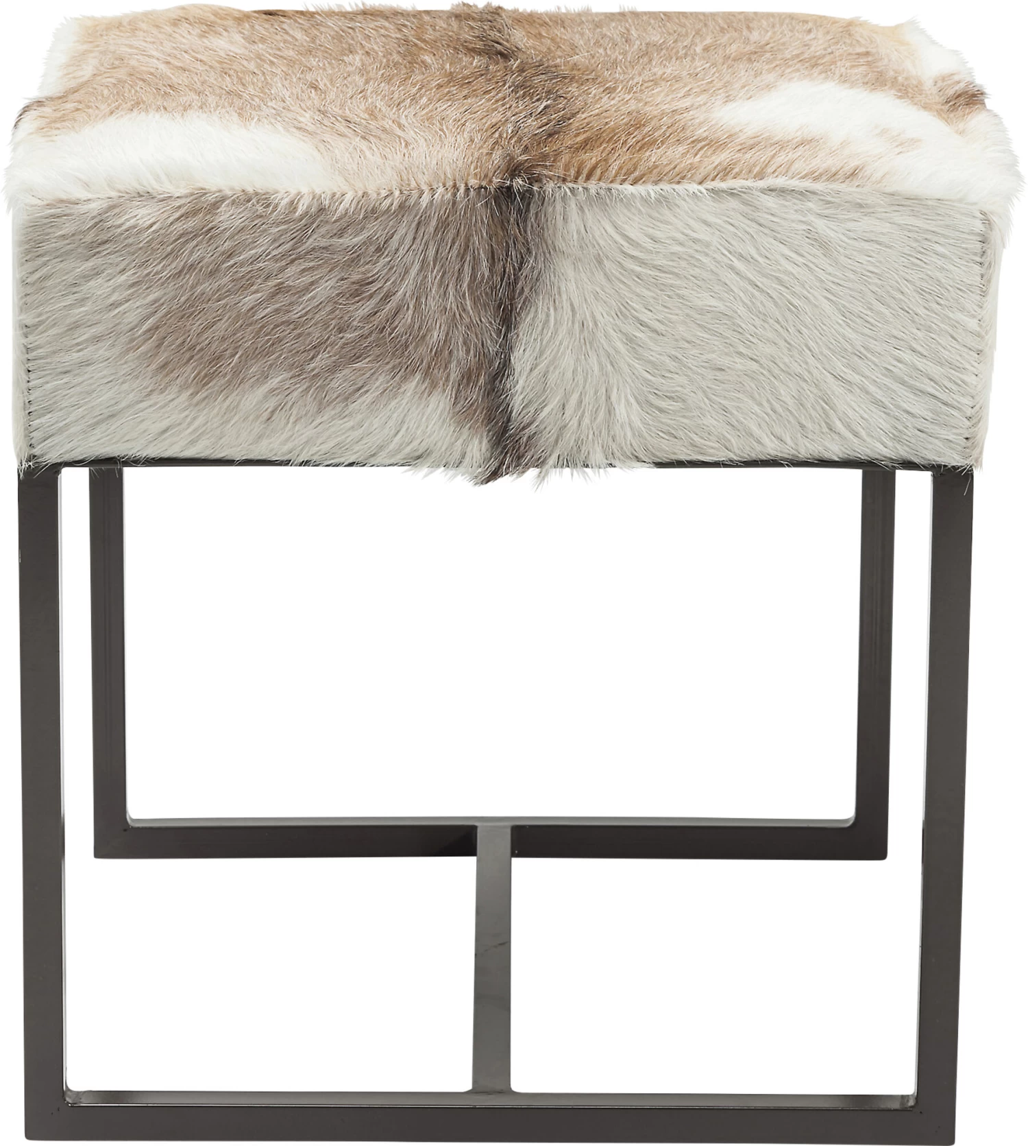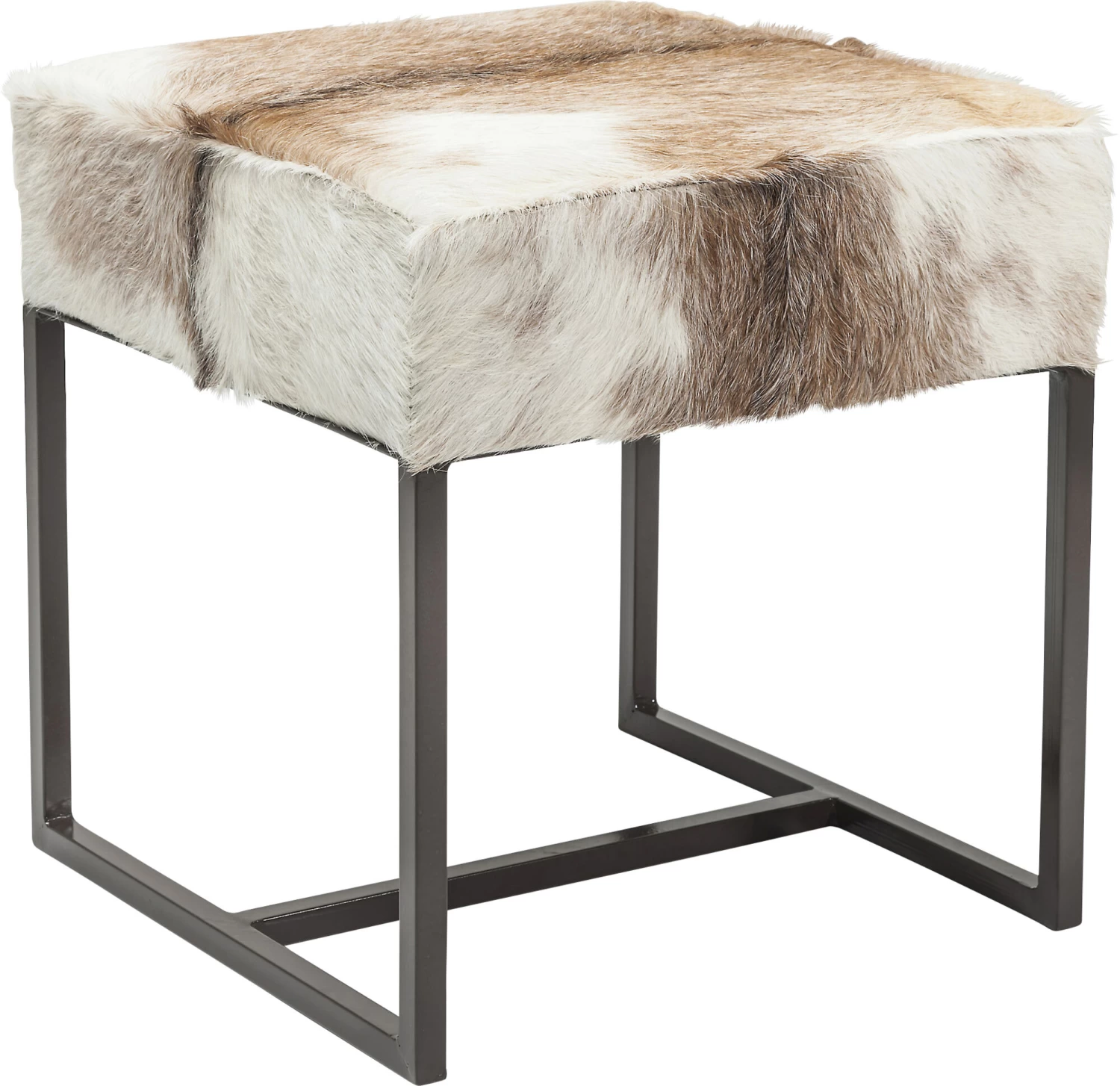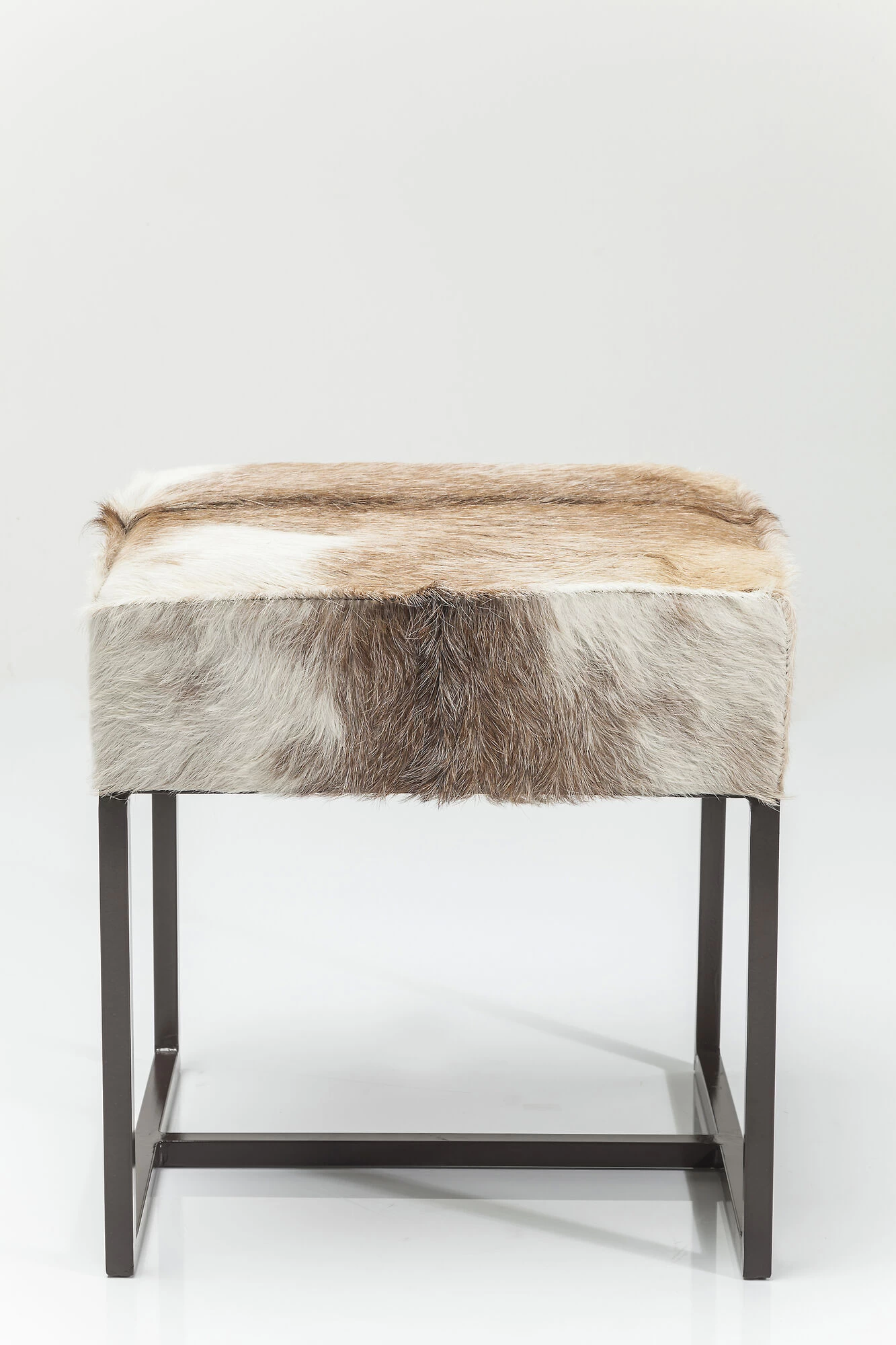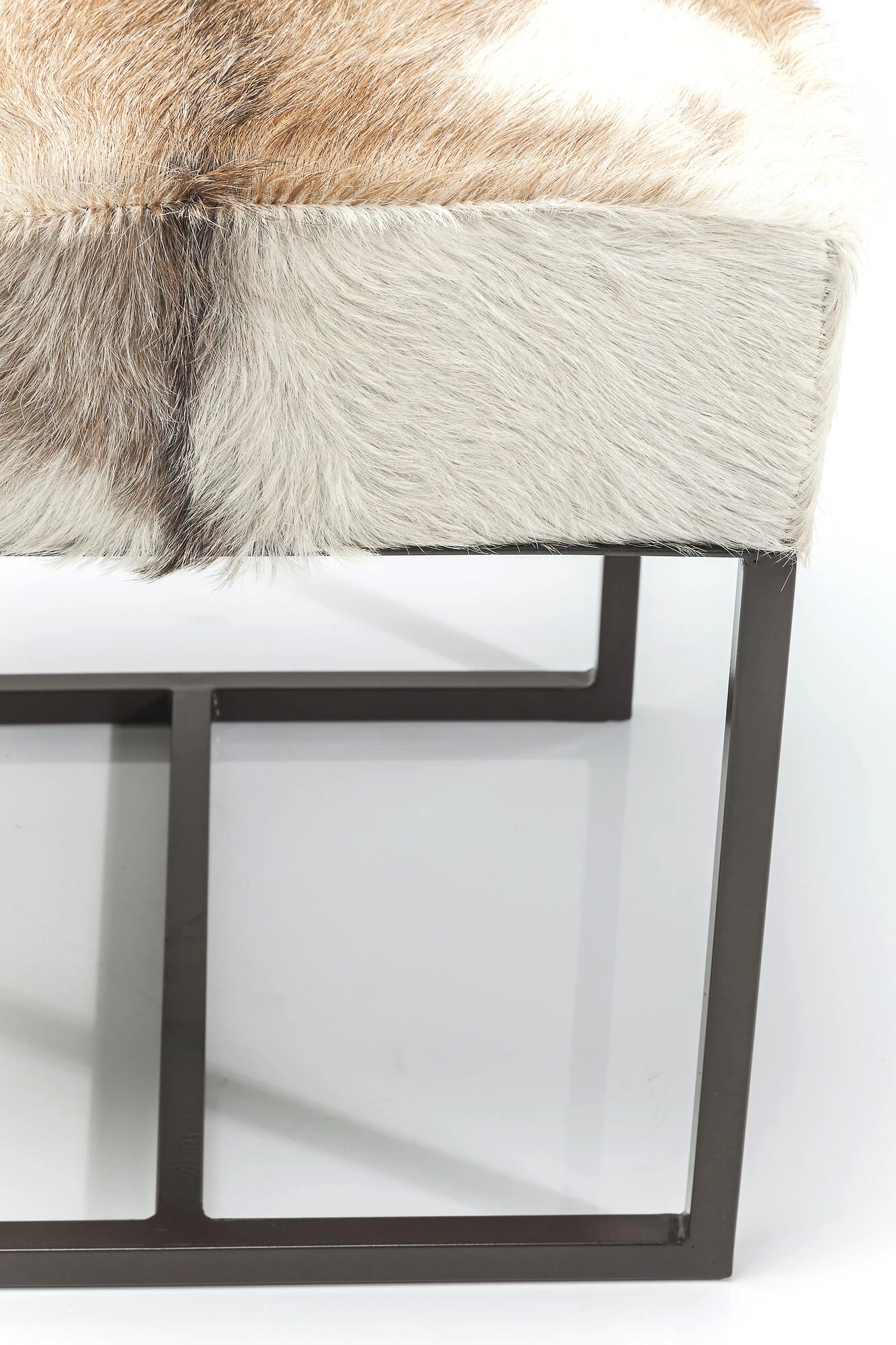 - Quadratischer Polster-Hocker mit dunkelbraunem Stahlgestell und einem Bezug aus echtem Ziegenfell – jeder Sitzhocker ist ein Unikat