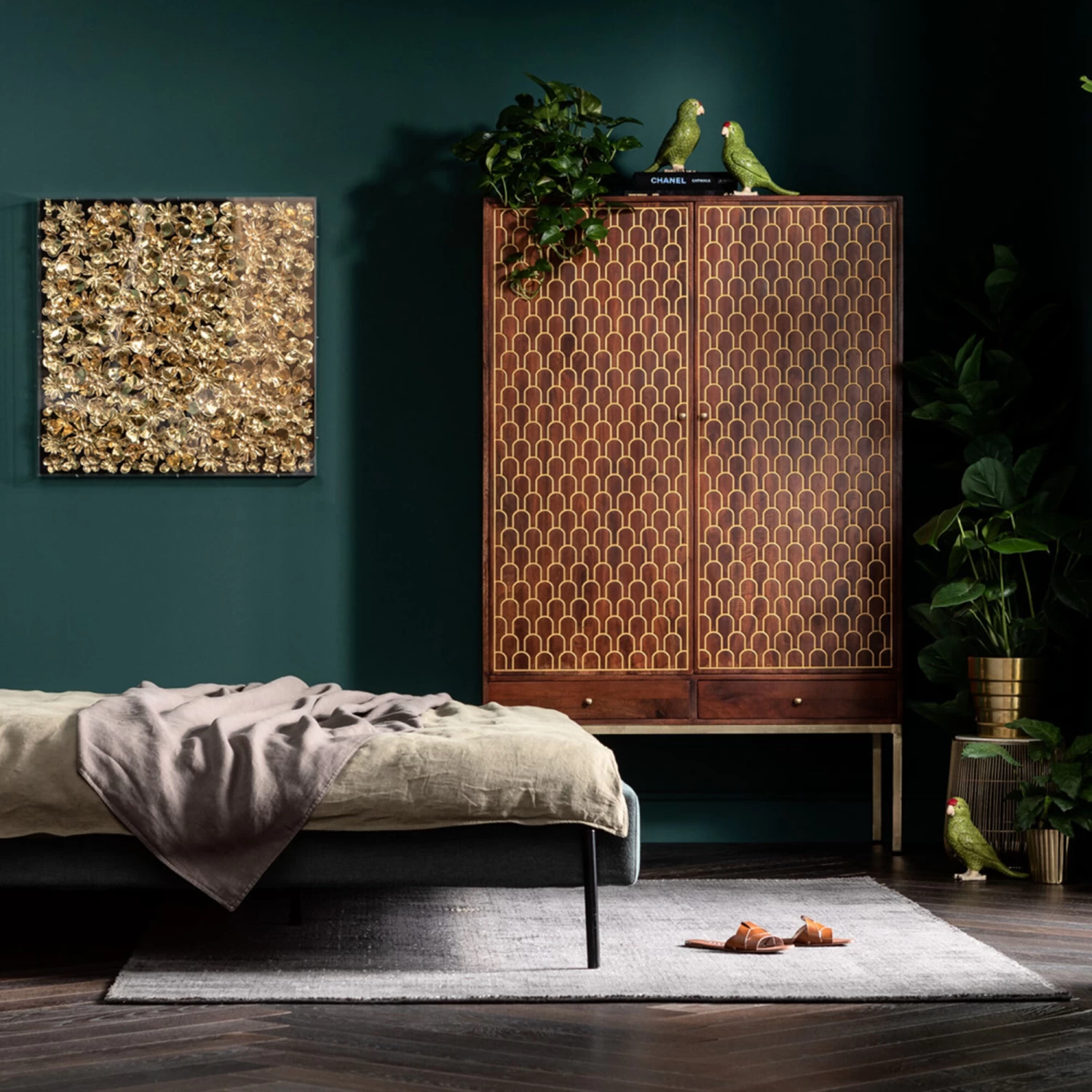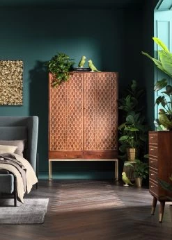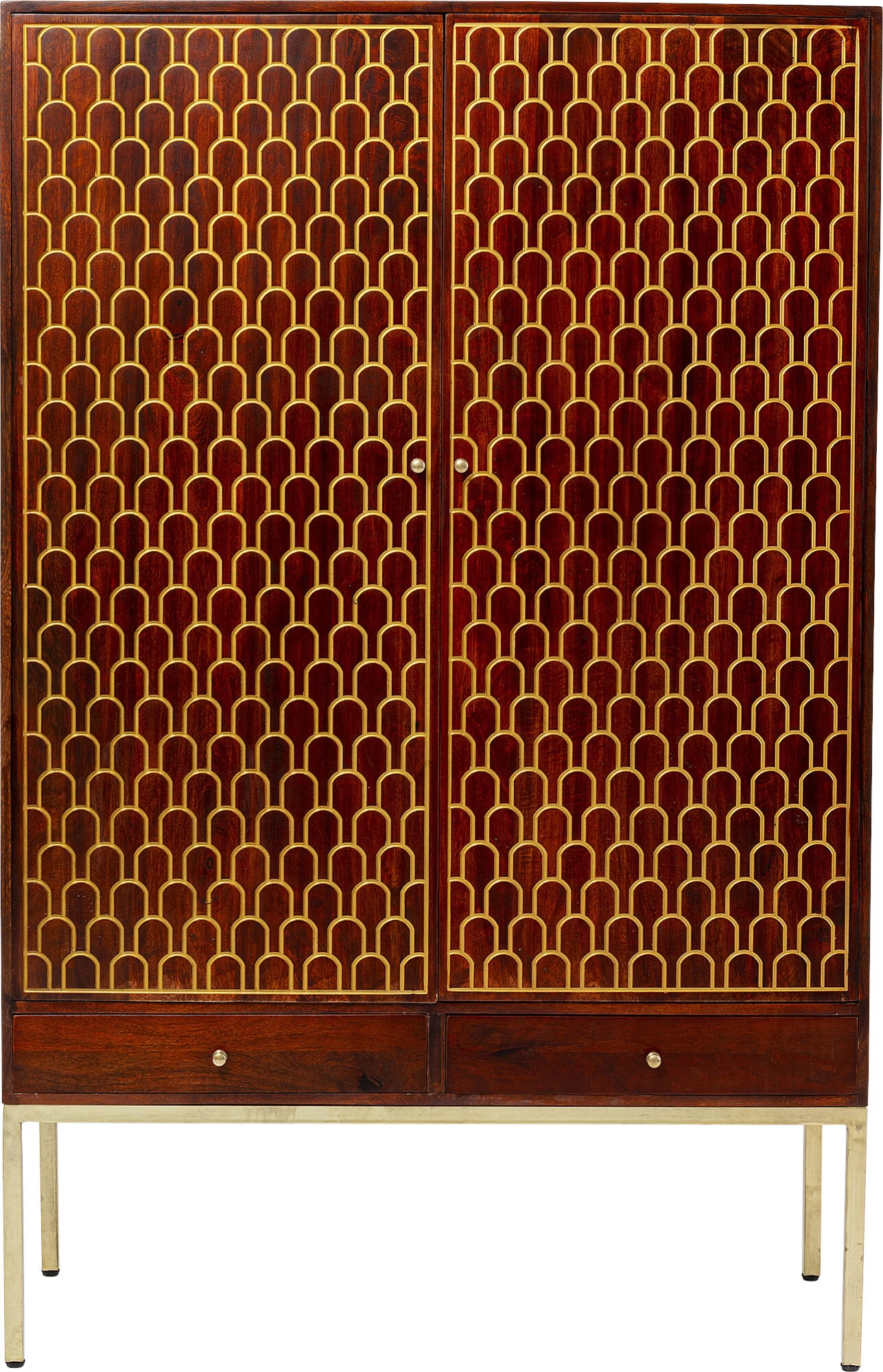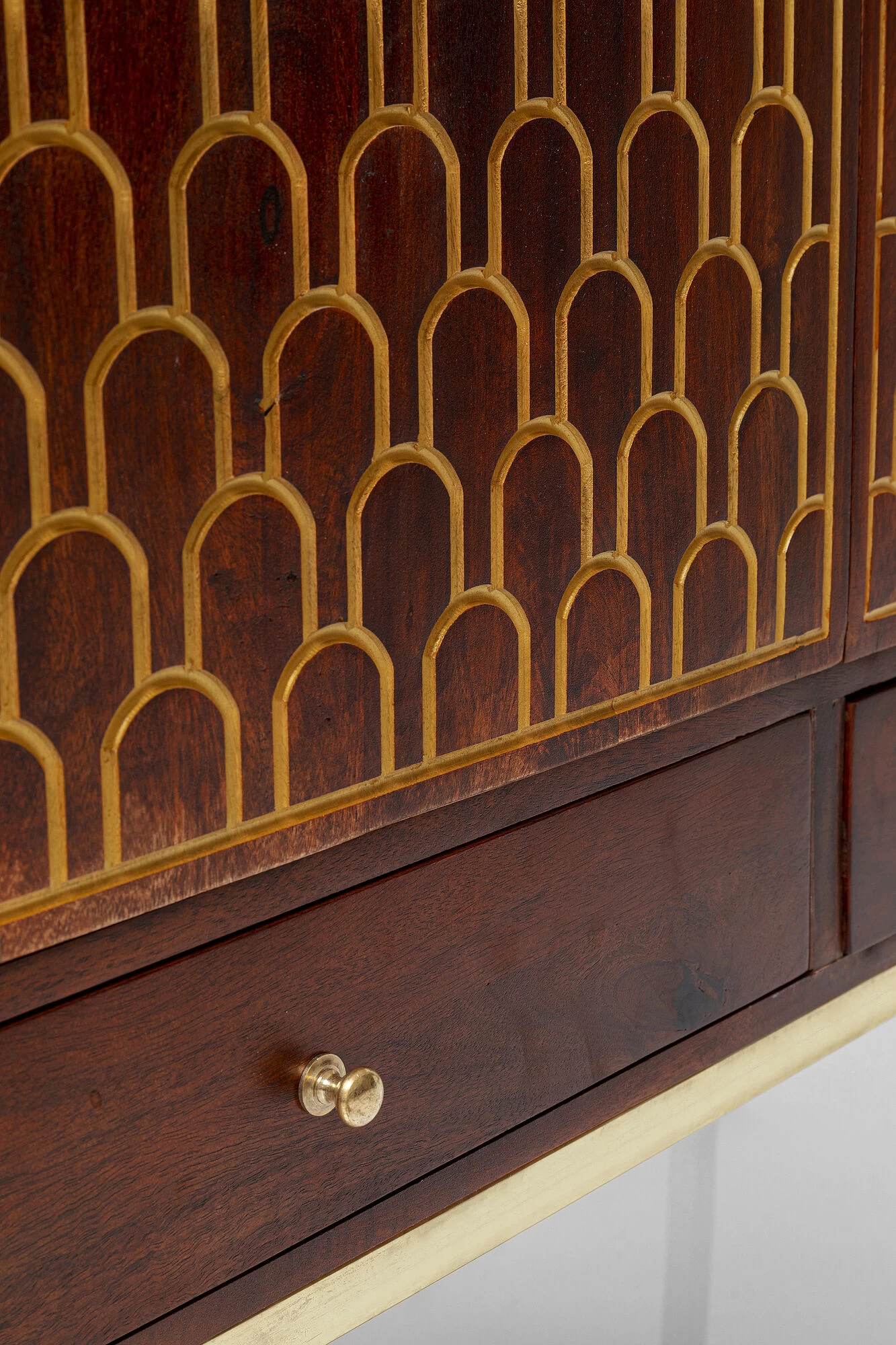 - Mannshoher Schrank aus Mango-Massivholz mit eingravierten, orientalischen Gold-Verzierungen, messingfarbenen Stahl-Beinen und vier Ablageflächen