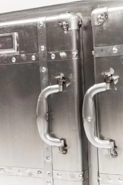 - Rechteckige, kompakte Kommode aus Stahl im Vintage-Look auf vier Rollen mit Schweißnähten und zwei großen Ablageflächen hinter den beiden Türen
