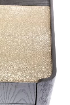 - Charaktervoll: die Verbindung von schwarz-braunem Eichenholz in massiv und furniert mit den cremefarbenen BezĂĽgen in extravaganter Rochenhaut-Optik