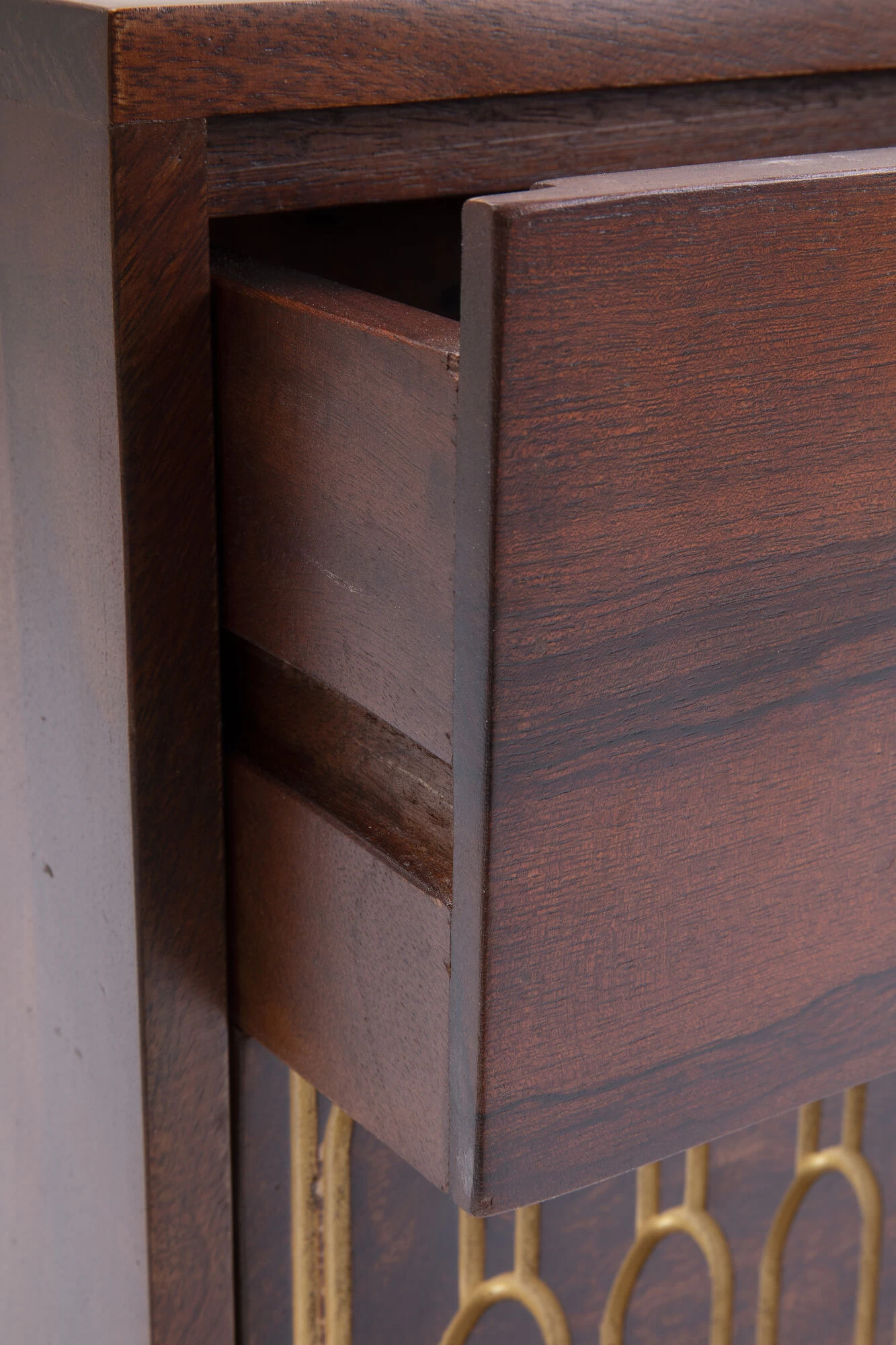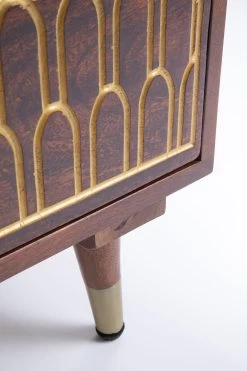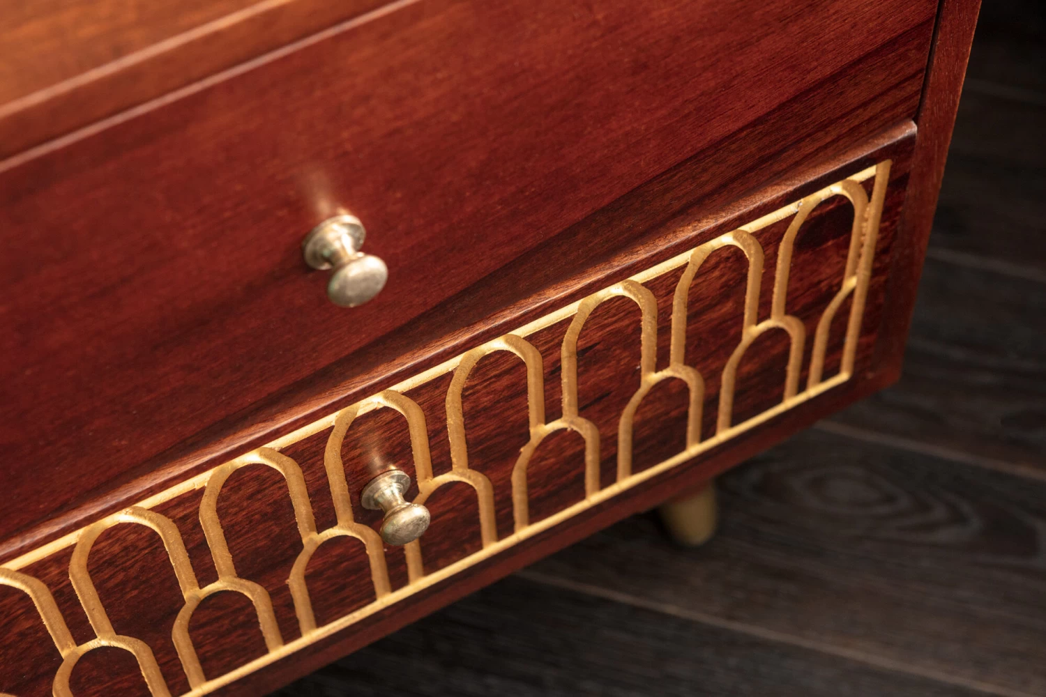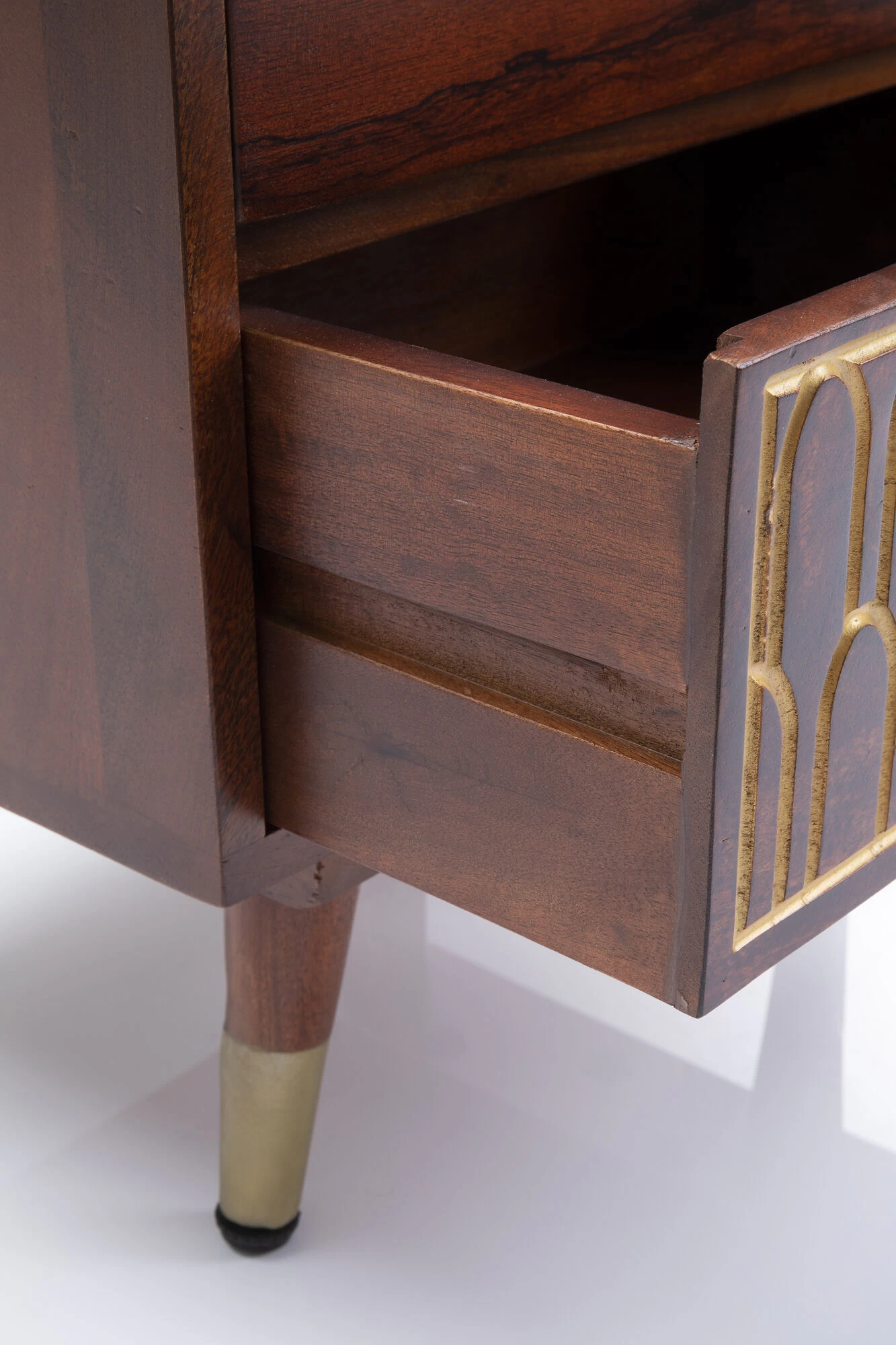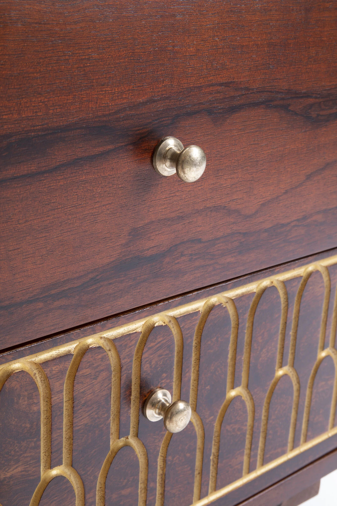 - Handgefertigte, kleine Kommode aus Mango-Massivholz mit eingravierten, orientalischen Gold-Verzierungen und zwei SchĂĽben