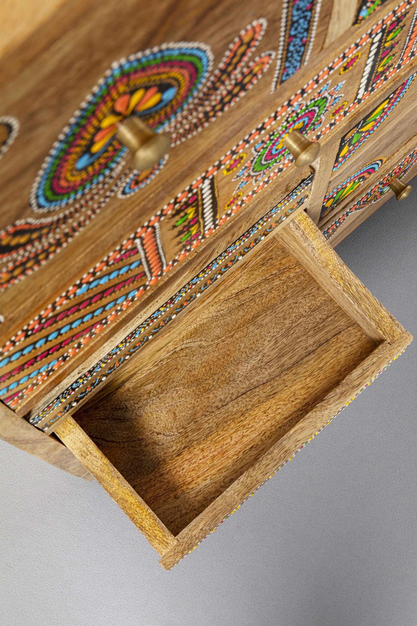 - Braune Kommode aus Mango-Massivholz mit verzierten Fronten, 79.5 x 115 x 36 Zentimeter (H/B/T)