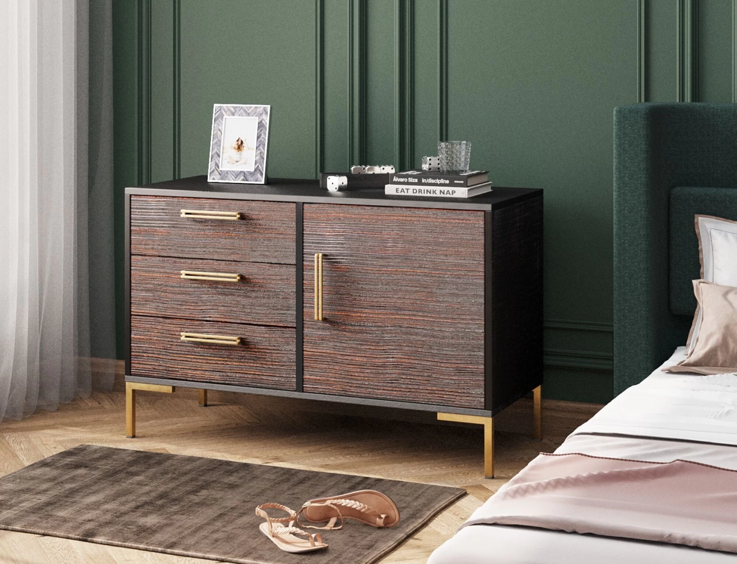 - Die stabilen Füße und edlen Griffe aus Metall setzen Goldakzente bei diesem modernen Sideboard