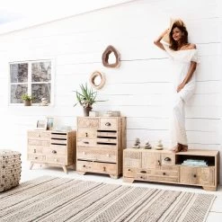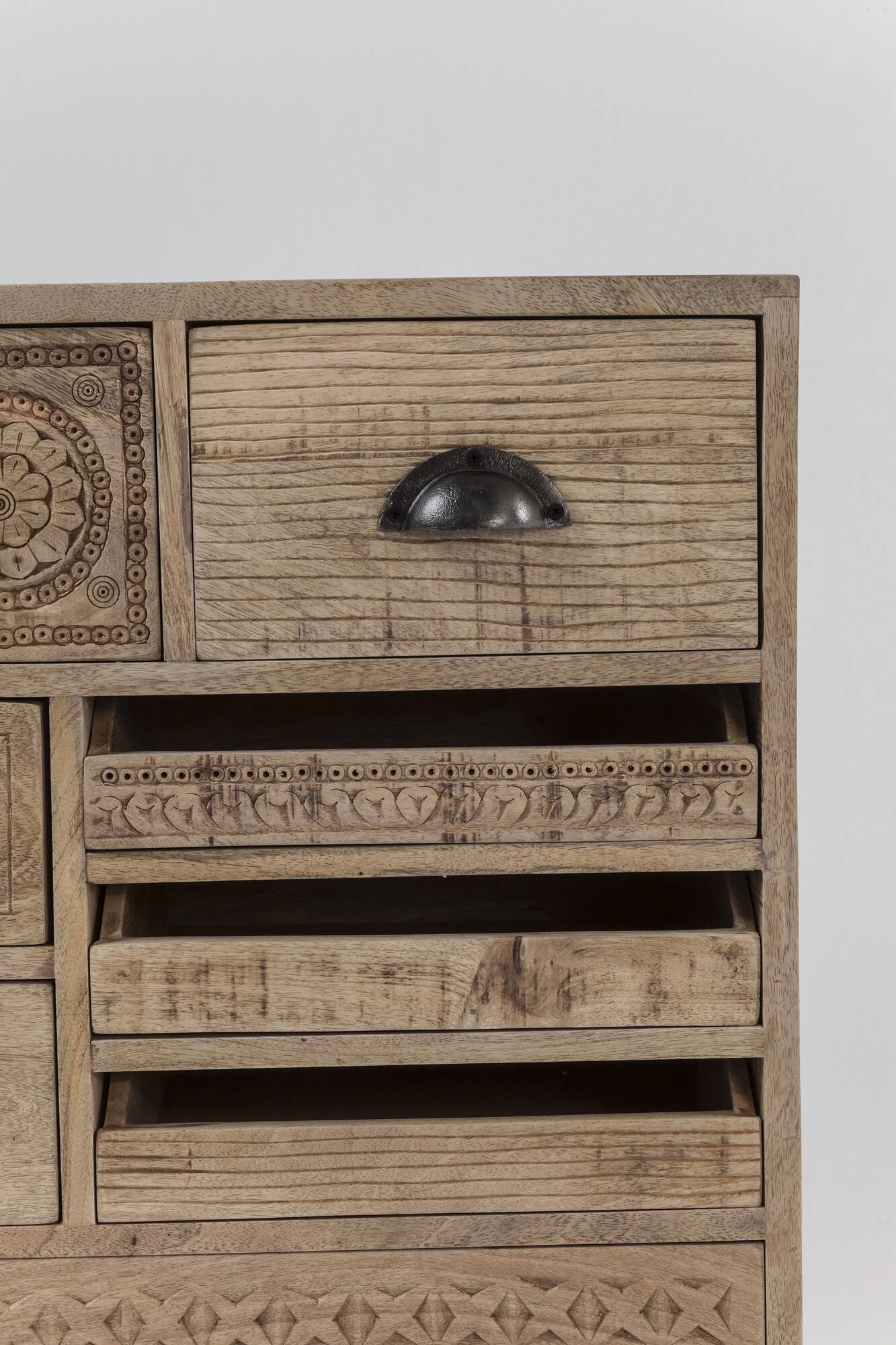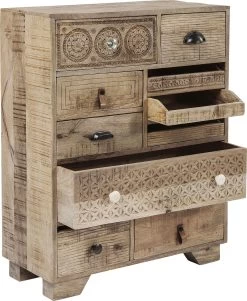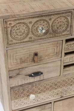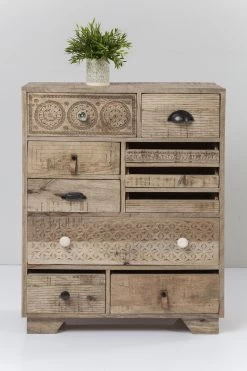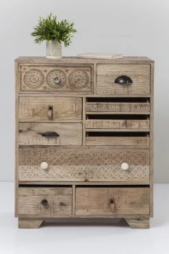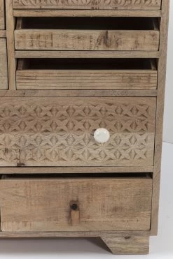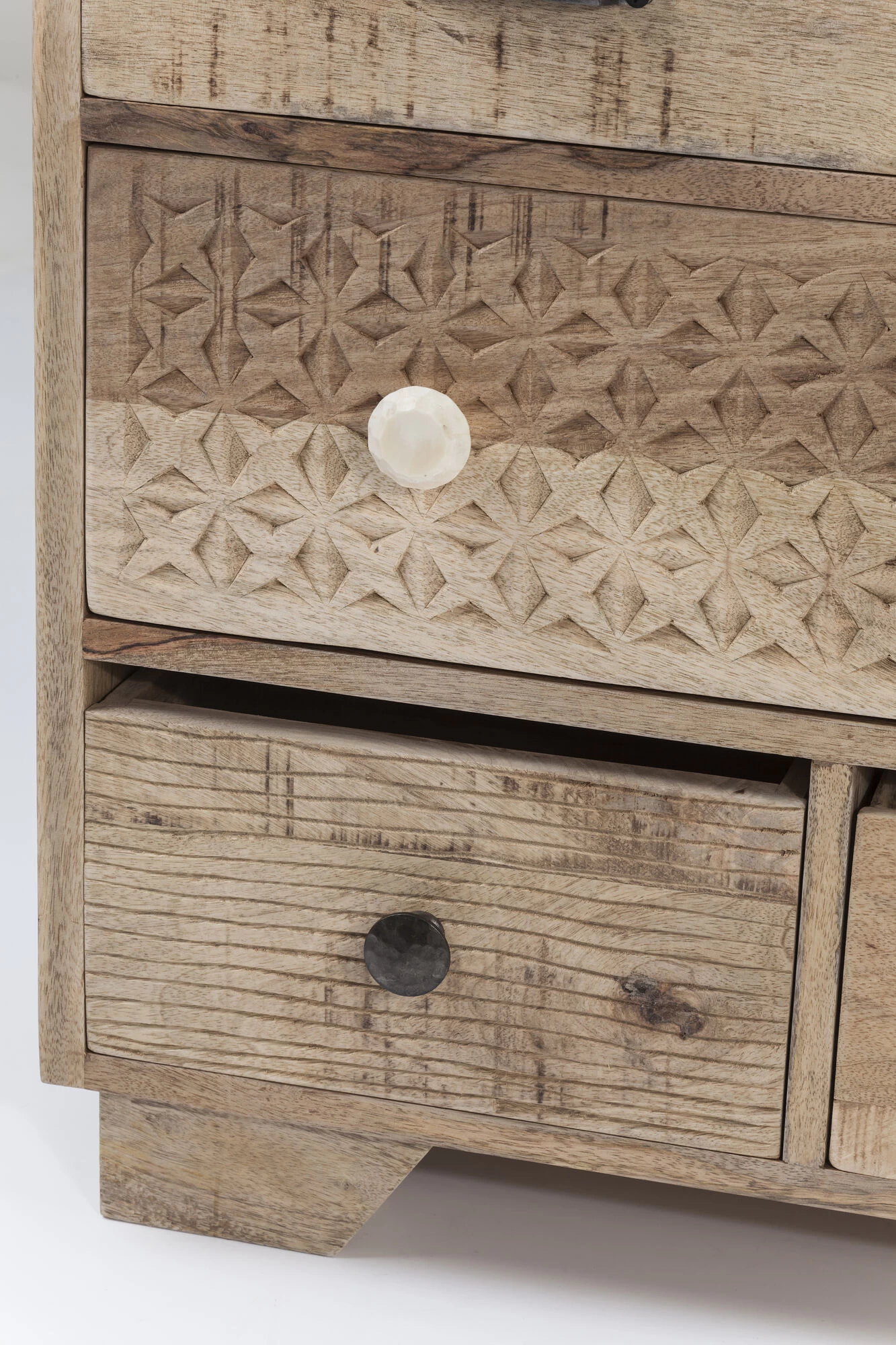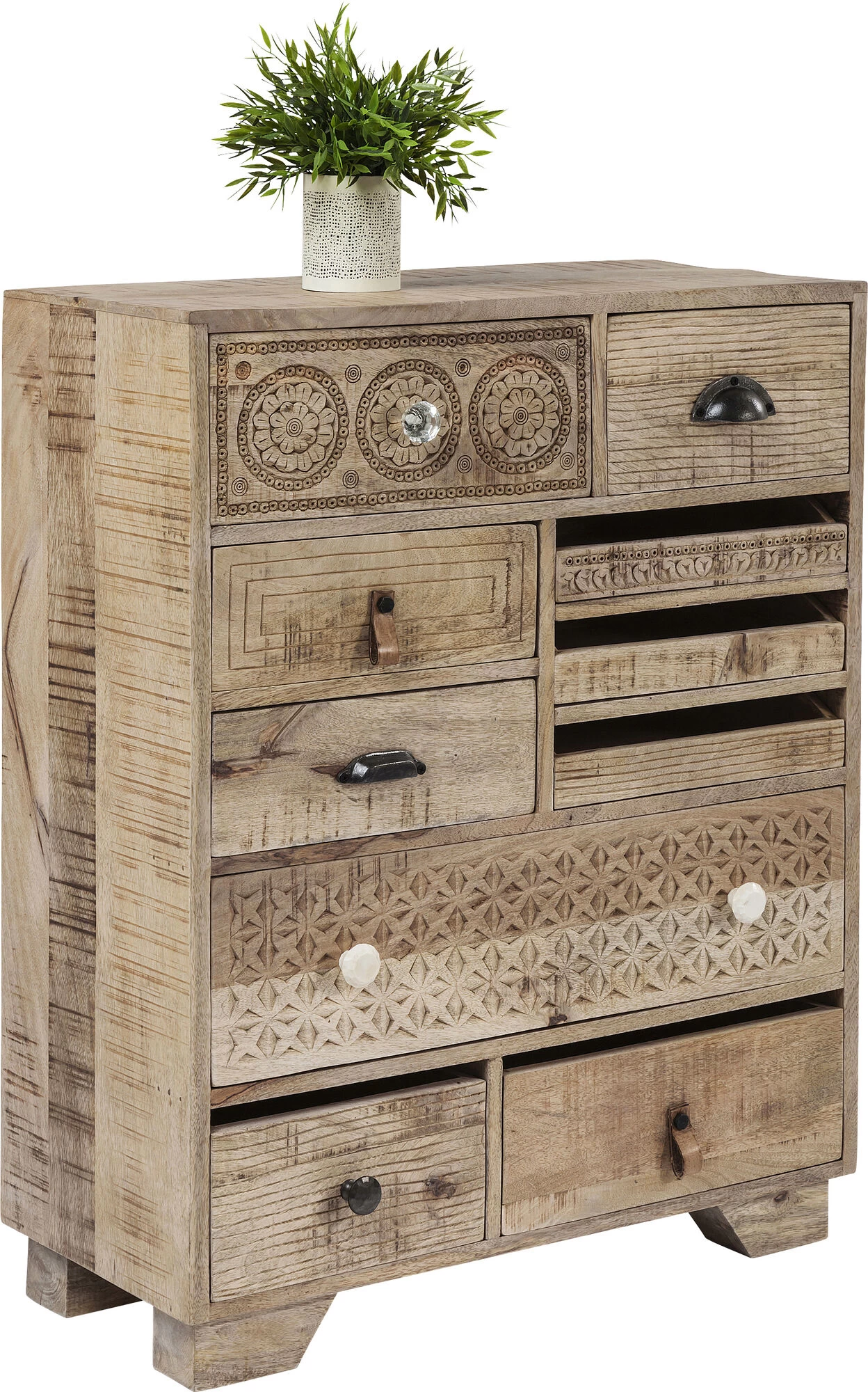 - Handgefertigte Kommode aus Mango-Massivholz mit dekorativen Schnitzereien und zehn Schüben mit individuellen Fronten