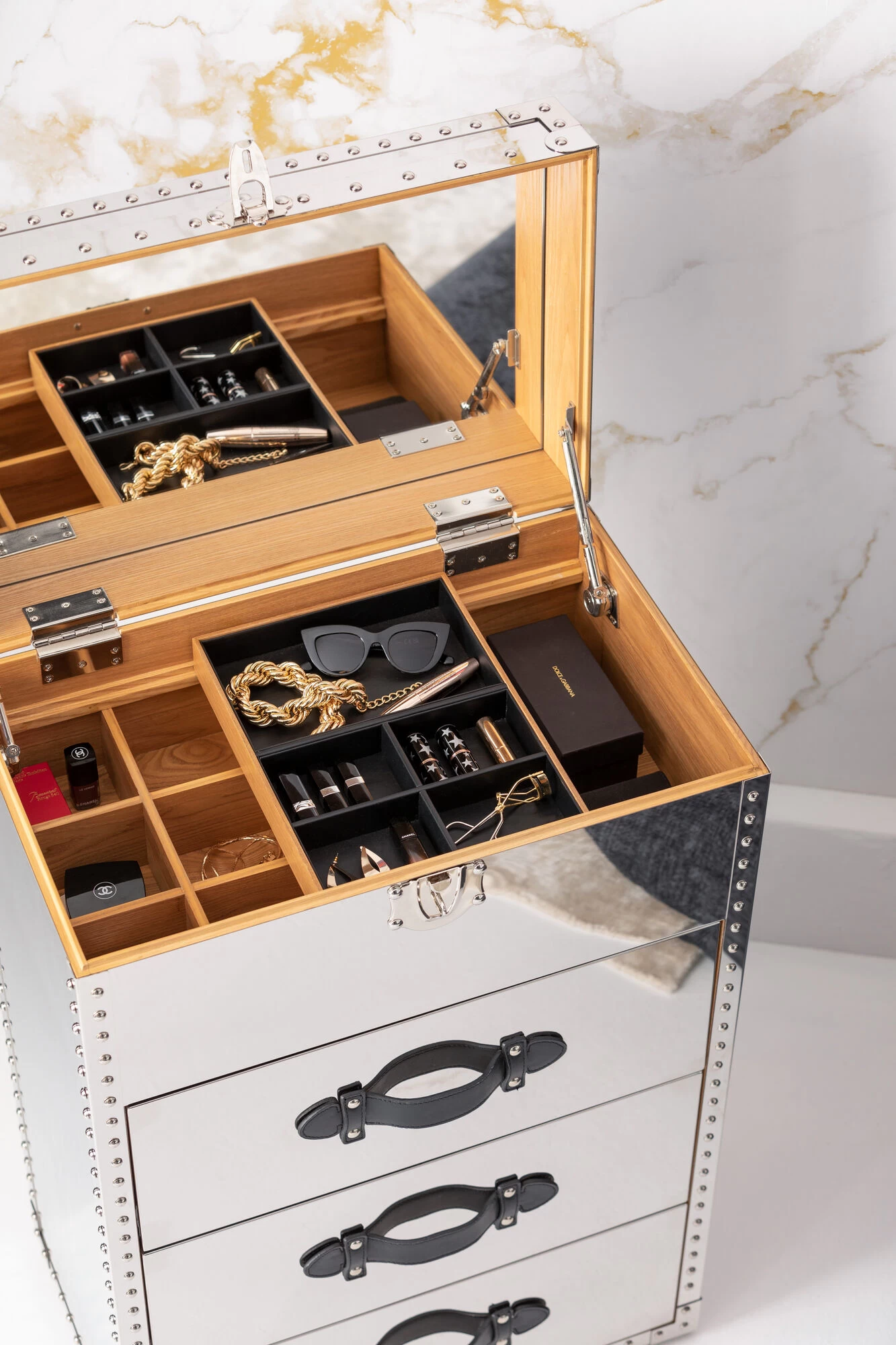 - Unterhalb des Spiegels finden Sie praktische Fächer und Einteilungen für Kleinkram