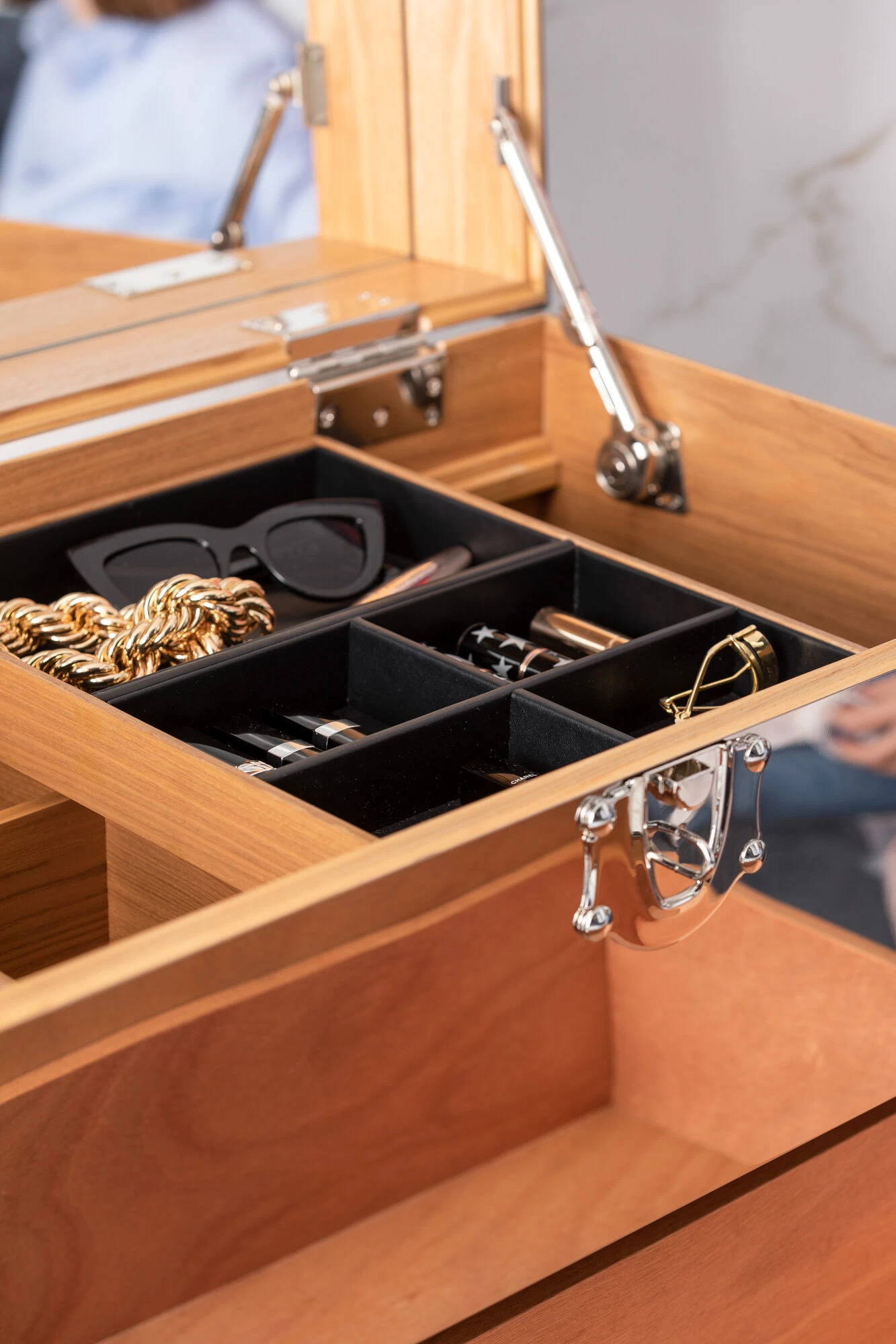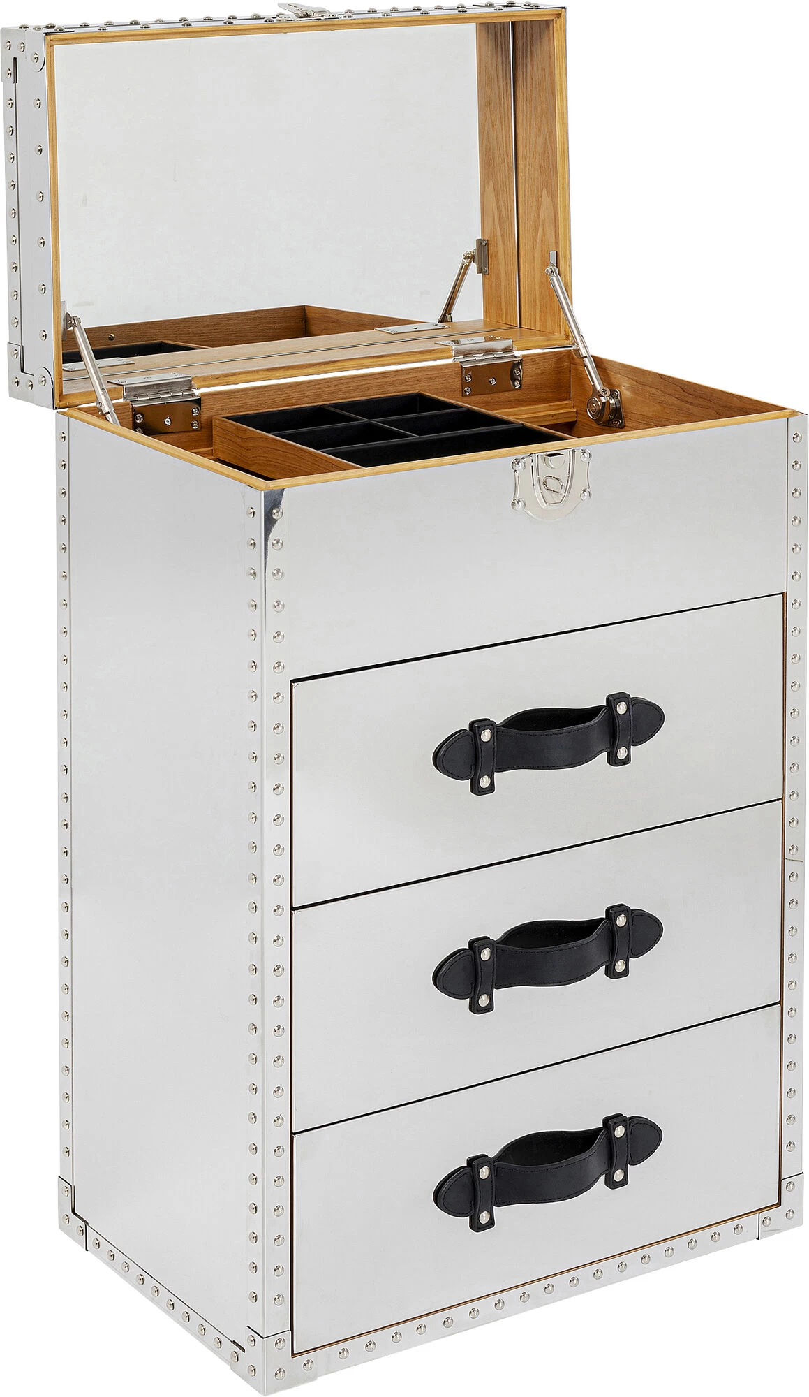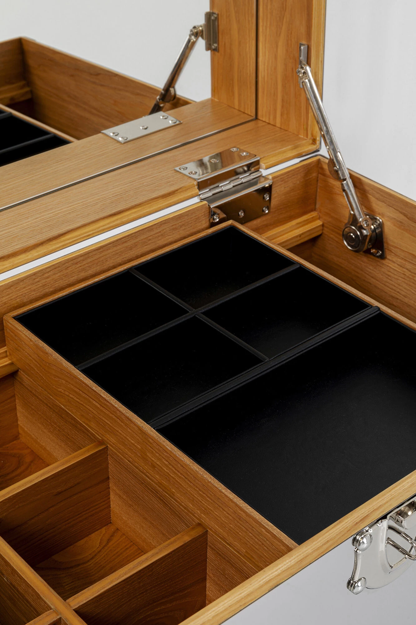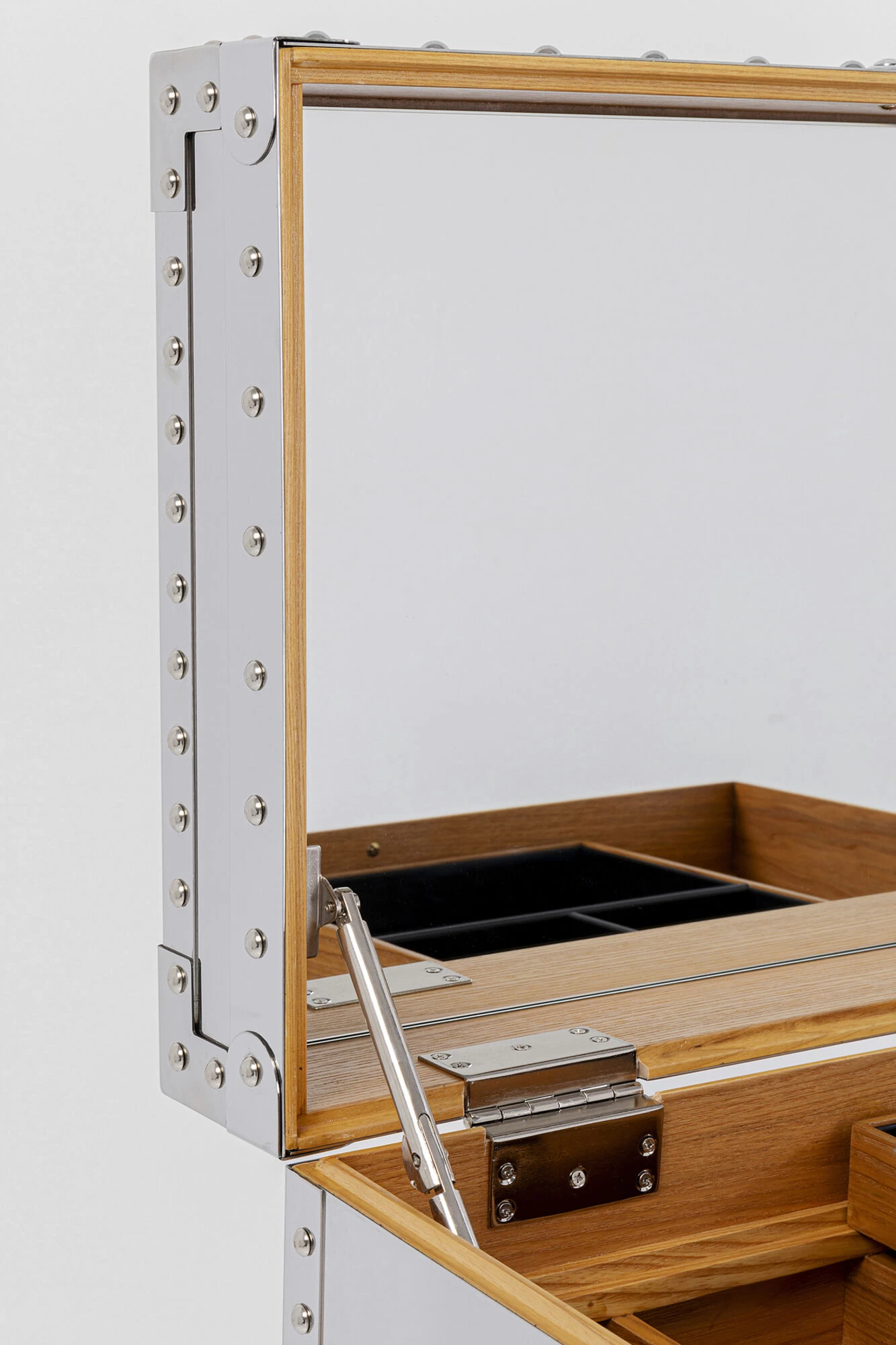 - Der aufklappbare Deckel des Schminktisches ist mit einem Spiegel ausgestattet