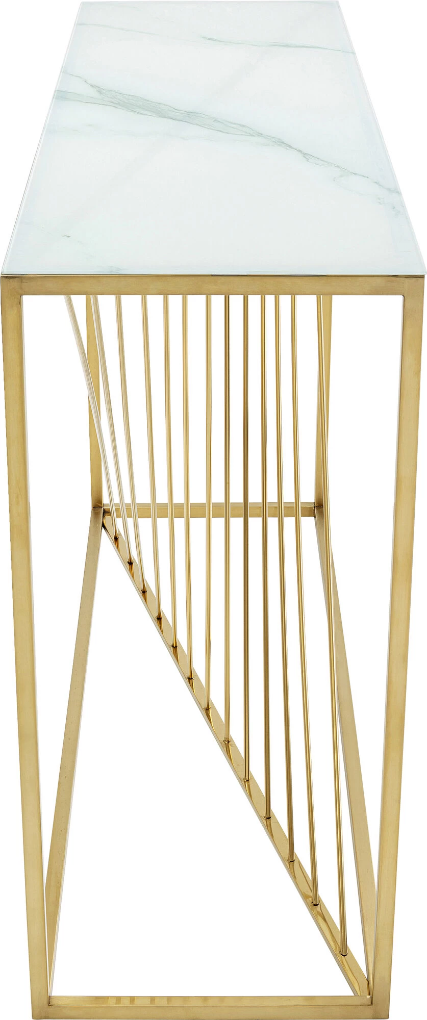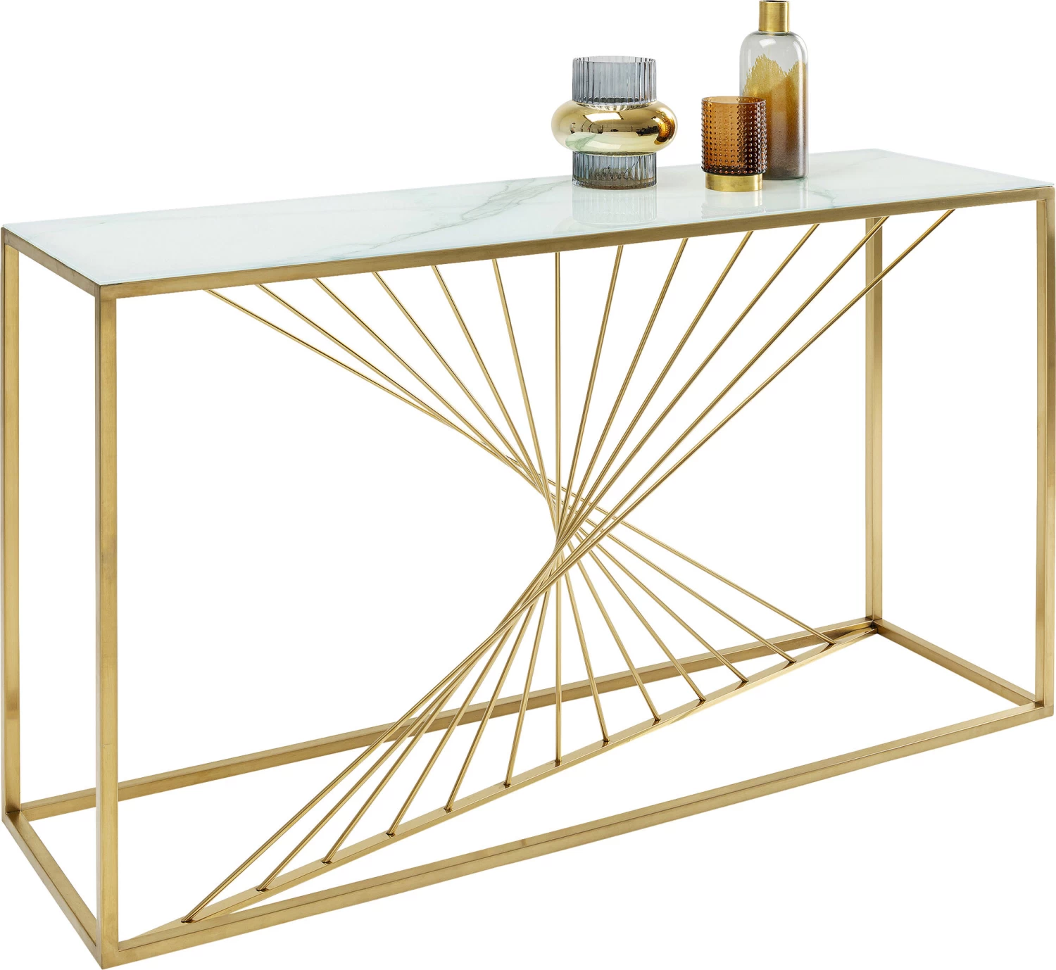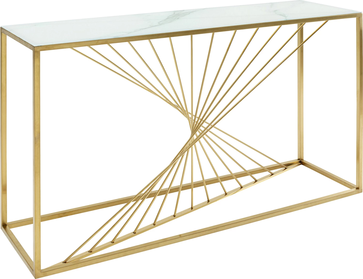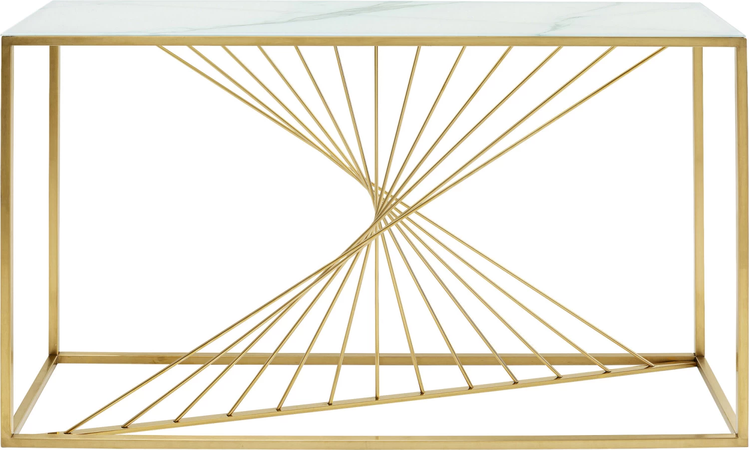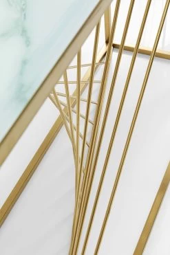 - Goldfarbene Konsole mit exklusivem Gestell und einer Glasplatte in Marmor-Optik
