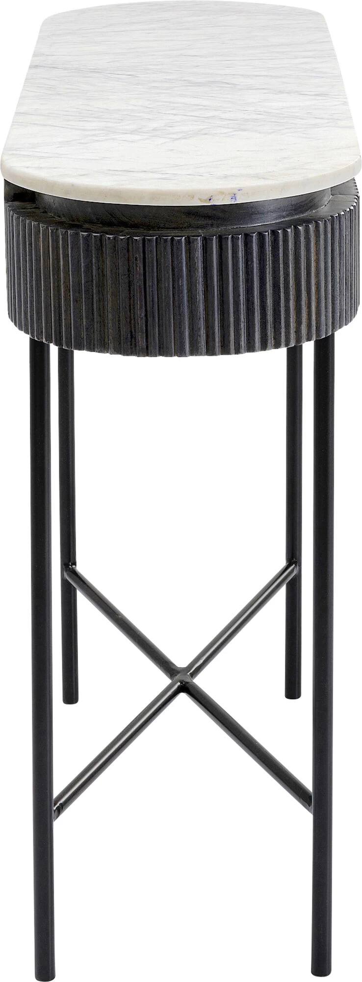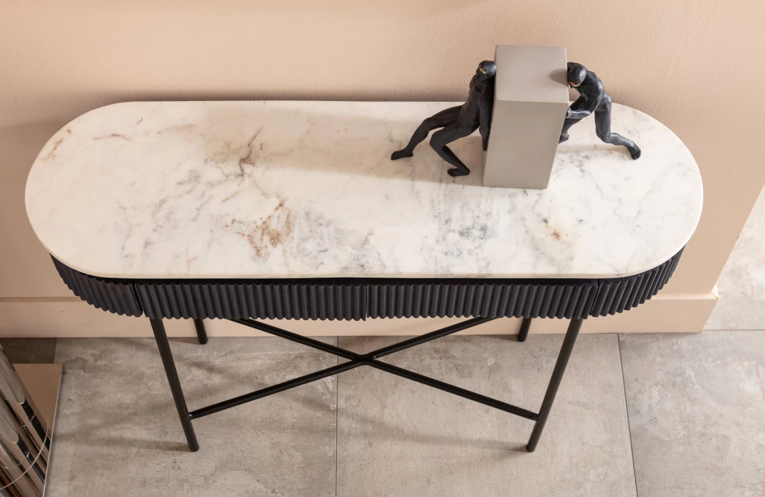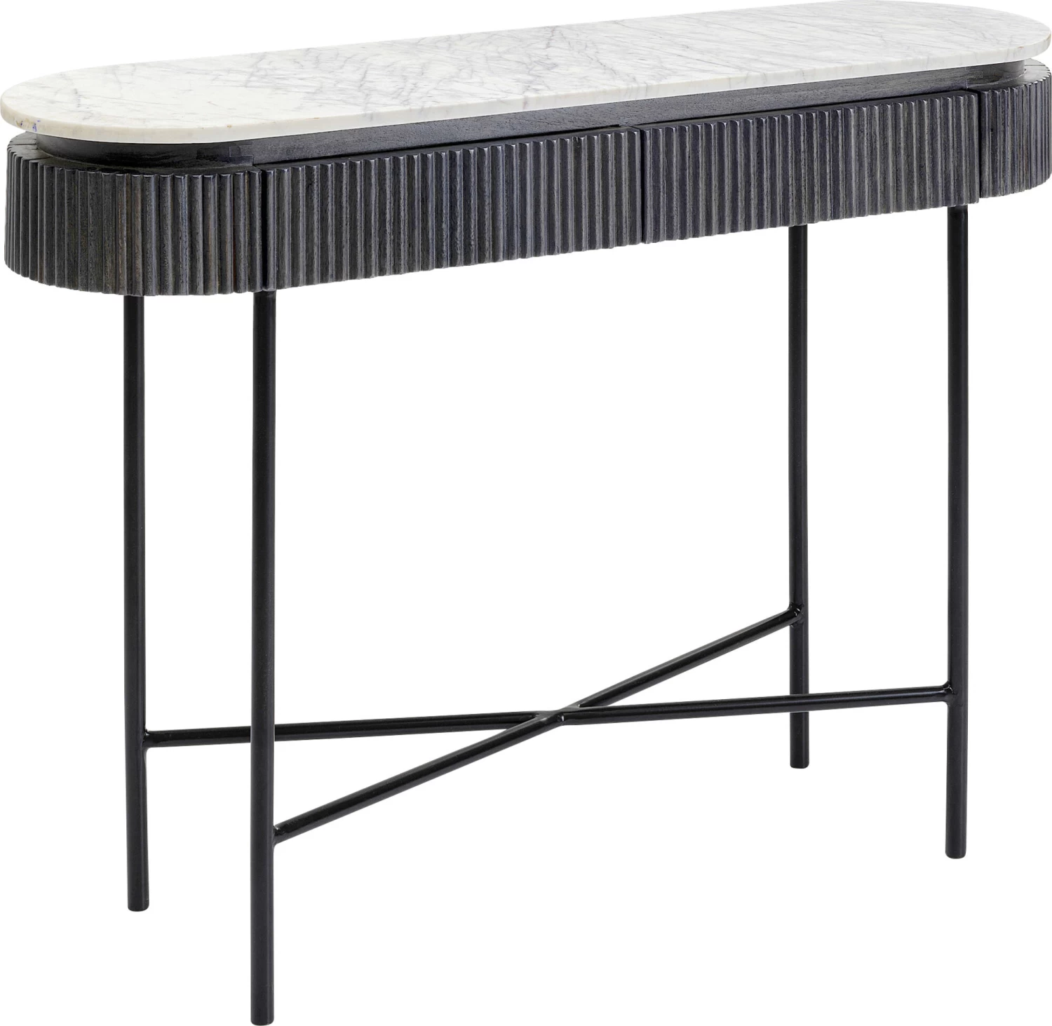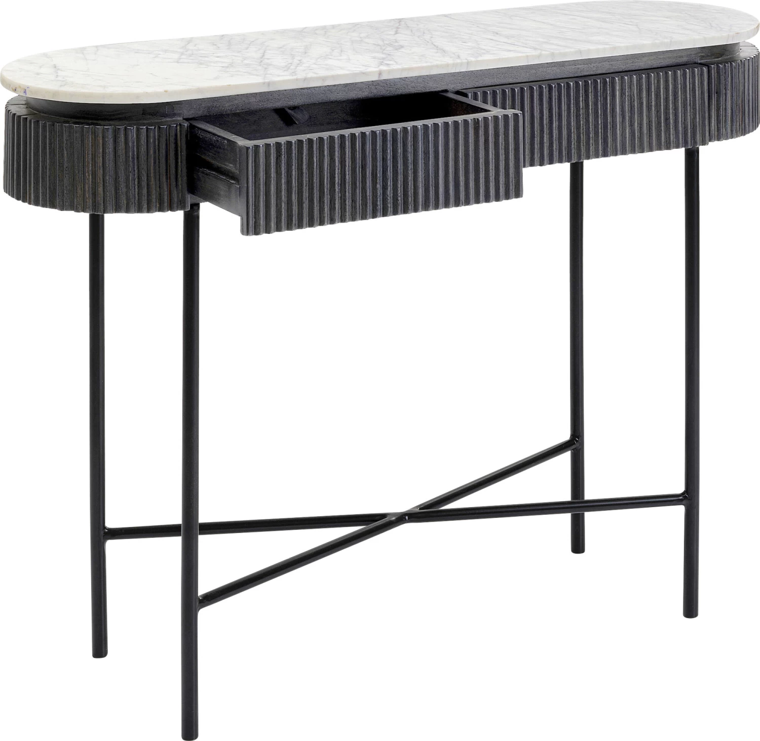 - Spielt mit dem Schwarz-WeiĂź-Kontrast: elegante Flurkonsole mit heller Marmorplatte und dunkelgrauem Massivholz-Korpus auf filigranem Stahlgestell in Schwarz