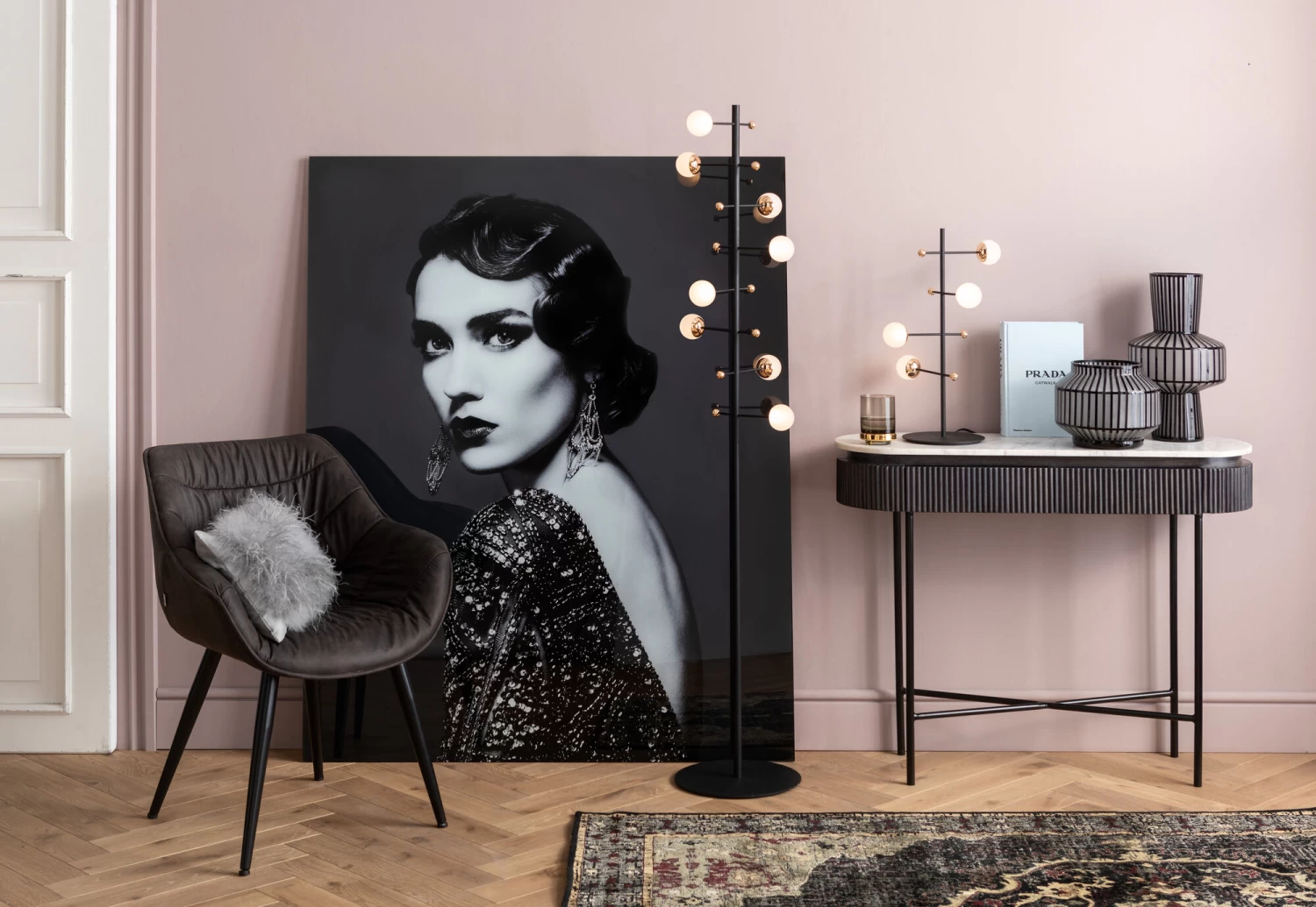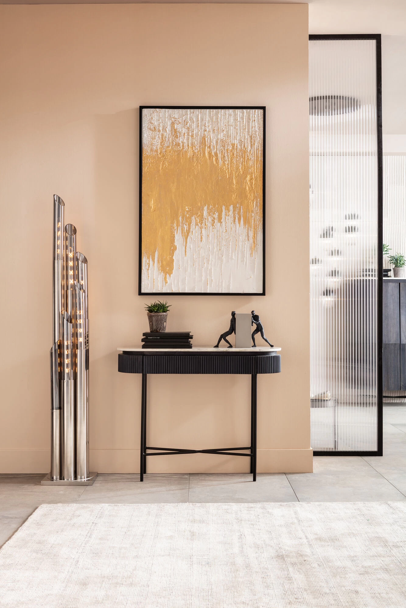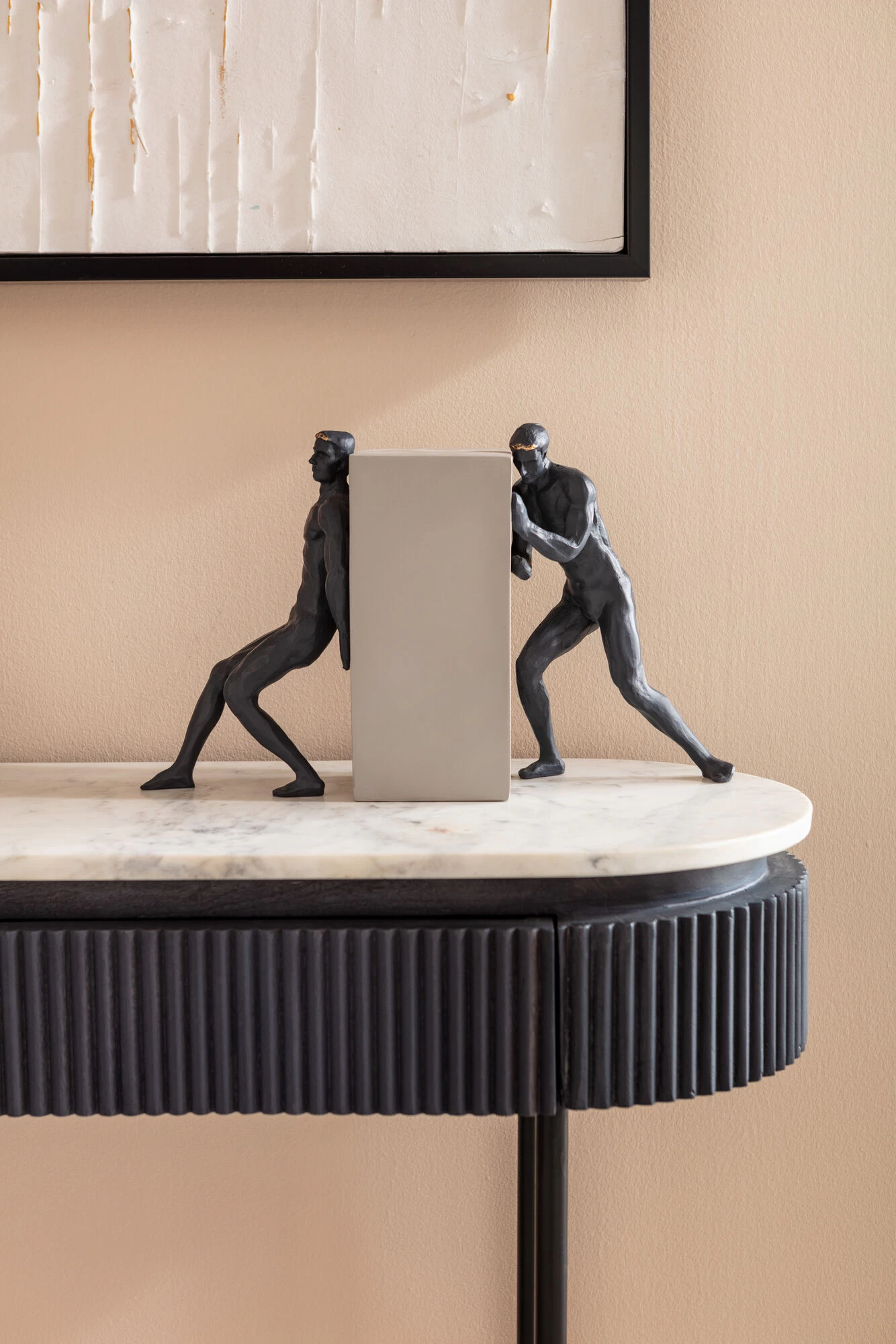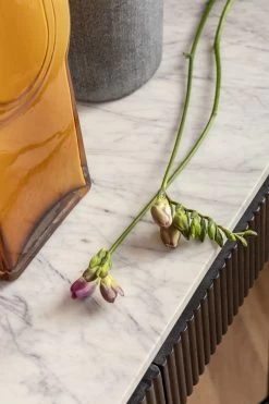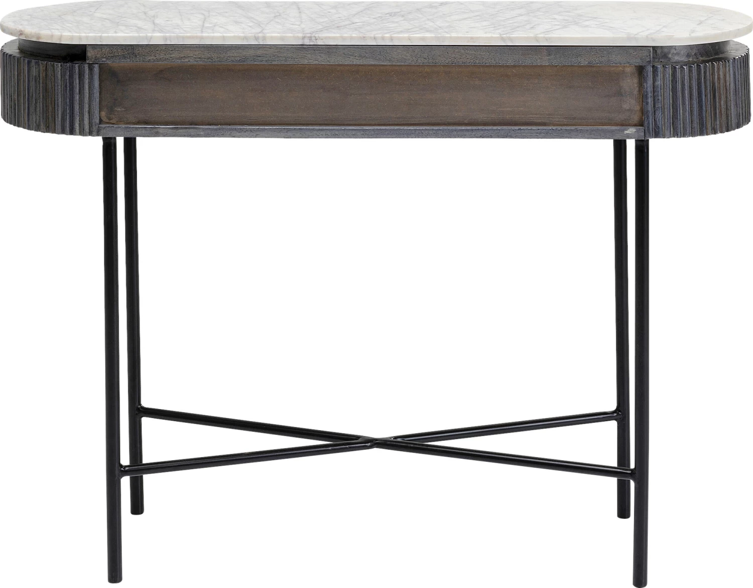 - Spielt mit dem Schwarz-WeiĂź-Kontrast: elegante Flurkonsole mit heller Marmorplatte und dunkelgrauem Massivholz-Korpus auf filigranem Stahlgestell in Schwarz