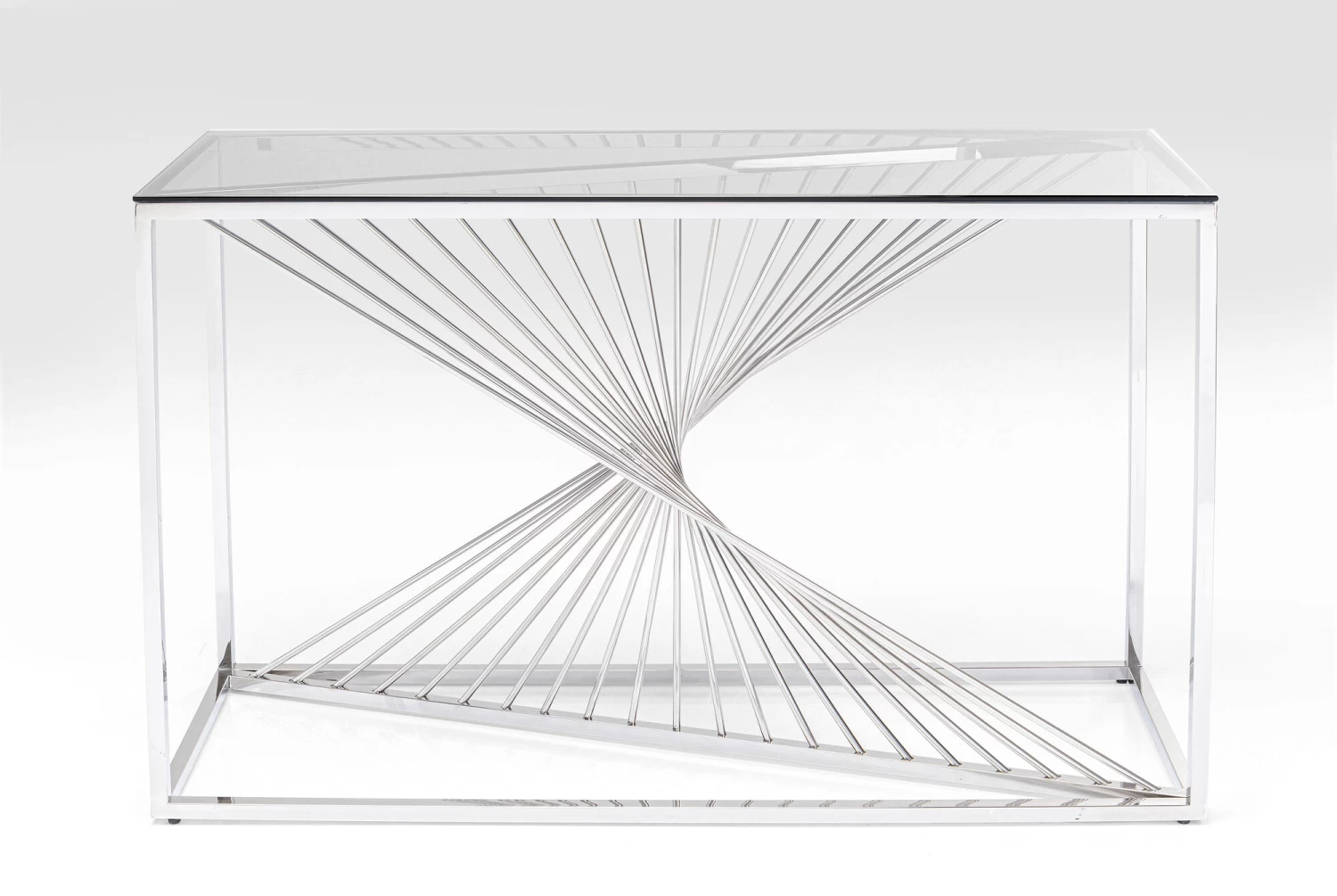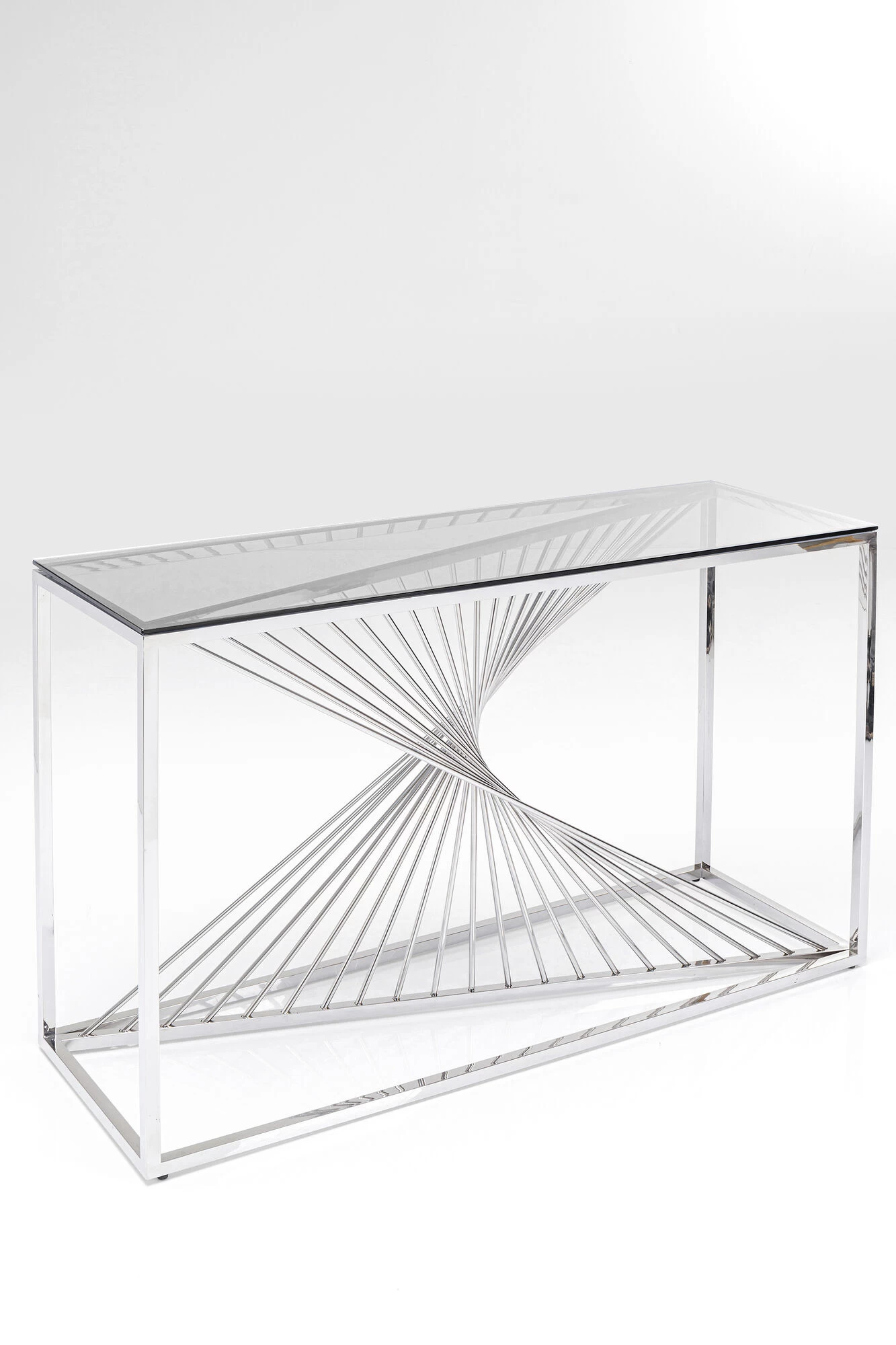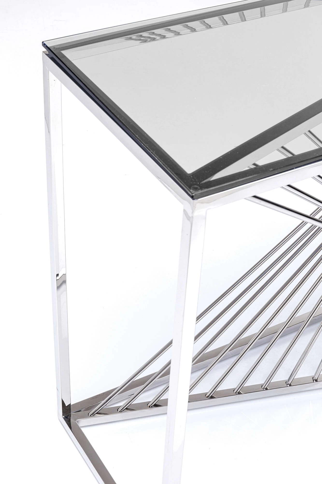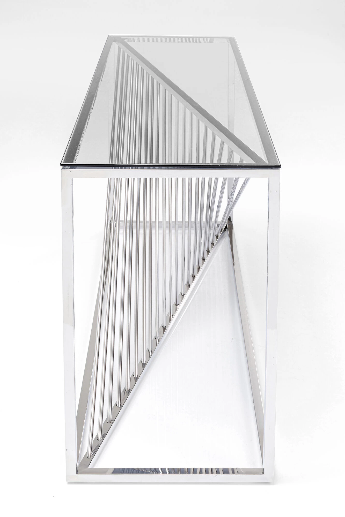 - Repräsentative, silbrig glänzende Konsole aus poliertem Edelstahl mit exklusivem Gestell und Glasplatte