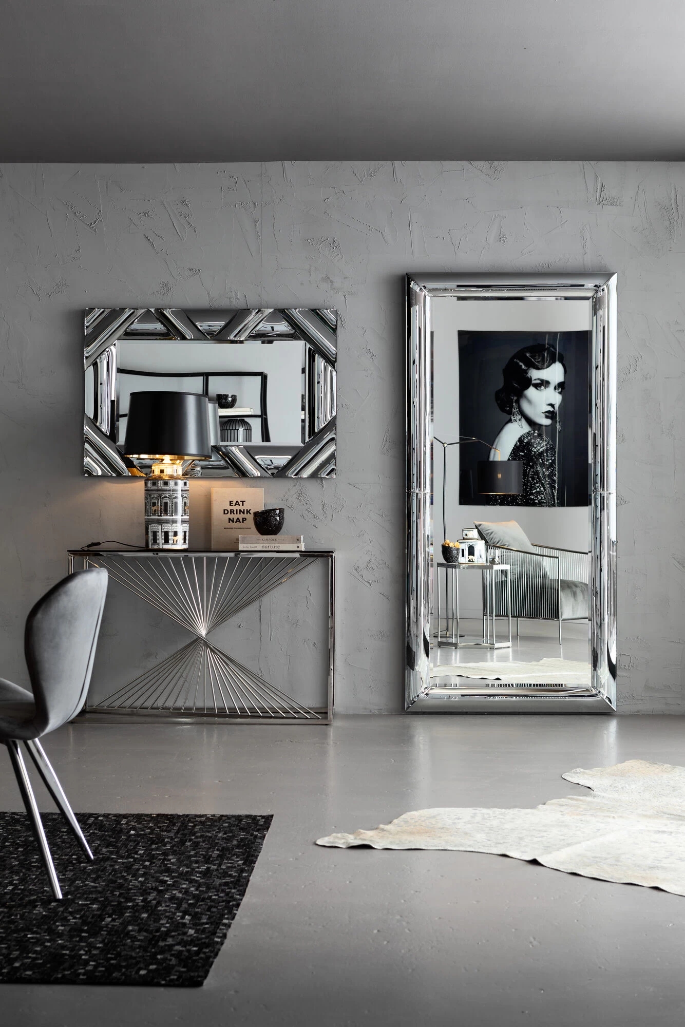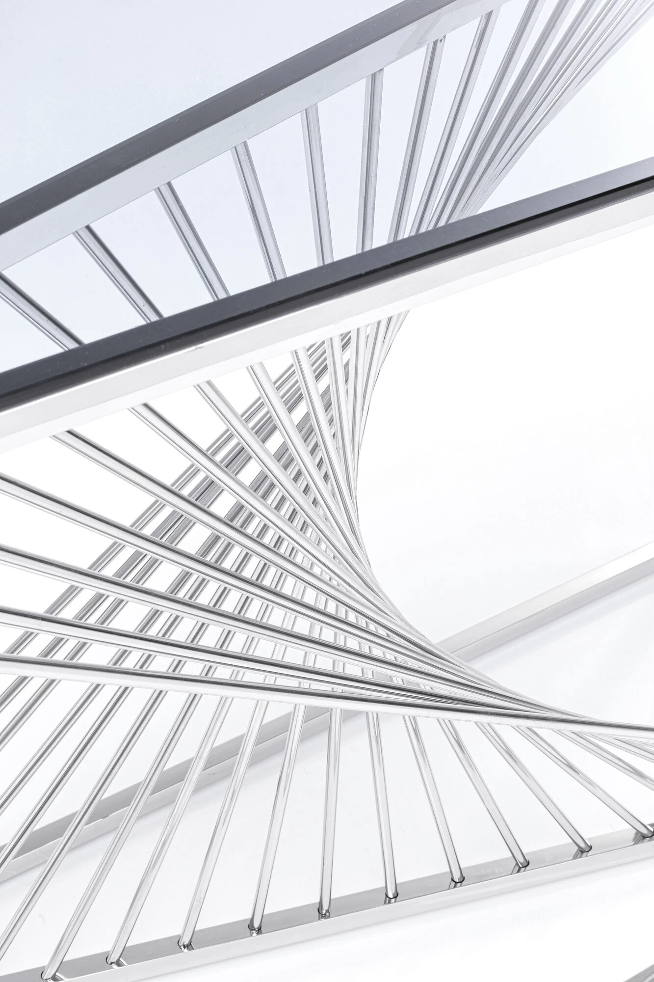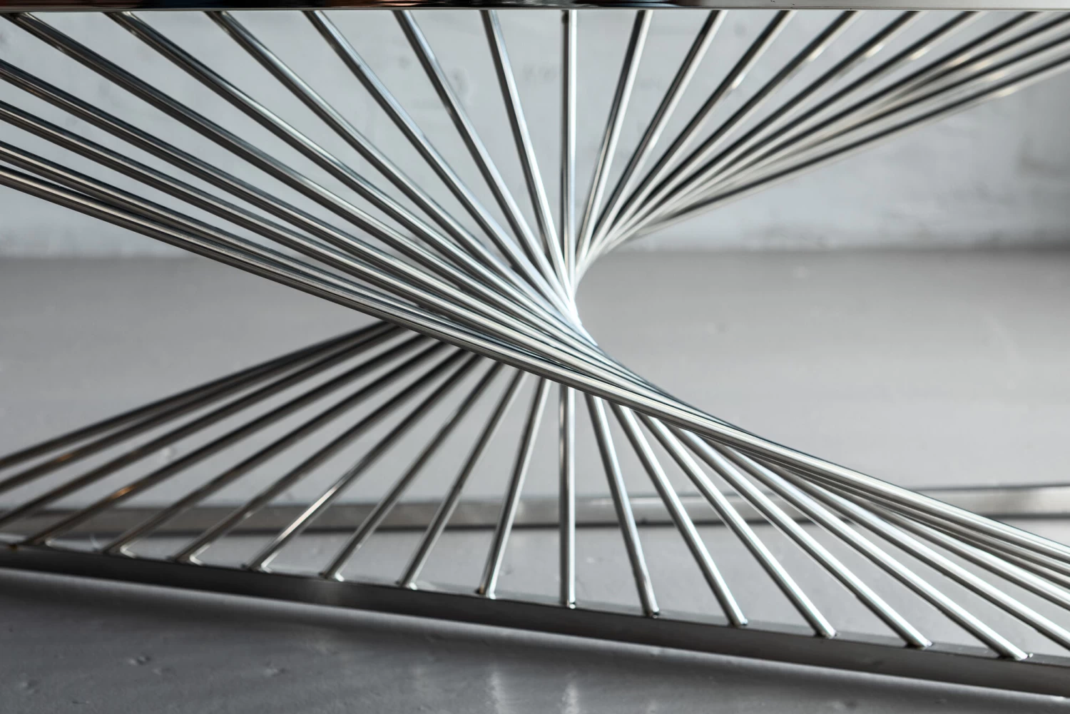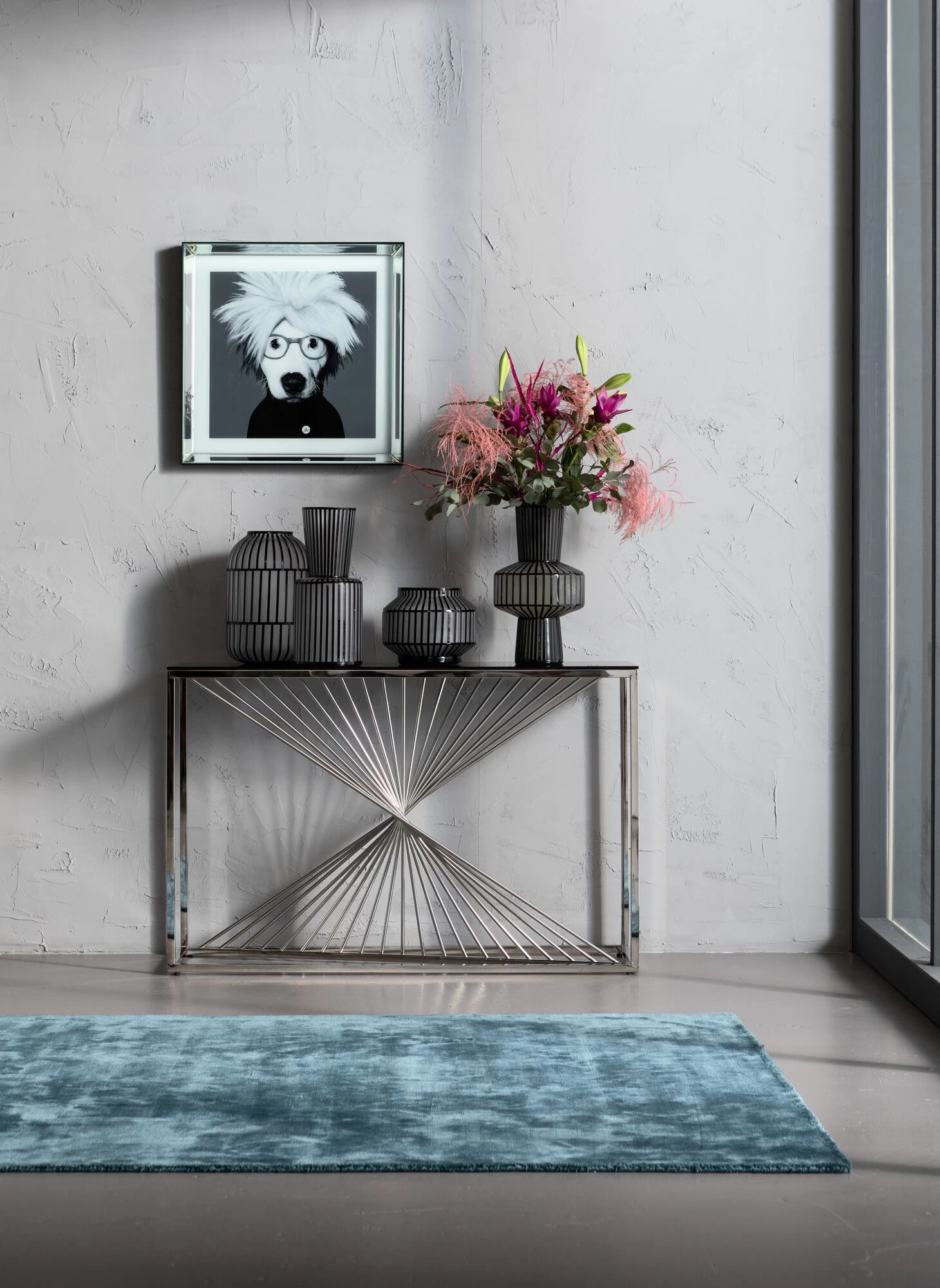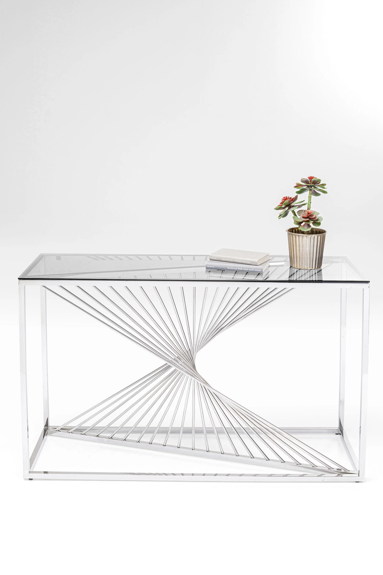 - Repräsentative, silbrig glänzende Konsole aus poliertem Edelstahl mit exklusivem Gestell und Glasplatte