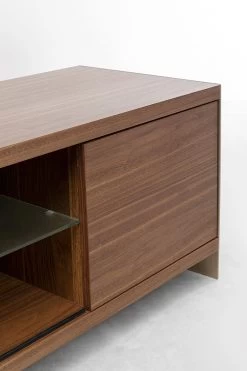 - Das TV-Board ist hochwertig mit vernickeltem Edelstahl, satiniertem Glas und Walnuss-Furnierholz gearbeitet