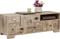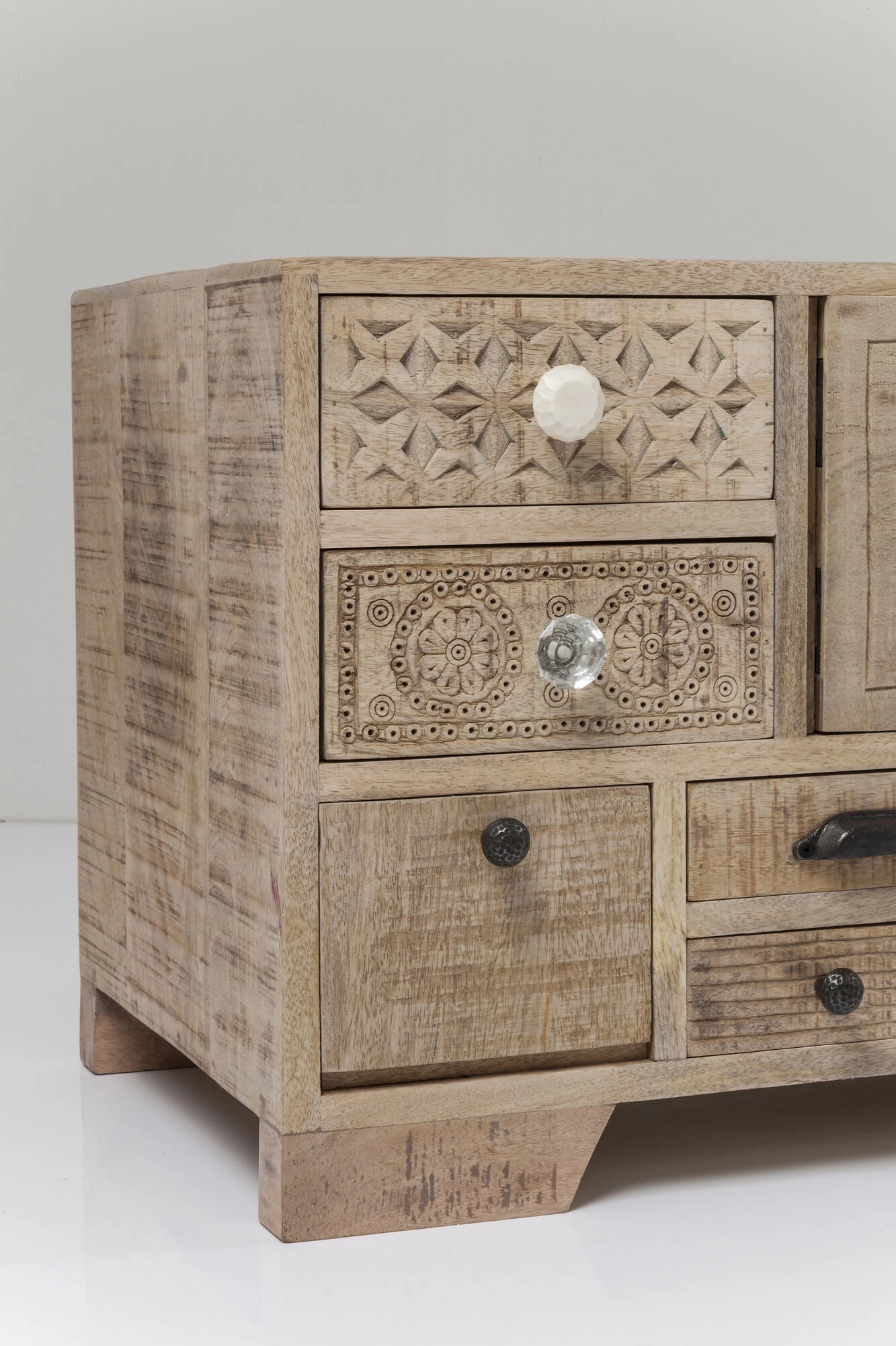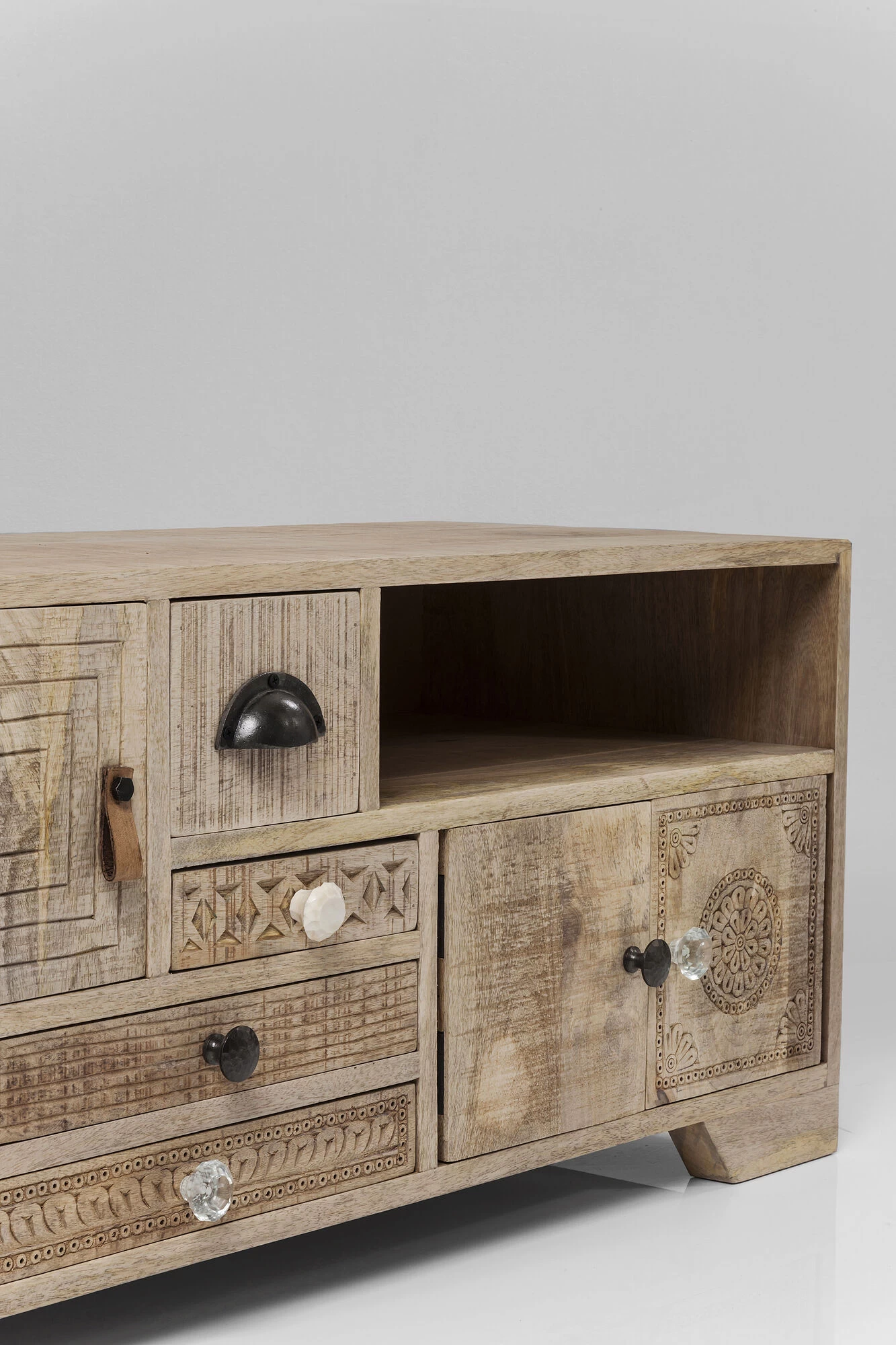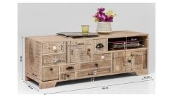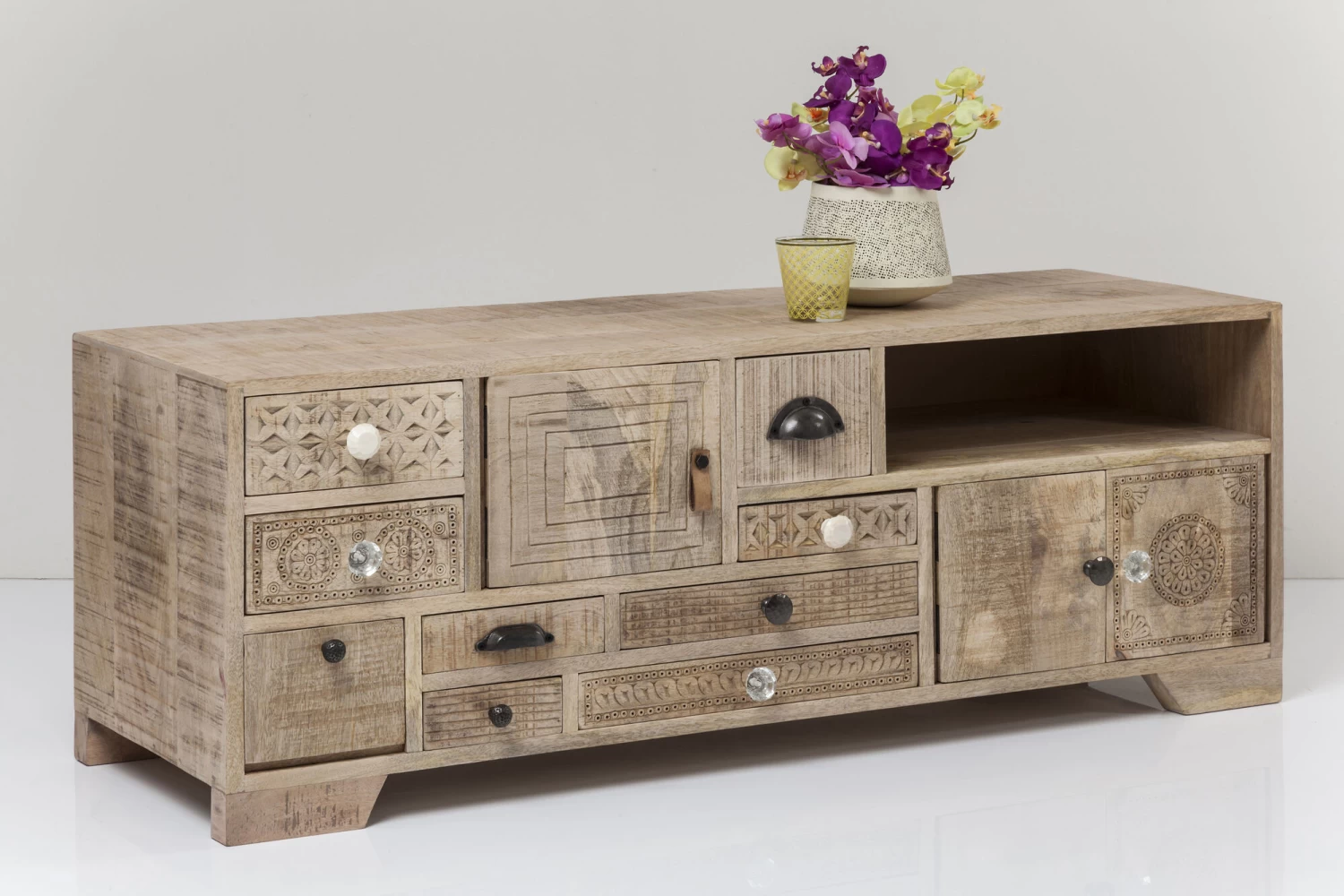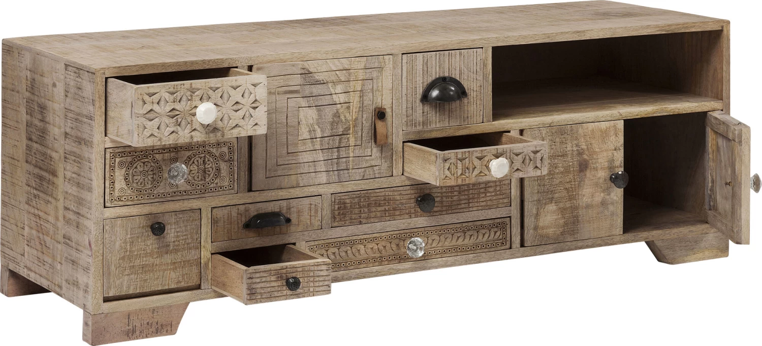 - Handgefertigtes TV-Board aus Mango-Massivholz mit neun SchĂĽben, drei TĂĽren mit einem Boden dahinter, einem offenen Boden und Kabeldurchlass hinten