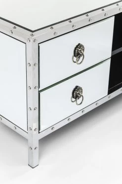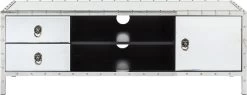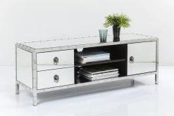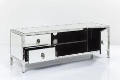 - TV-Board mit Spiegelglas-Verkleidung und Facettenschliff, Stahl-Gestell, Deko-Nieten, zwei Schüben, einem Einlegeboden und Kabeldurchlass hinten