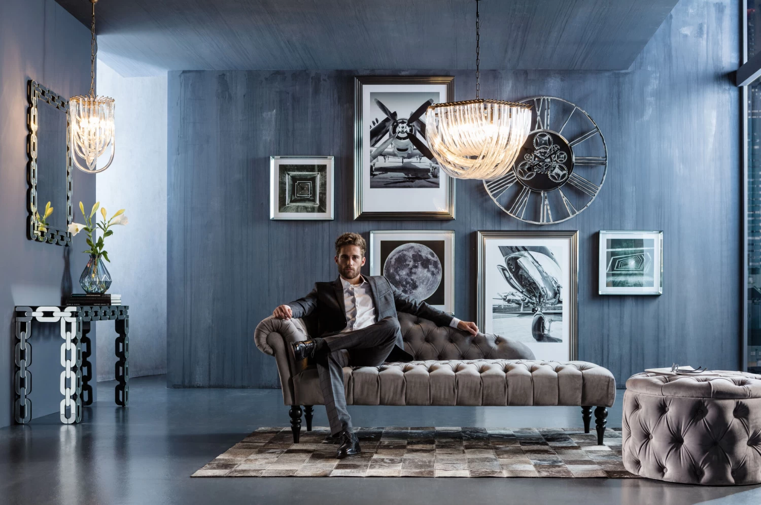 - Die elegant geschwungene Arm- und RĂĽckenlehne und der Chesterfield-Style setzen Wow-Akzente im Wohnzimmer