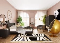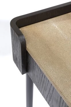- Charaktervoll: die Verbindung von schwarz-braunem Eichenholz in massiv und furniert mit den cremefarbenen BezĂĽgen in extravaganter Rochenhaut-Optik