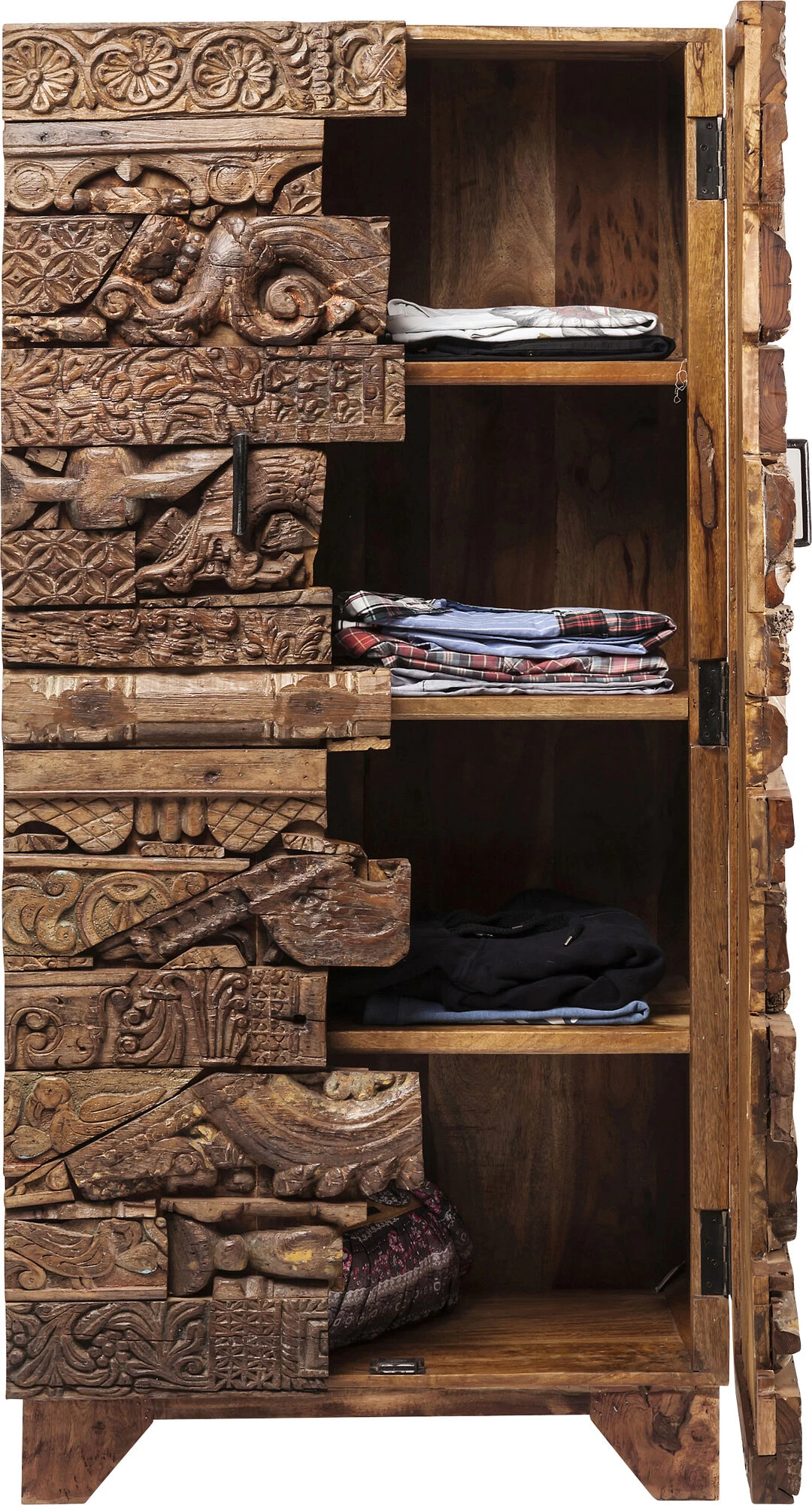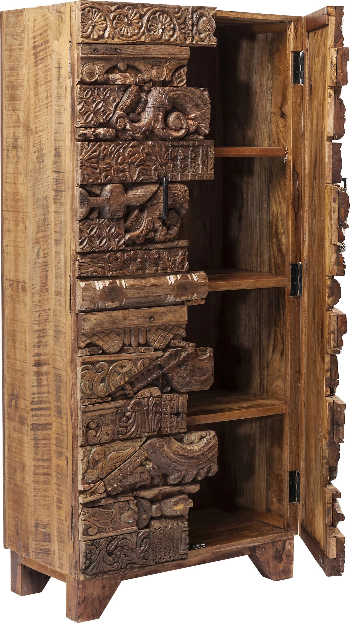 - Rechteckiger, mannshoher Schrank aus Mango-Massivholz mit handgeschnitzten Ornamenten und vier Fachböden hinter zwei Türen