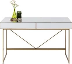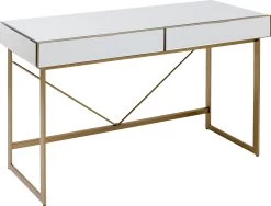 - Schreibtisch 120 x 50 cm mit verspiegelter Tischplatte und Spiegel-Fronten sowie einem Metall Gestell in der Farbe Gold