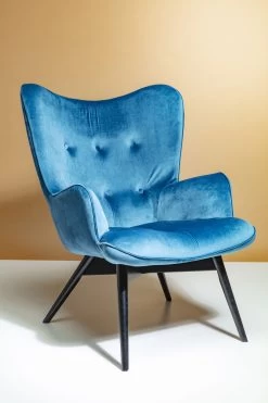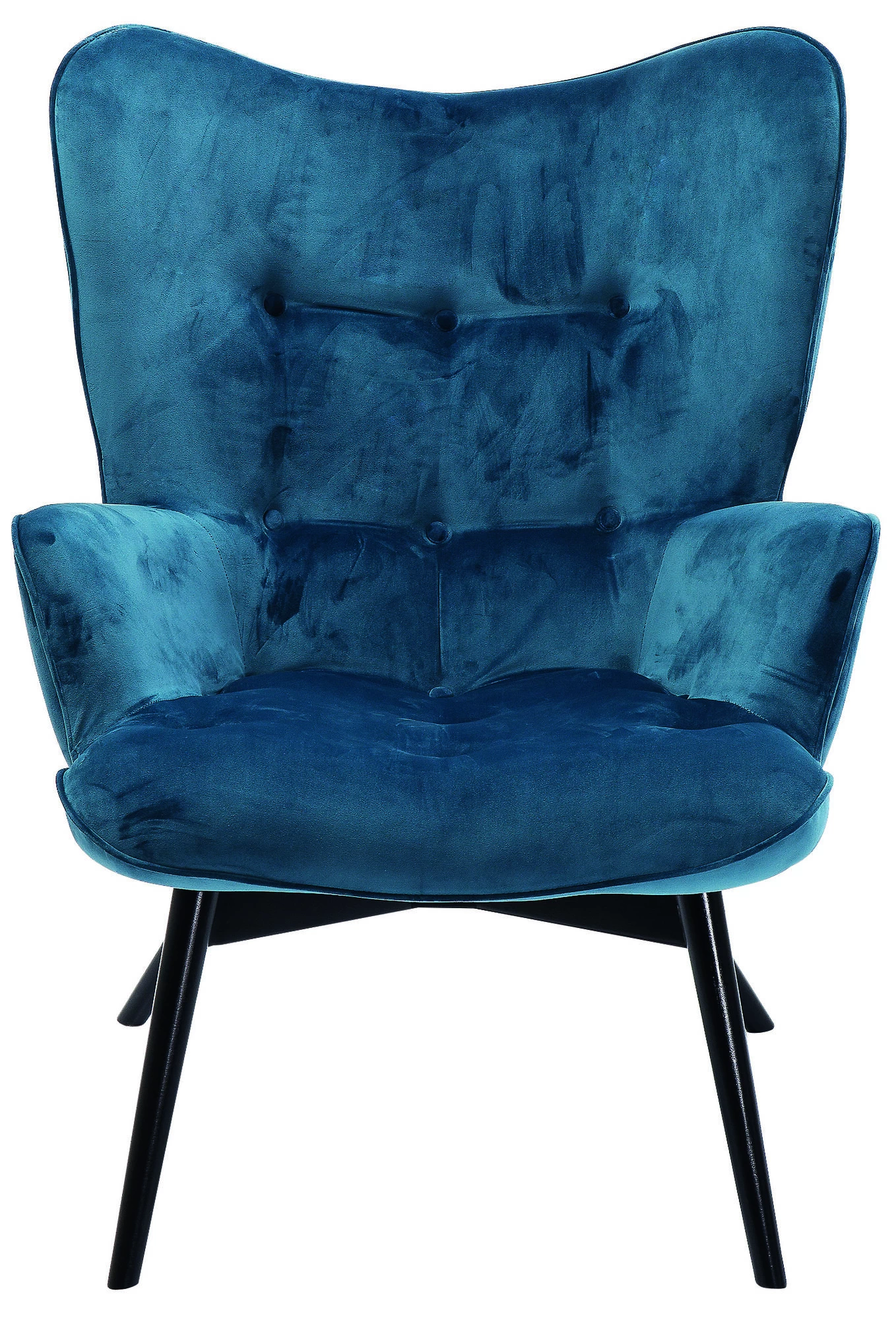 - Ein moderner, bequemer Polstersessel im Retro Design – die Neuauflage des klassischen Ohrensessels. Hier in samtigem Petrol-Blau mit schwarzen Beinen