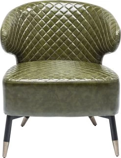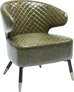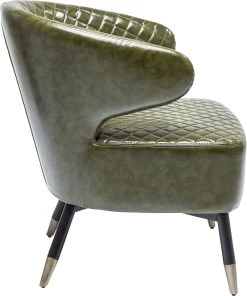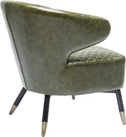- Grüner Cocktailsessel in edler Vintage-Leder-Optik mit markanter Rautensteppung auf Sitz und Rückenlehne und schwarzen Stahlbeinen