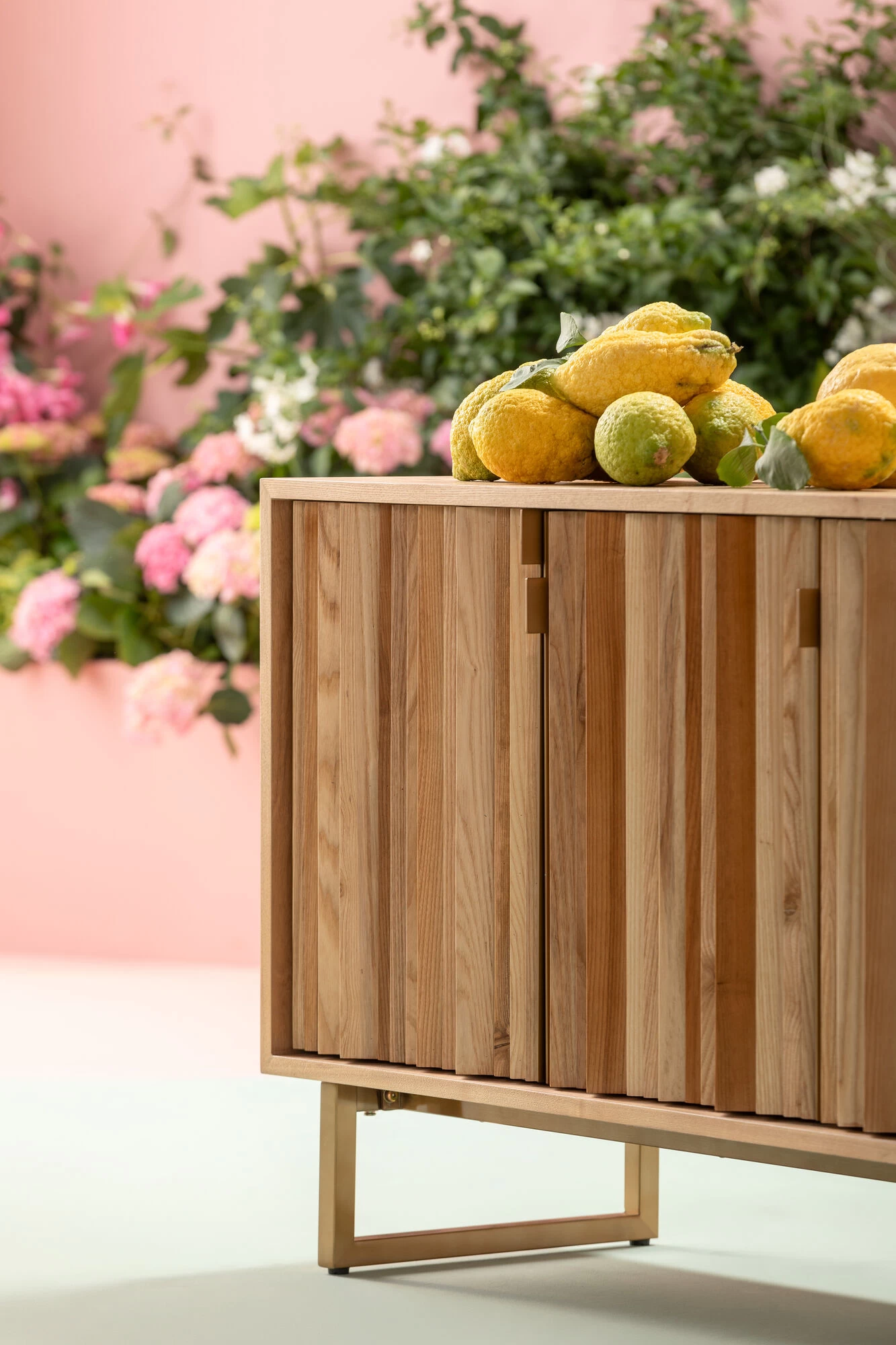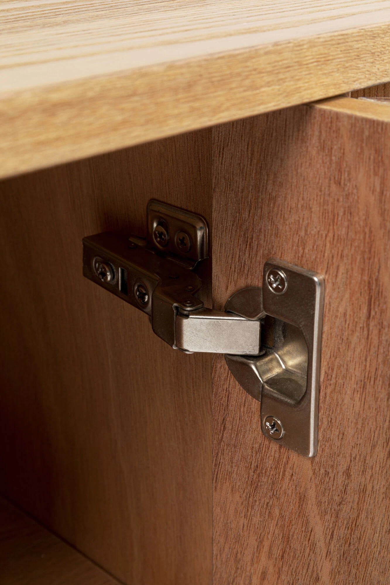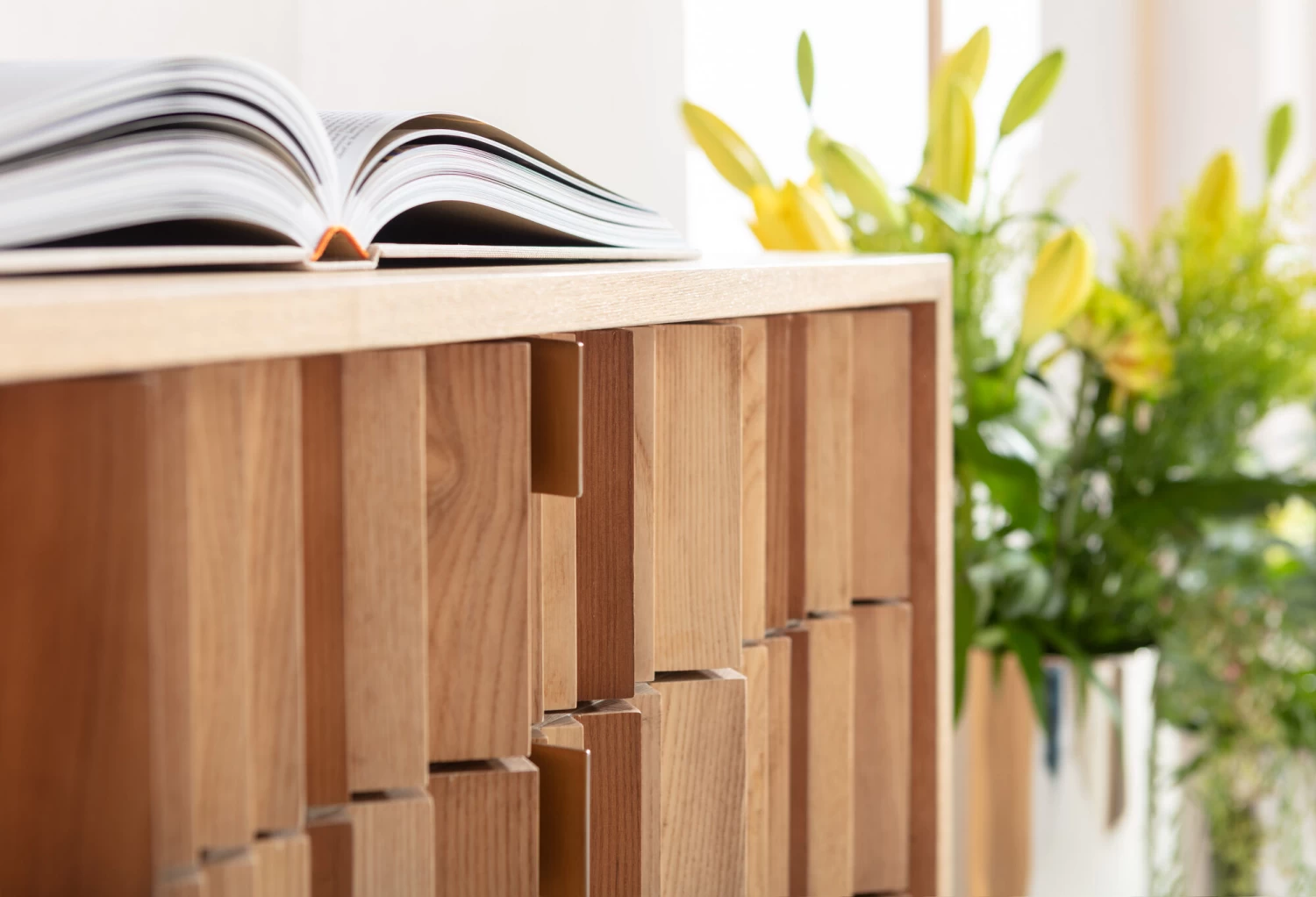 - Hell-braunes Sideboard aus Esche- Furnierschichtholz mit handgearbeiteter Front in natĂĽrlichen Holzfarben