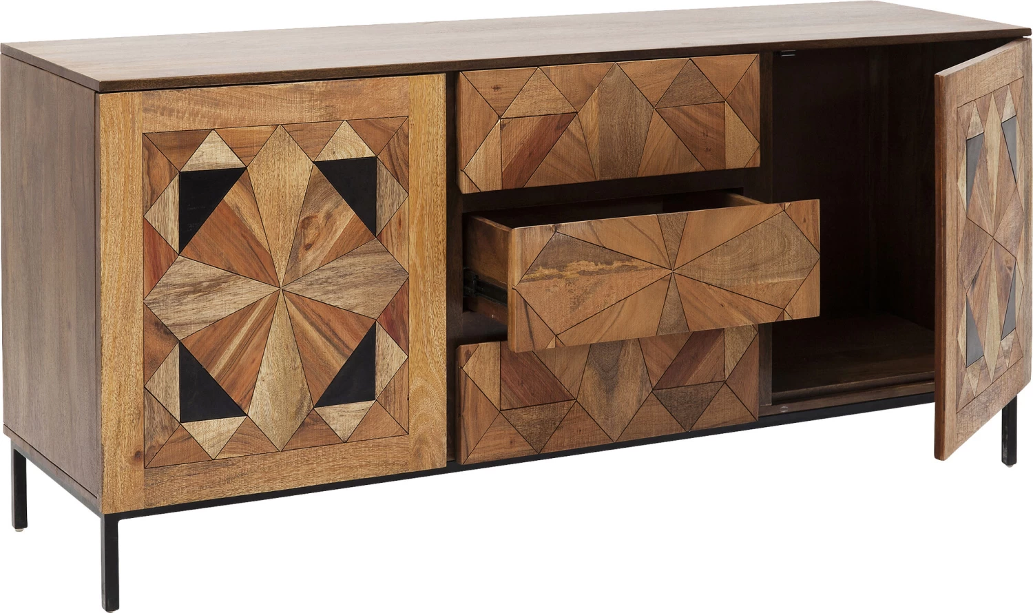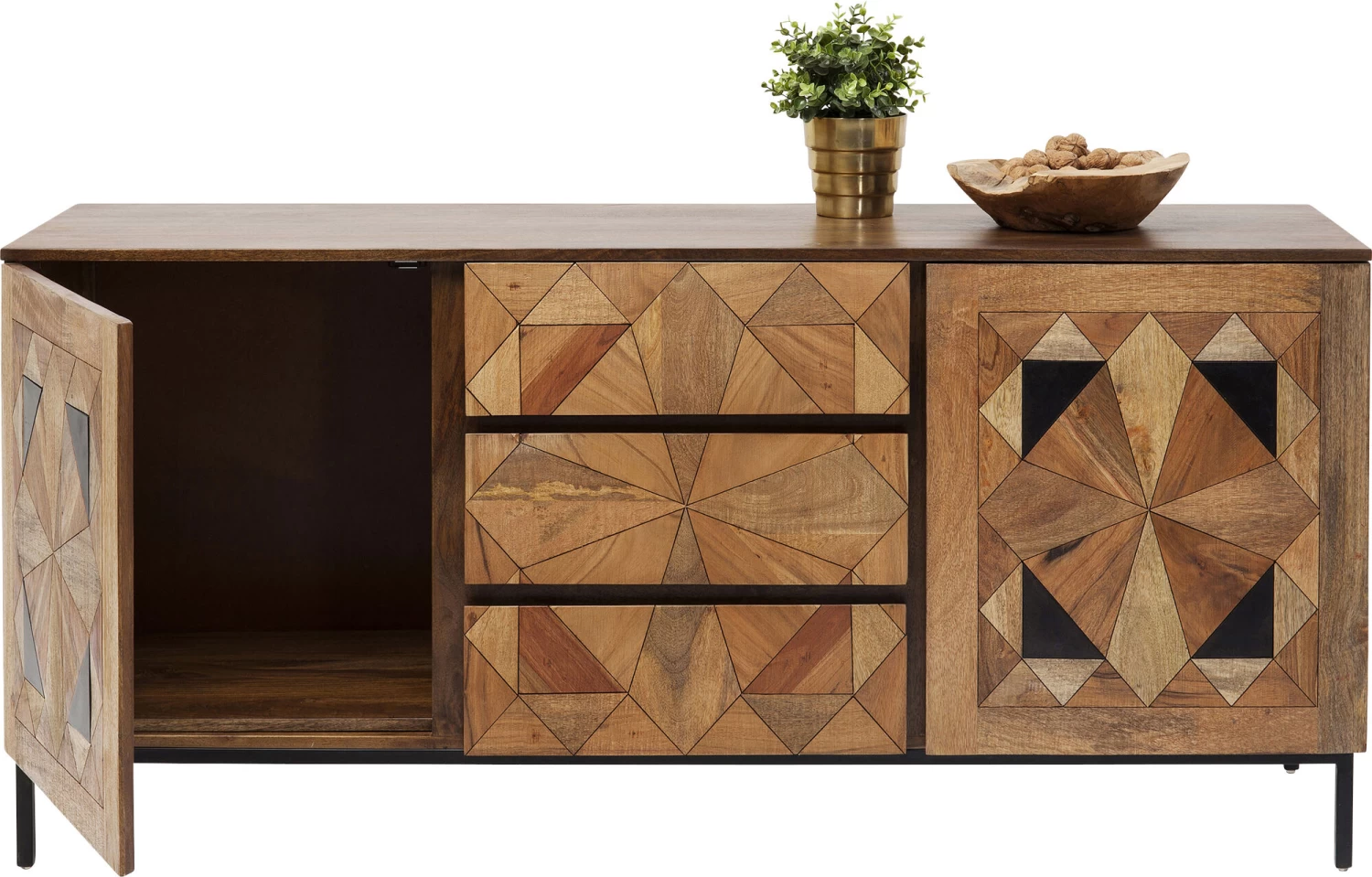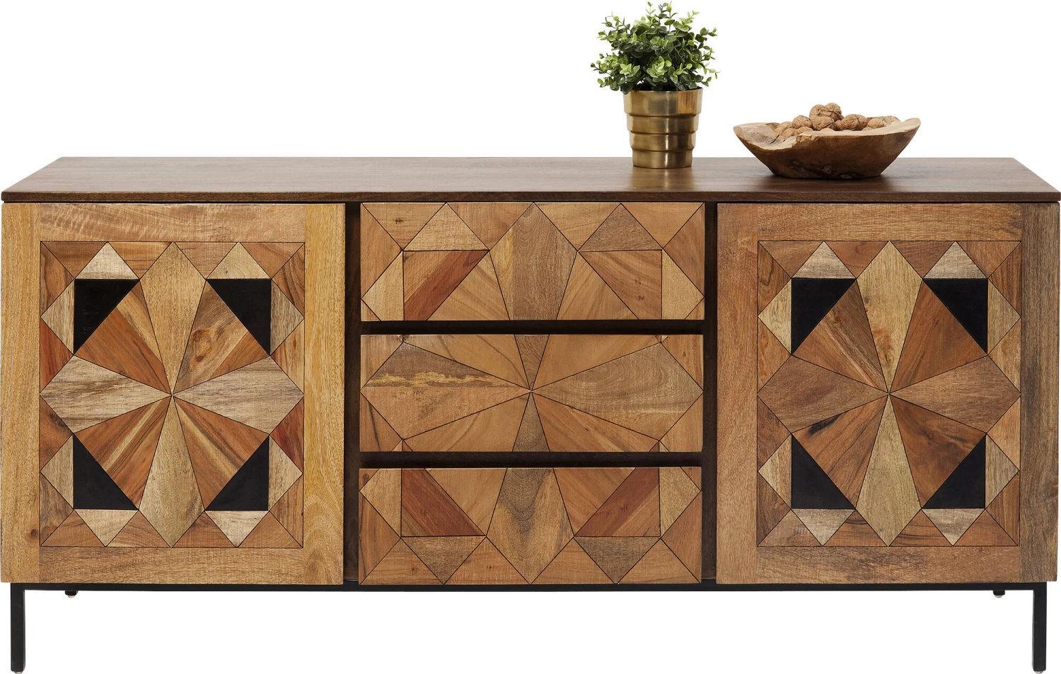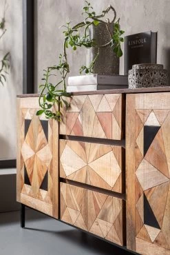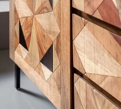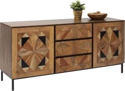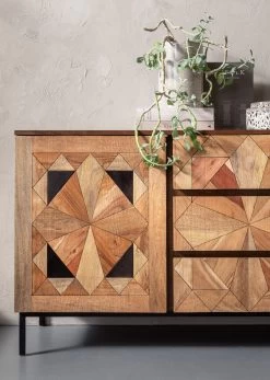 - Bei diesem von Hand gefertigten Sideboard sind die aufwendigen Intarsien und die warmen Holztöne das Geheimnis des edlen Looks
