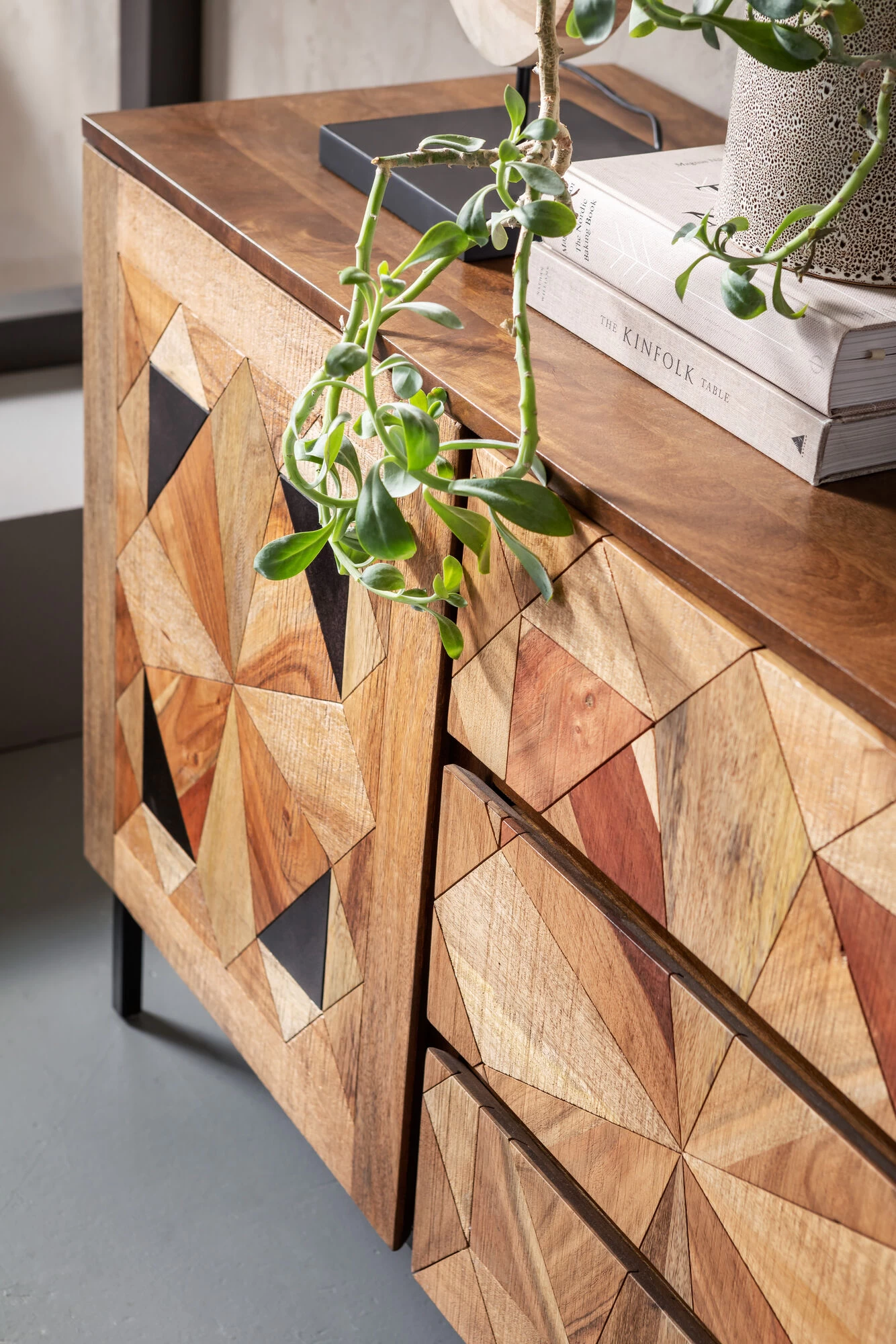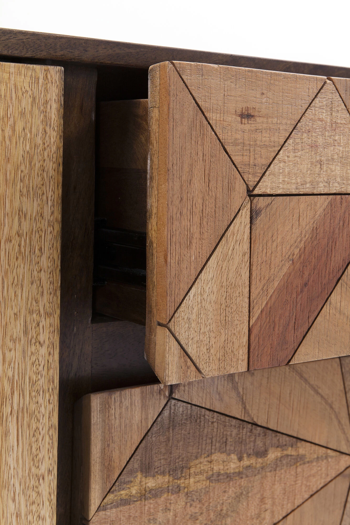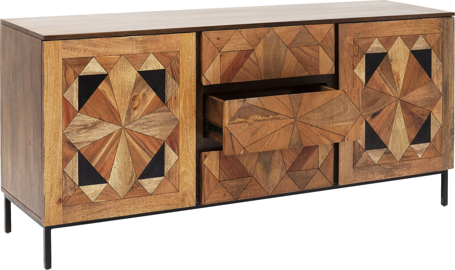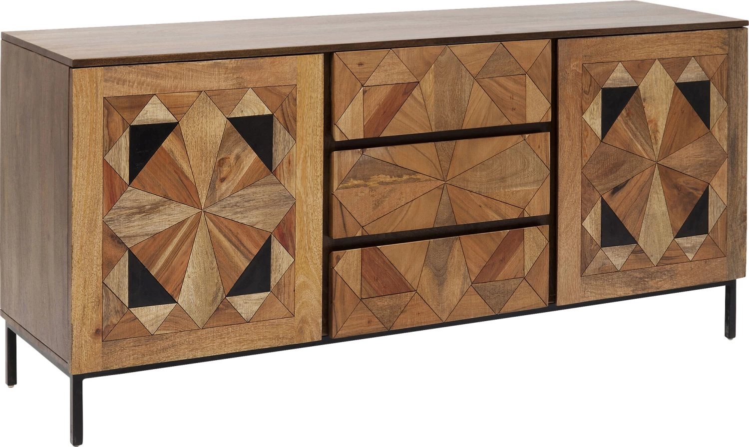 - Bei diesem von Hand gefertigten Sideboard sind die aufwendigen Intarsien und die warmen Holztöne das Geheimnis des edlen Looks