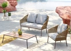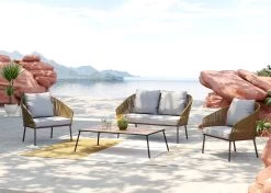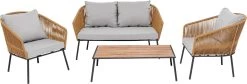 - Outdoor Sitzgruppe in Grau und Natur, vierteilig mit Zweisitzer-Sofa, zwei Sesseln, rechteckigem Couchtisch inklusive Kissen